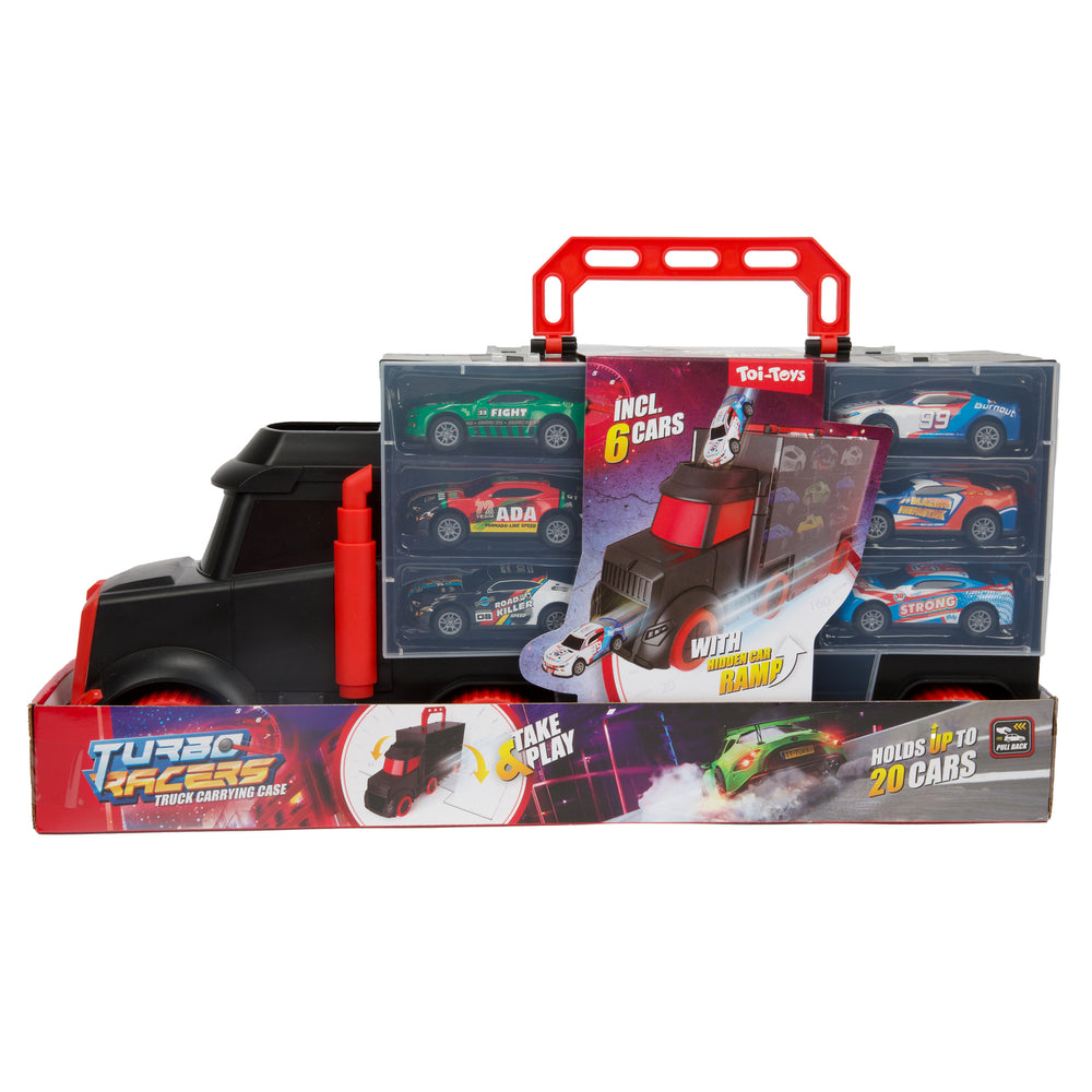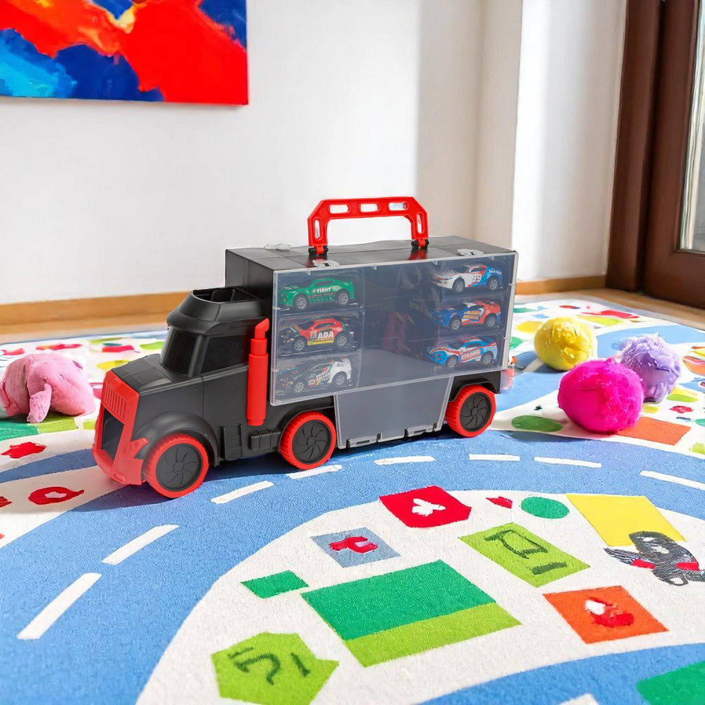 - Bereit für spannende Rennabenteuer? Unser Autotransporter Koffer mit 6 Rennwagen ist genau das Richtige für kleine und große Rennfahrer. Mit diesem LKW Spielzeug kannst du deine Lieblings-Rennwagen überallhin mitnehmen und sie rasant über die Schanze flitzen lassen. Die perfekte Kombination aus Action und Transport!