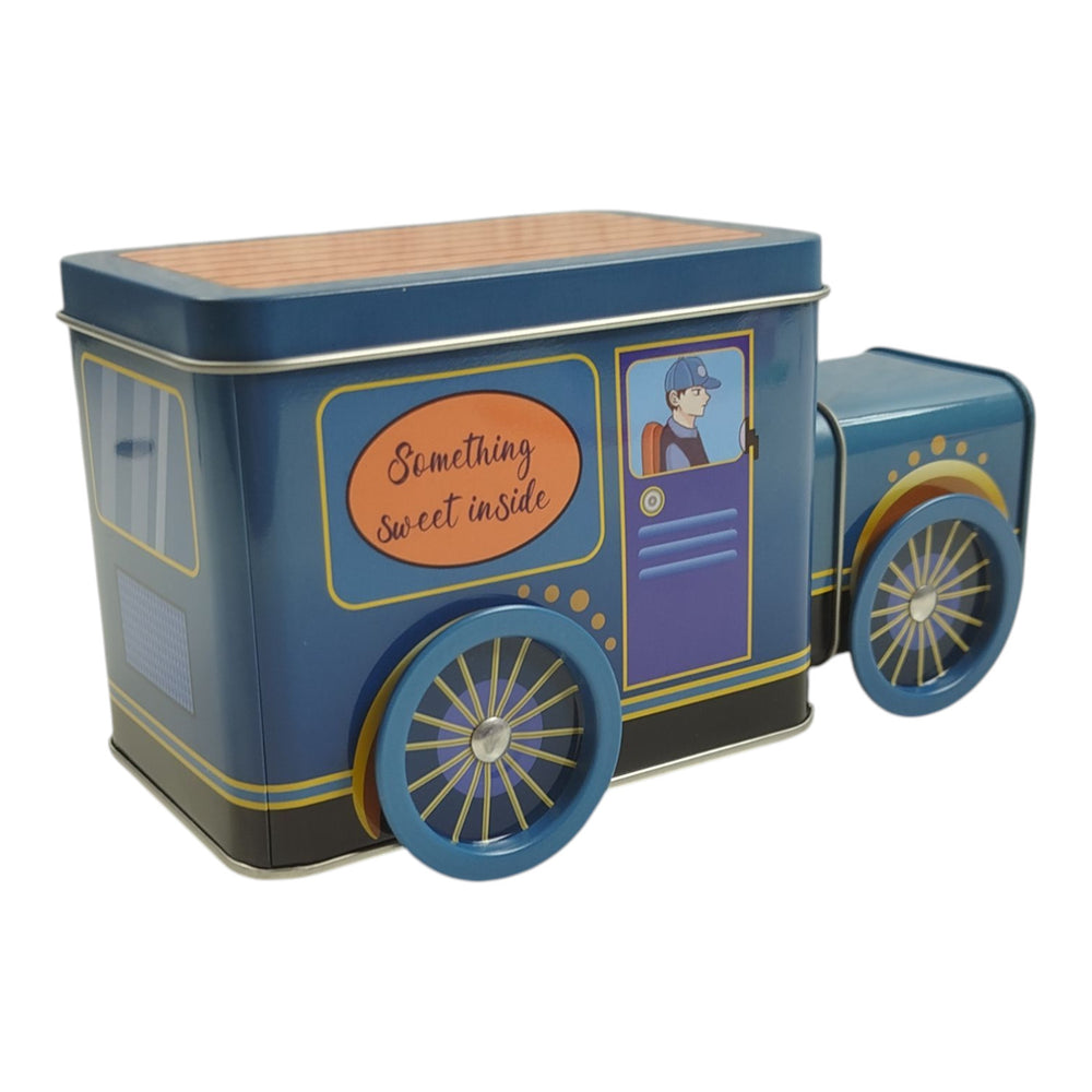 - Diese charmante Metalldose im Look eines alten Trucks begeistert mit einem verspielten Design in Blau und Schwarz. Zwei stapelbare Fächer bieten Platz für Ihre Lieblingssüßigkeiten. Die drehbaren Räder aus Metall und die aufgemalten Fahrer sorgen für ein authentisches Retro-Feeling. Leicht zugänglich durch die Deckelöffnung oben und vorne!