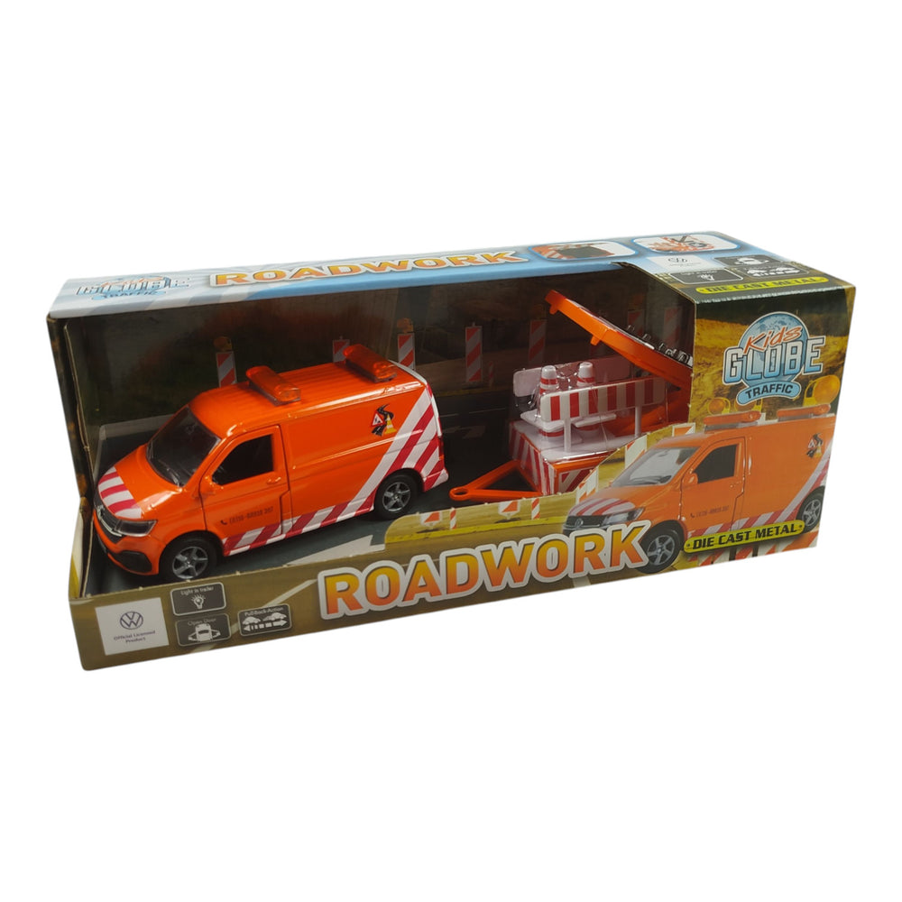 VW Transporter Baustellenfahrzeug Modellauto mit Anhänger, Licht und Zubehör