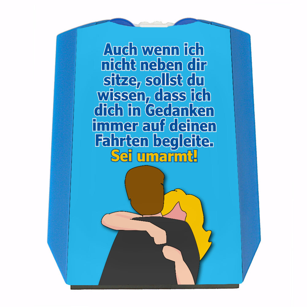 - Die gezeichnete Frau umarmt einen Mann und der Spruch „Auch wenn ich nicht neben dir sitze, sollst du wissen, dass ich dich in Gedanken immer begleite. Sei umarmt!“ erinnert dich an Liebe bei jeder Autofahrt.
