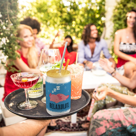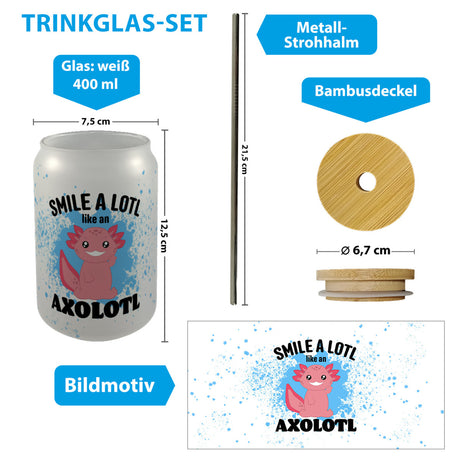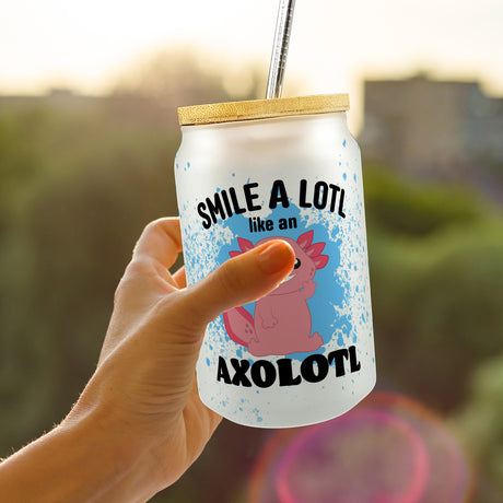 €14,95Grundpreis /Nicht verfügbarAuf LagerAxolotl Trinkglas mit Bambusdeckel mit Spruch Smile a lotl like an Axolotl