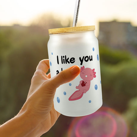 Axolotl Trinkglas mit Bambusdeckel mit Spruch I like you a lotl