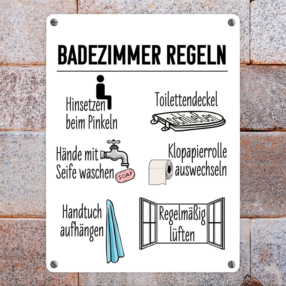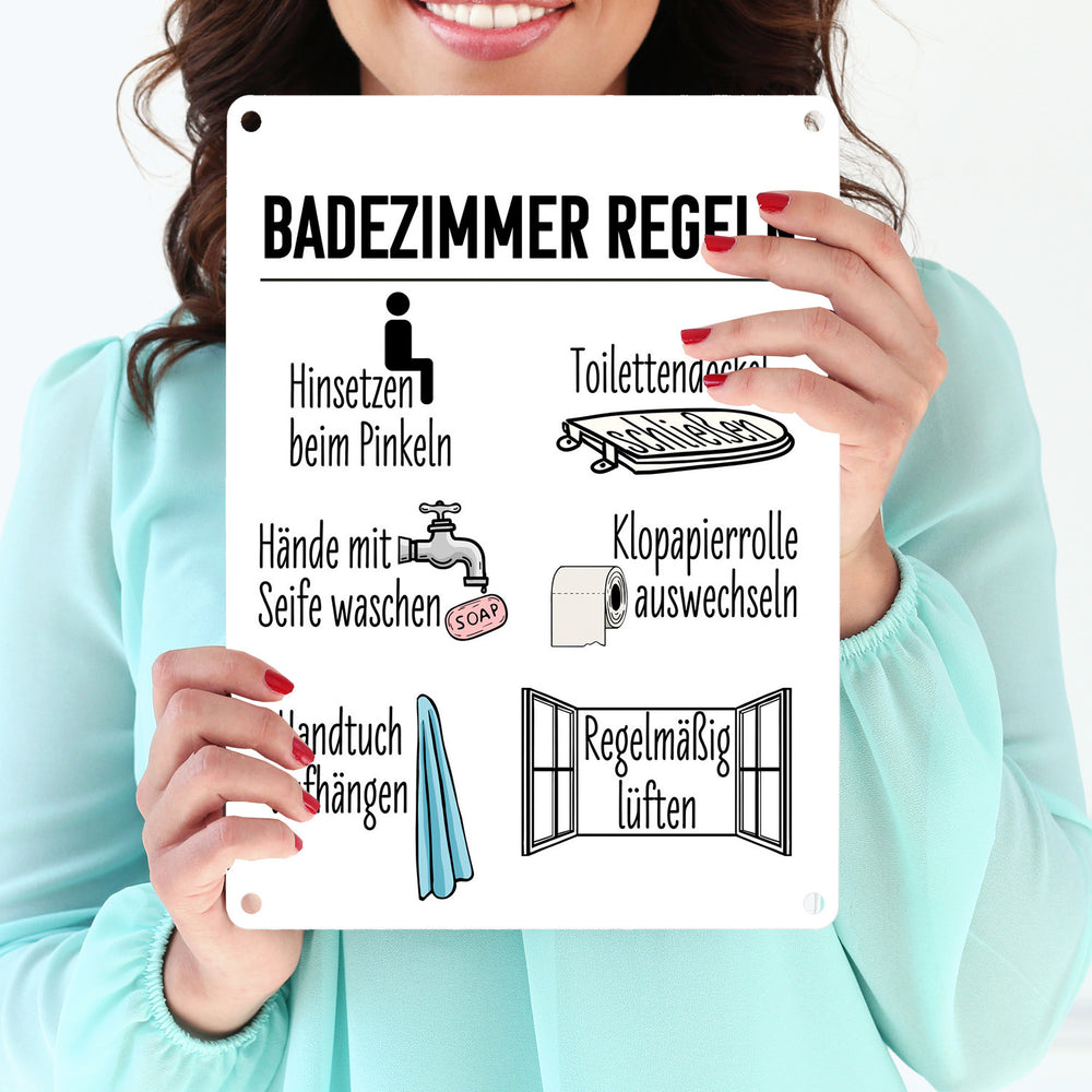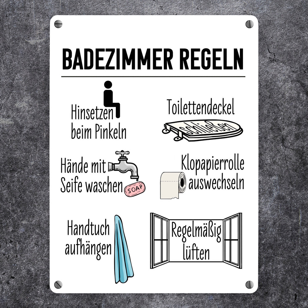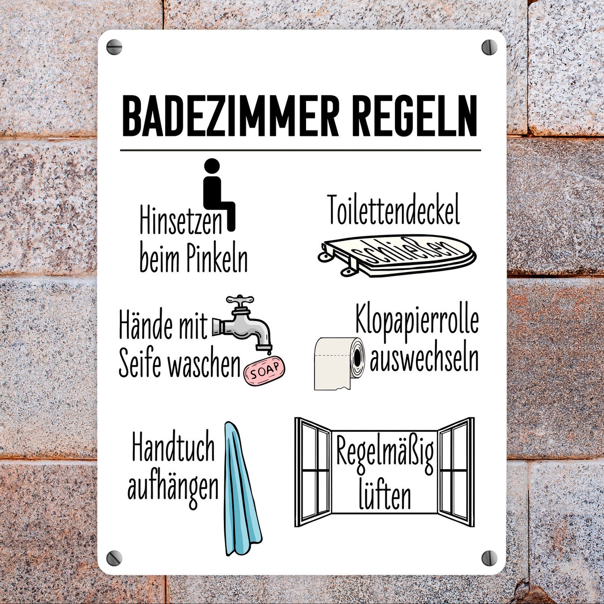 - Du willst dein Bad sauber halten und suchst nach einem einfachen Weg, Badezimmer Regeln in deinem Zuhause einzuführen? Dann ist dieses Metallschild wie für dich gemacht. Das Schild zeigt die wichtigsten Regeln, die im Badezimmer gelten.
