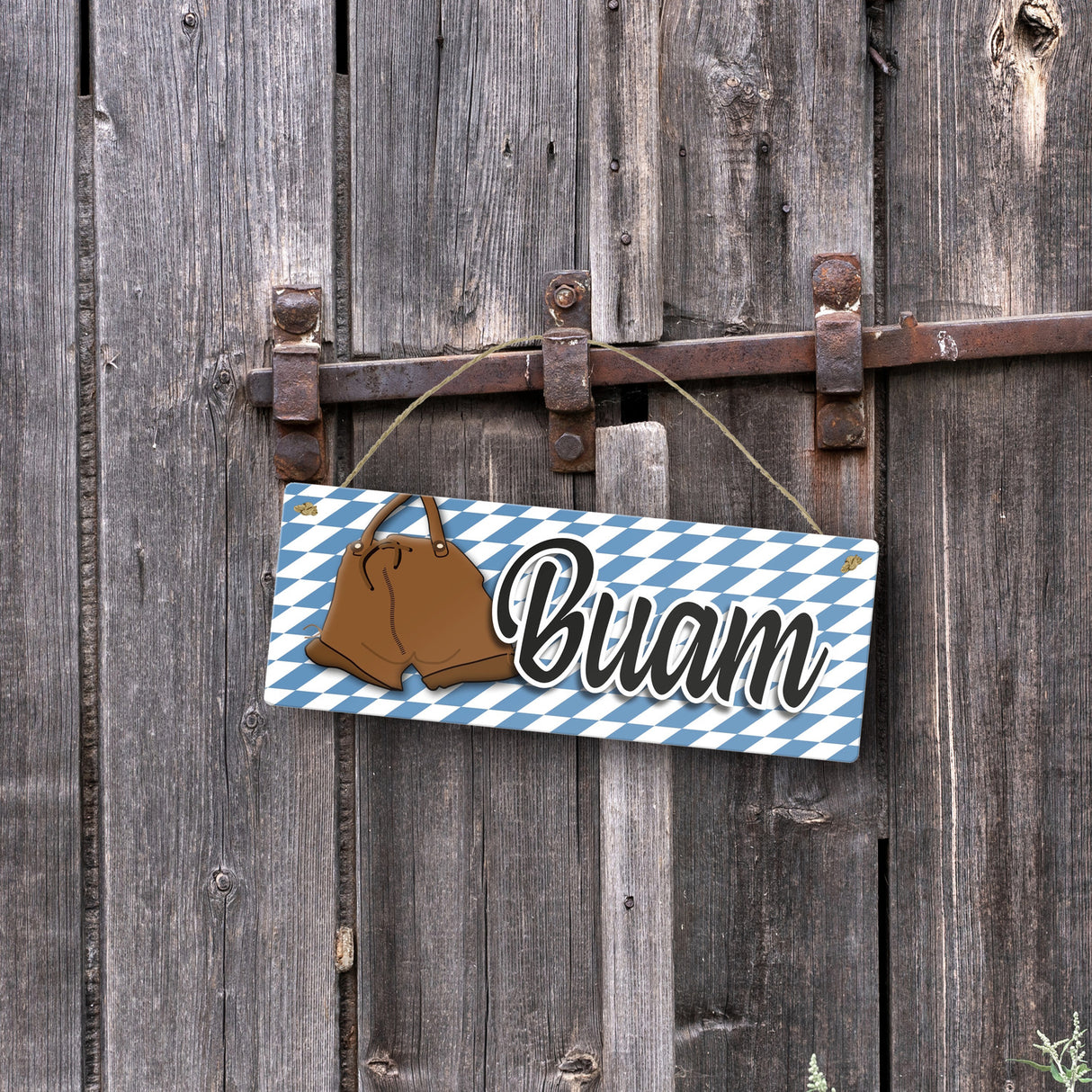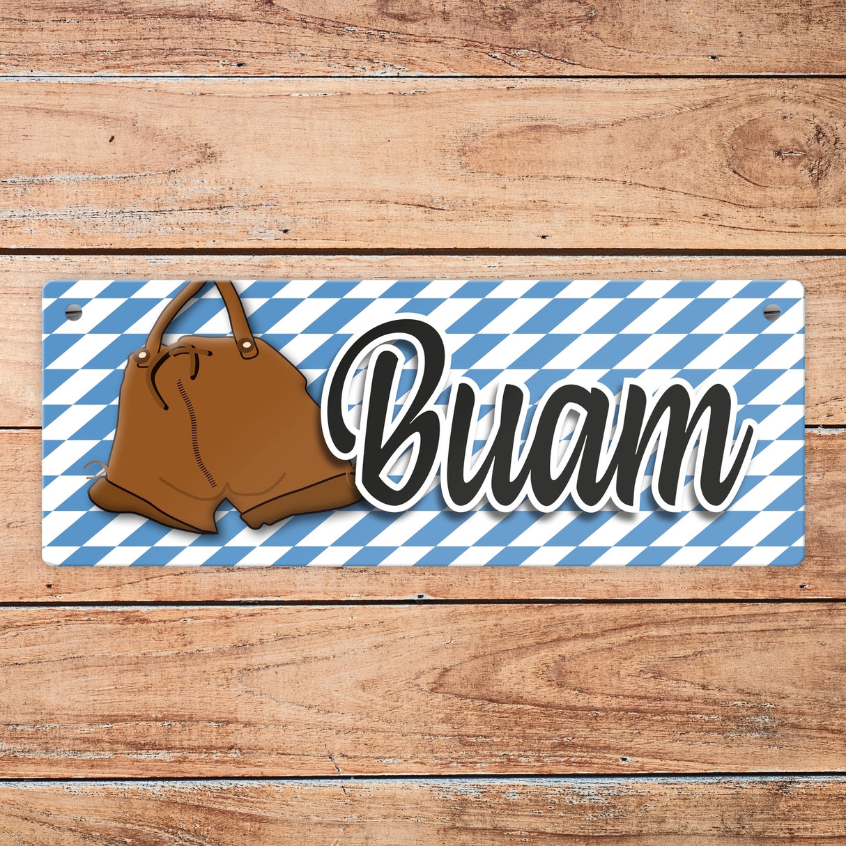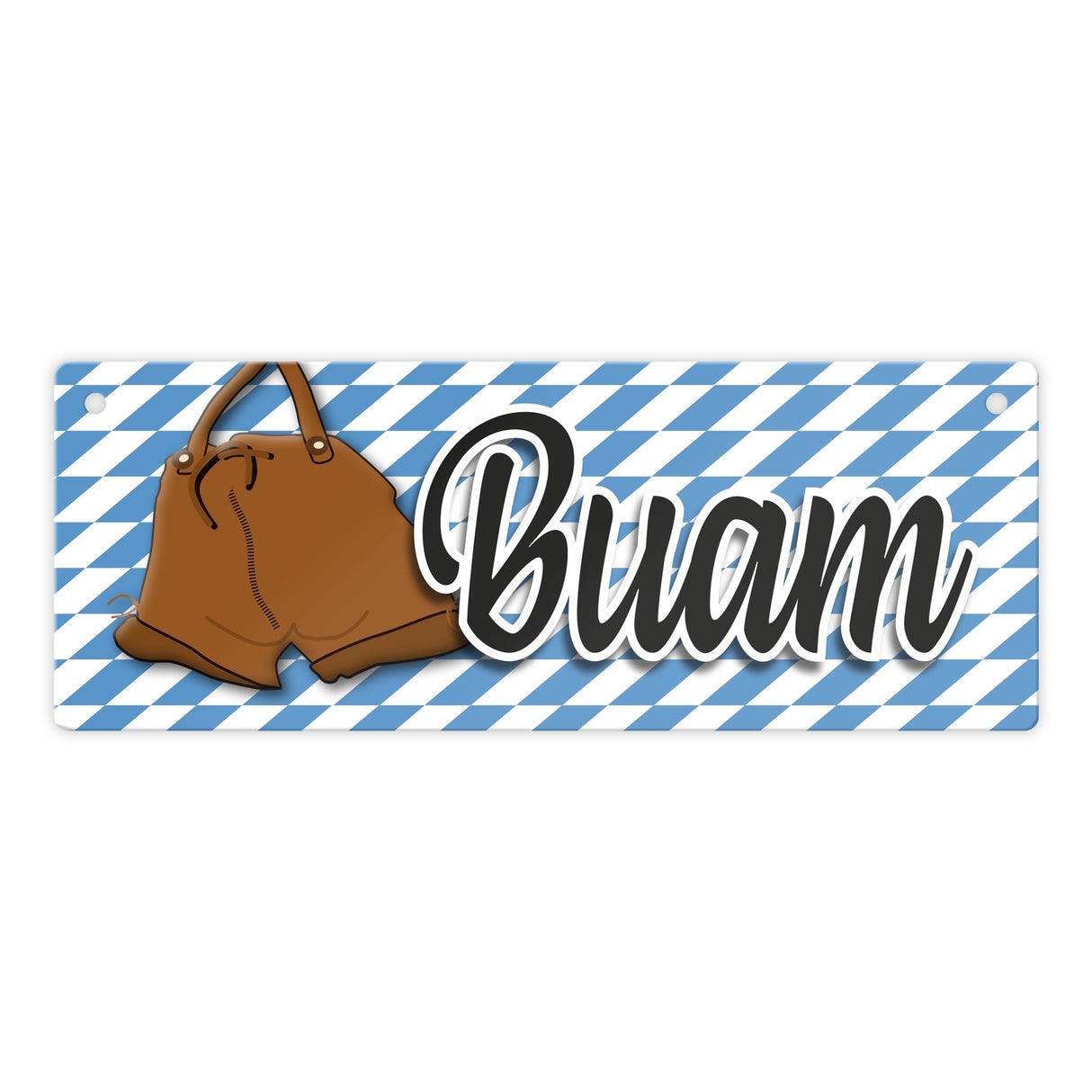 - Witziges Metallschild für echte Buam! Dieses Toilettenschild bringt den bayerischen Charme direkt ins Badezimmer. Mit dem originellen Design einer kurzen braunen Lederhose und dem bayrischen Wort "Buam" ist Lachen garantiert.