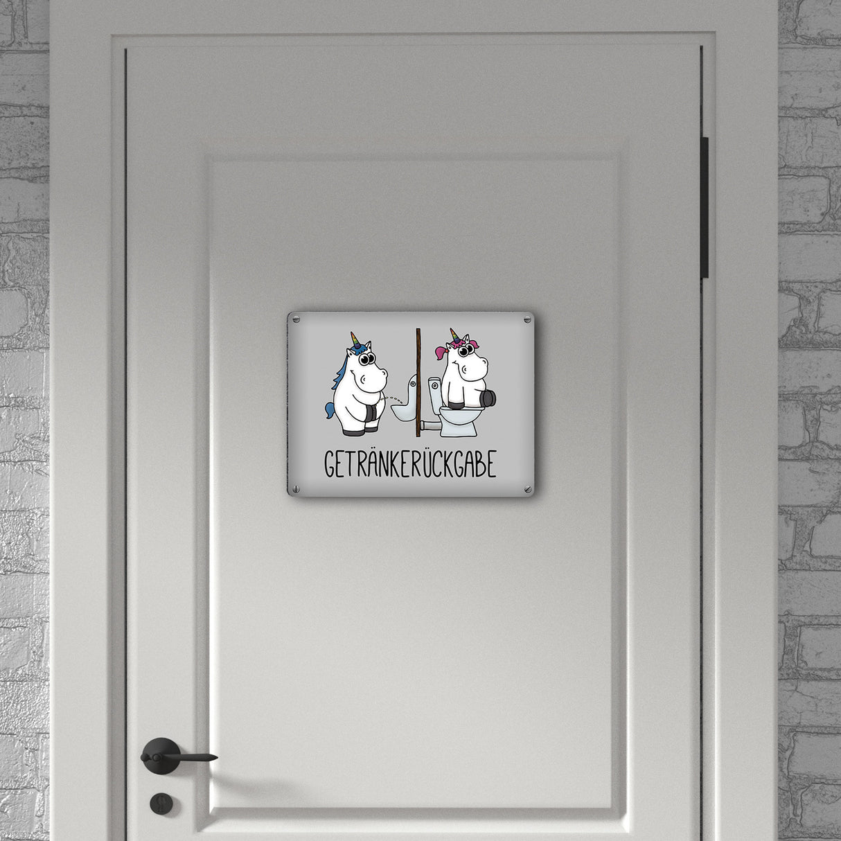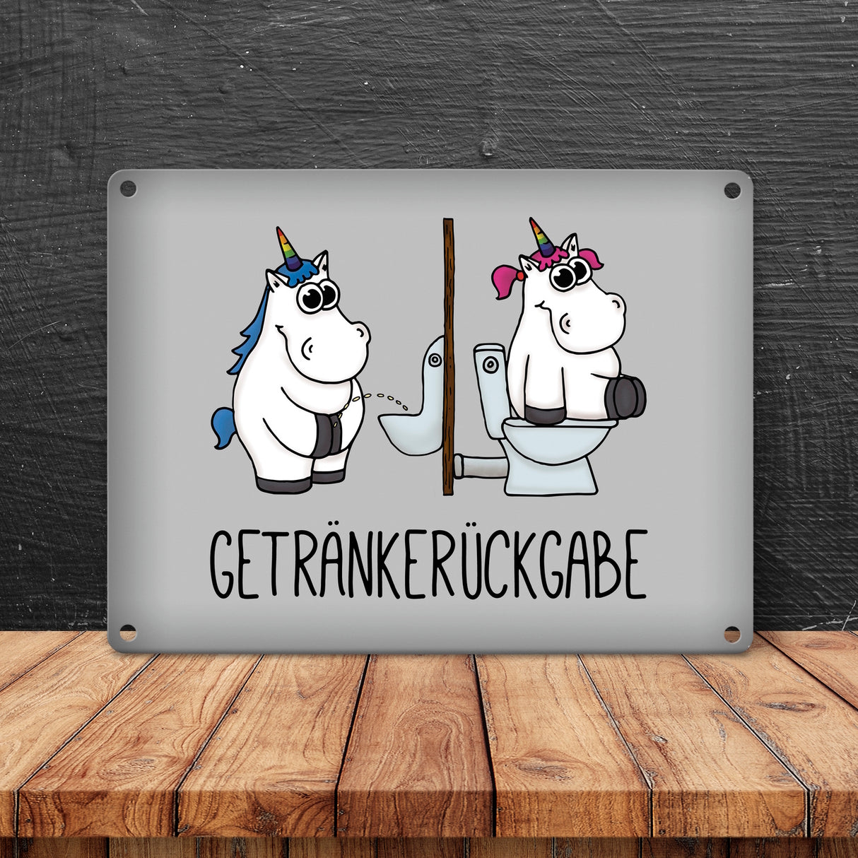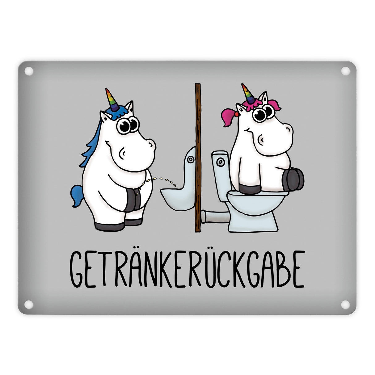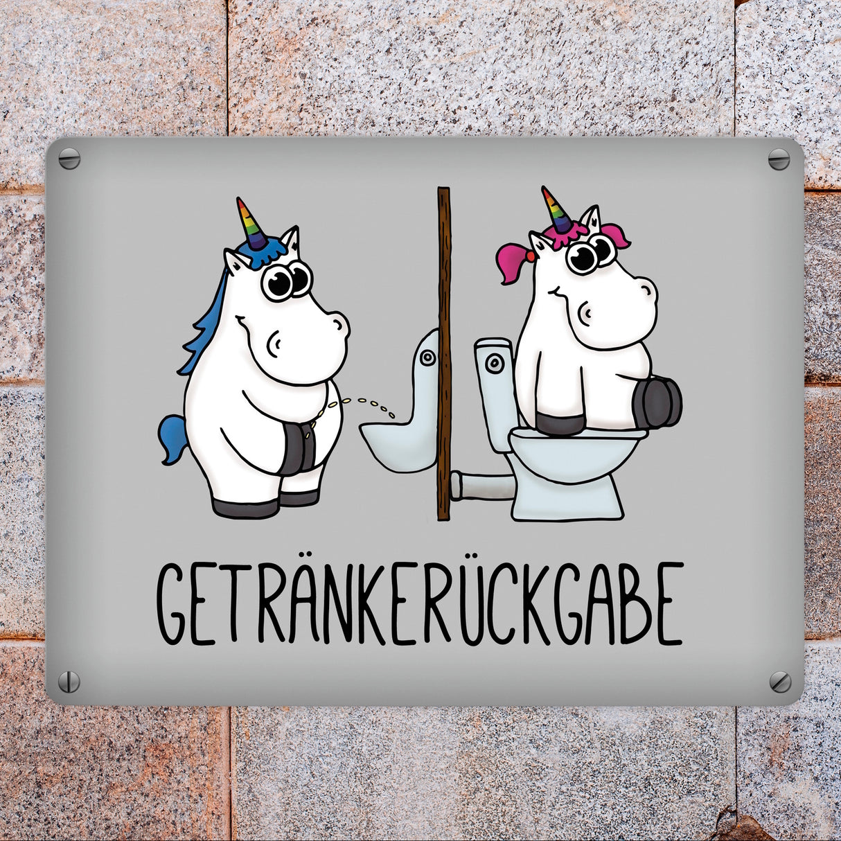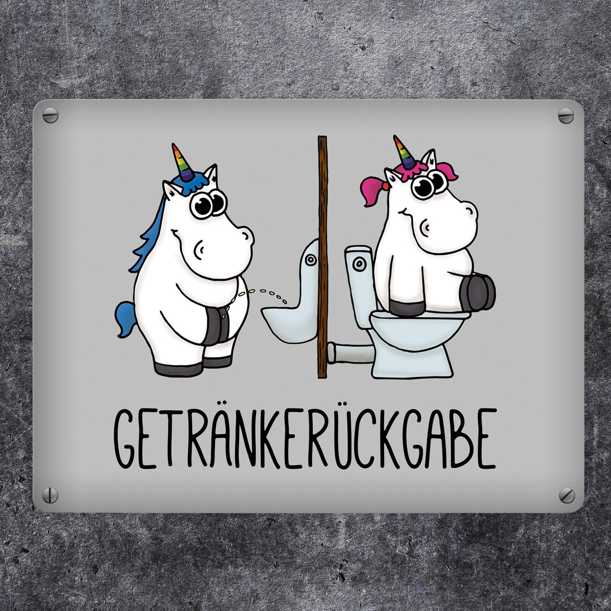 Toilettenschilder müssen nicht nur schlichte Strichzeichnungen von Mann und Frau sein, sondern können auch individuell und lustig gestaltet sein. So gibt das Einhorn Getränkerückgabe Metallschild jedem etwas beim Toilettengang zu schmunzeln. Hinweise: Material: Aluminium / Dicke: 0,5 mm