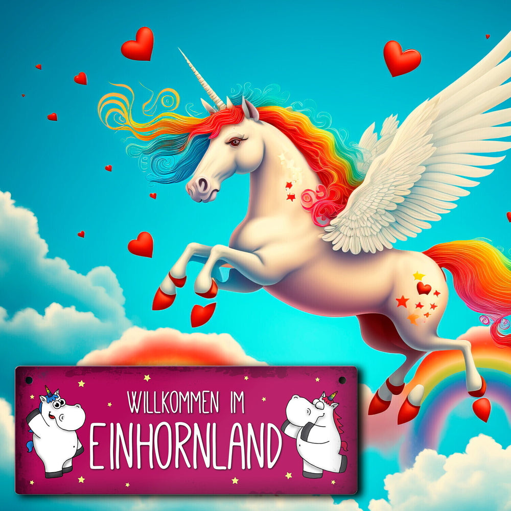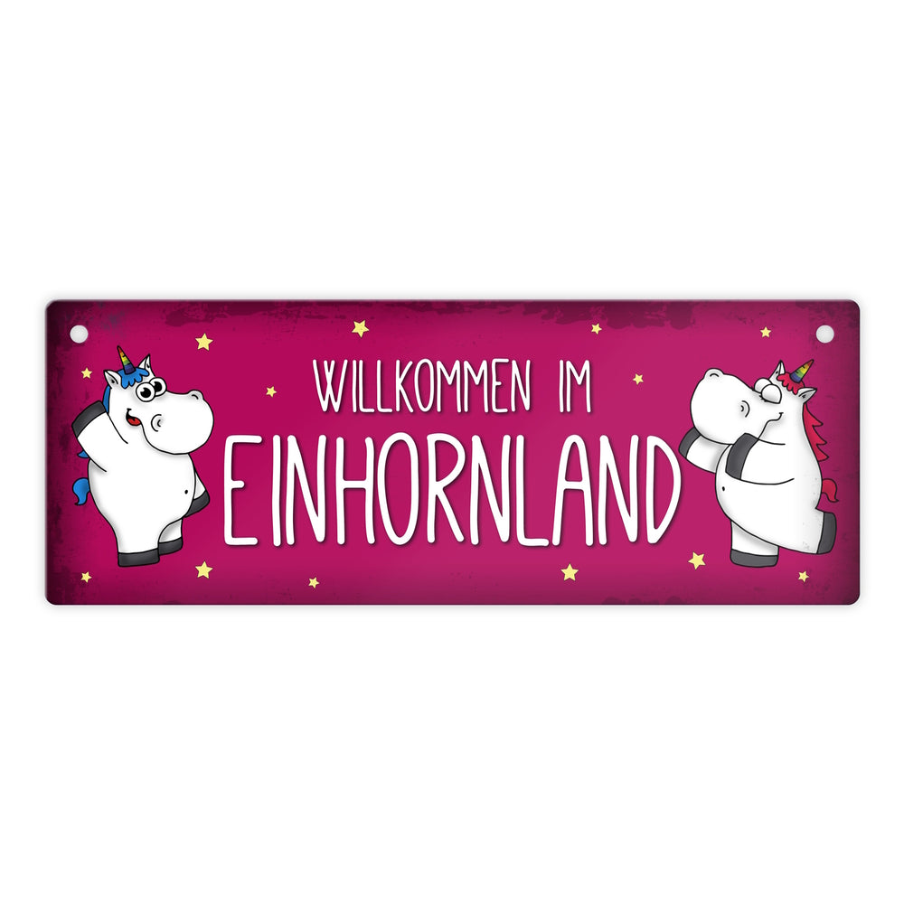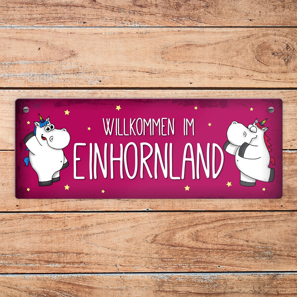 Honeycorns Metallschild mit Einhorn Motiv und Spruch: Willkommen im Einhornland