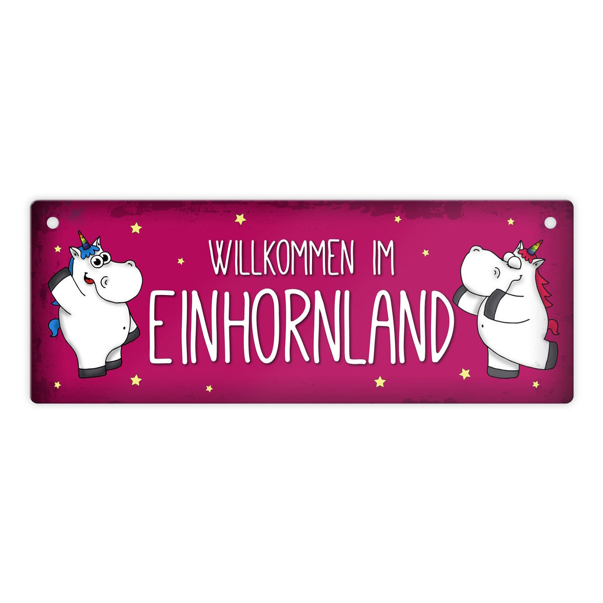 • Lieferumfang: Honeycorns Metallschild mit Einhorn Stadtschild Motiv und Spruch: Willkommen im Einhornland