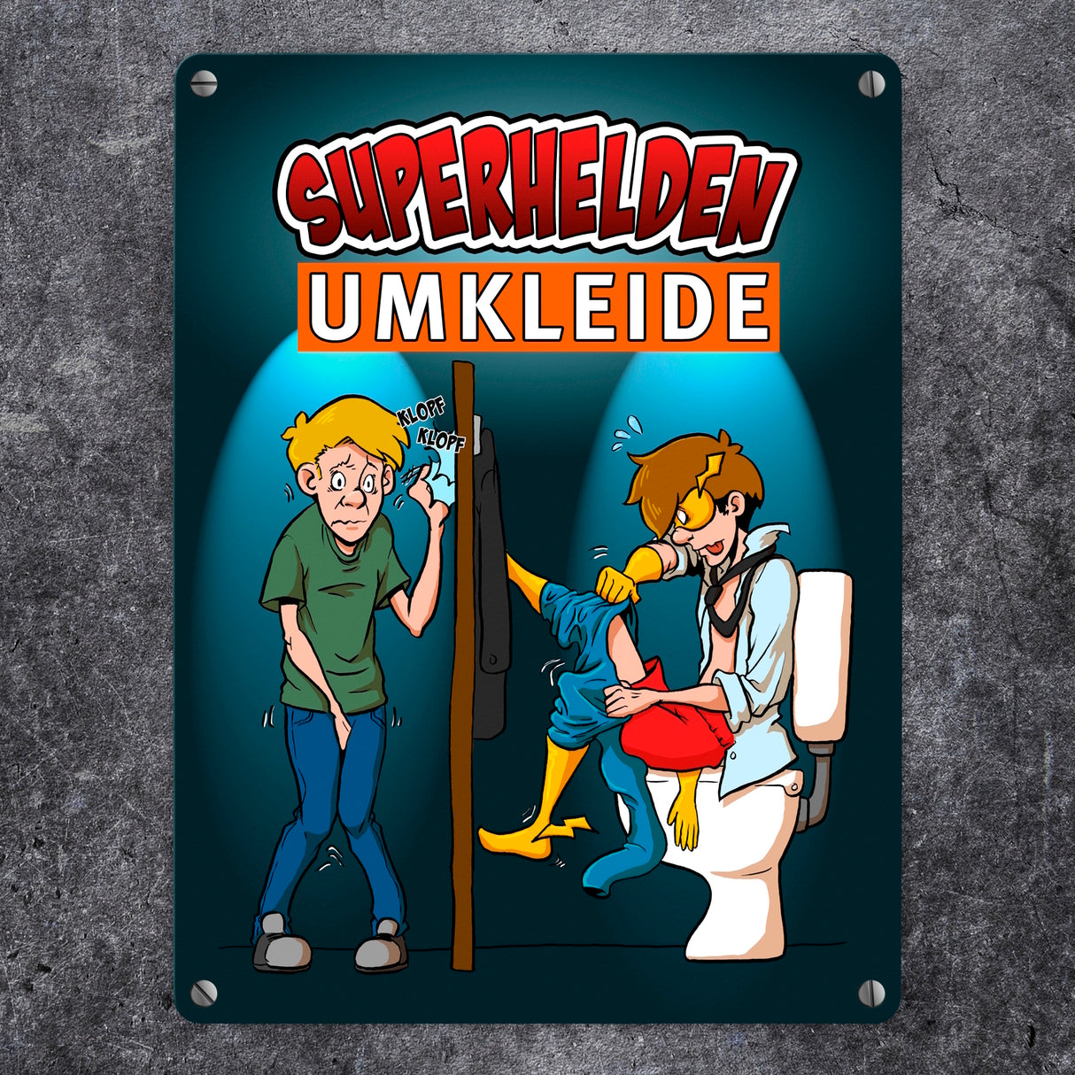 - 1x Metallschild mit lustigem Comic-Design für Toiletten - Superhelden-Umkleide in der gewählten Größe