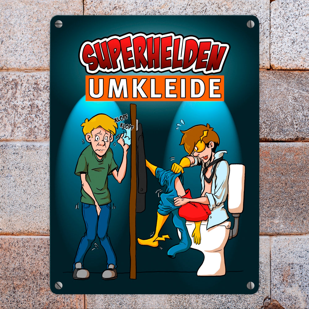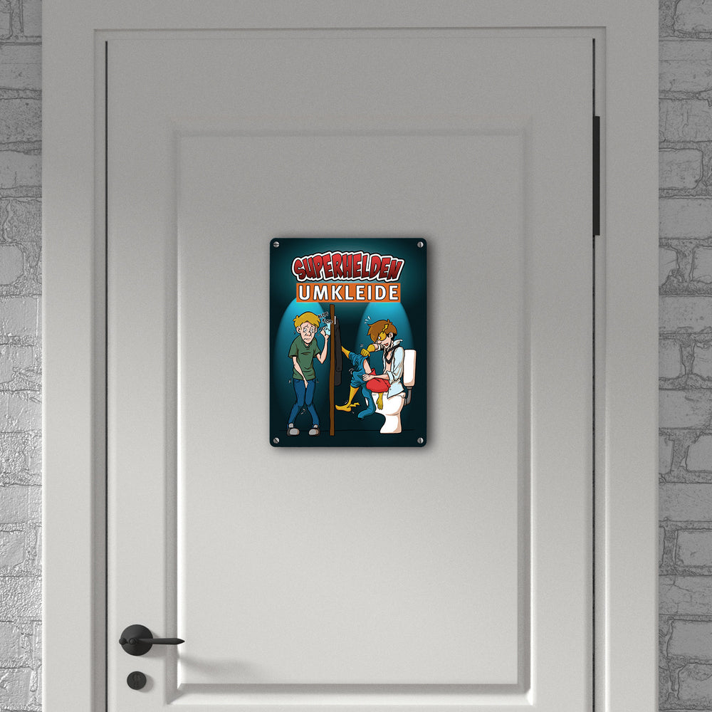 Metallschild mit lustigem Comic-Design für Toiletten - Superhelden-Umkleide