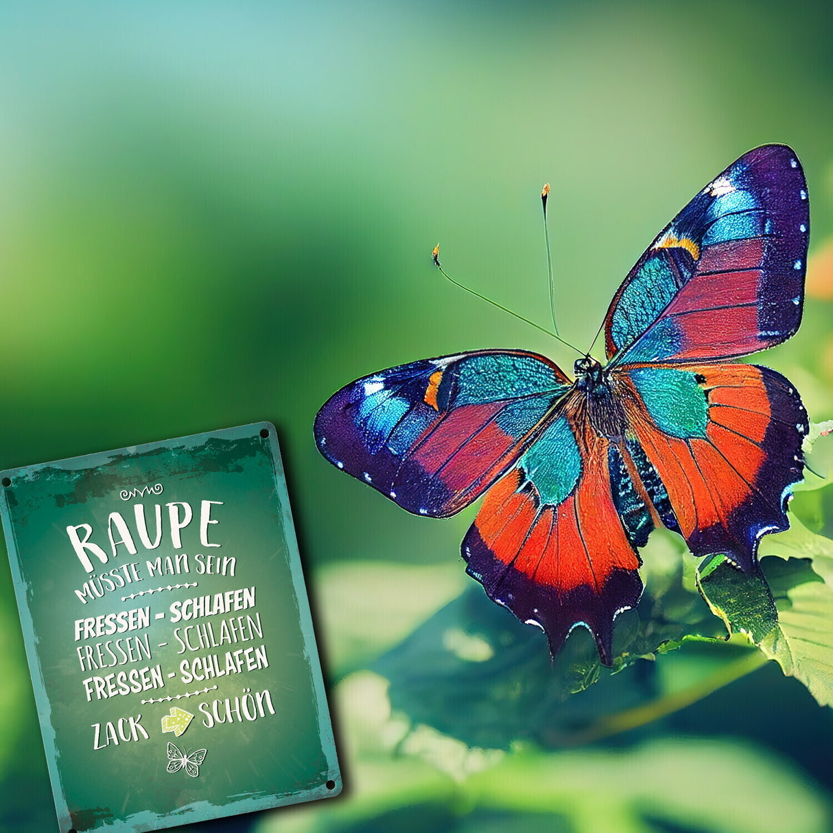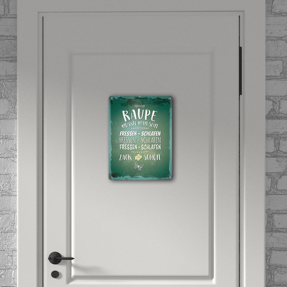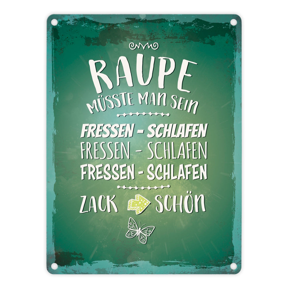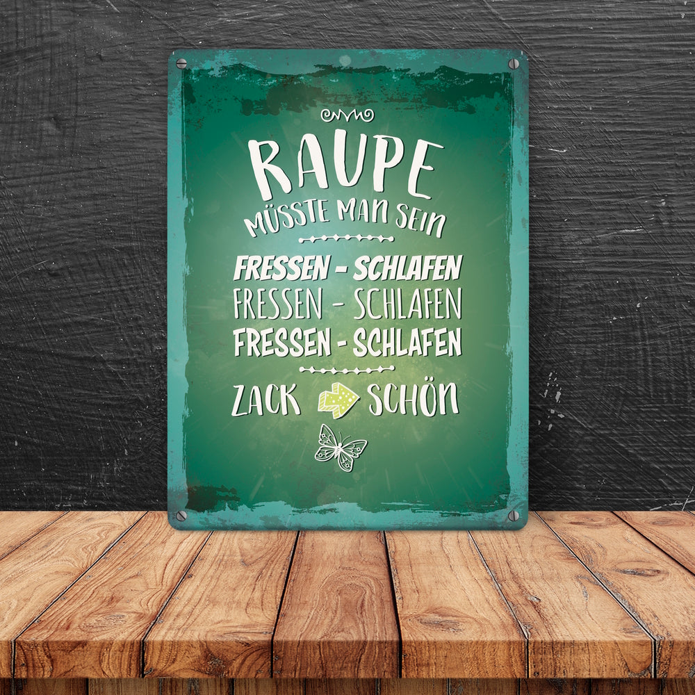 - 1x Metallschild mit Spruch: Raupe müsste man sein. Fressen ... in der gewählten Größe