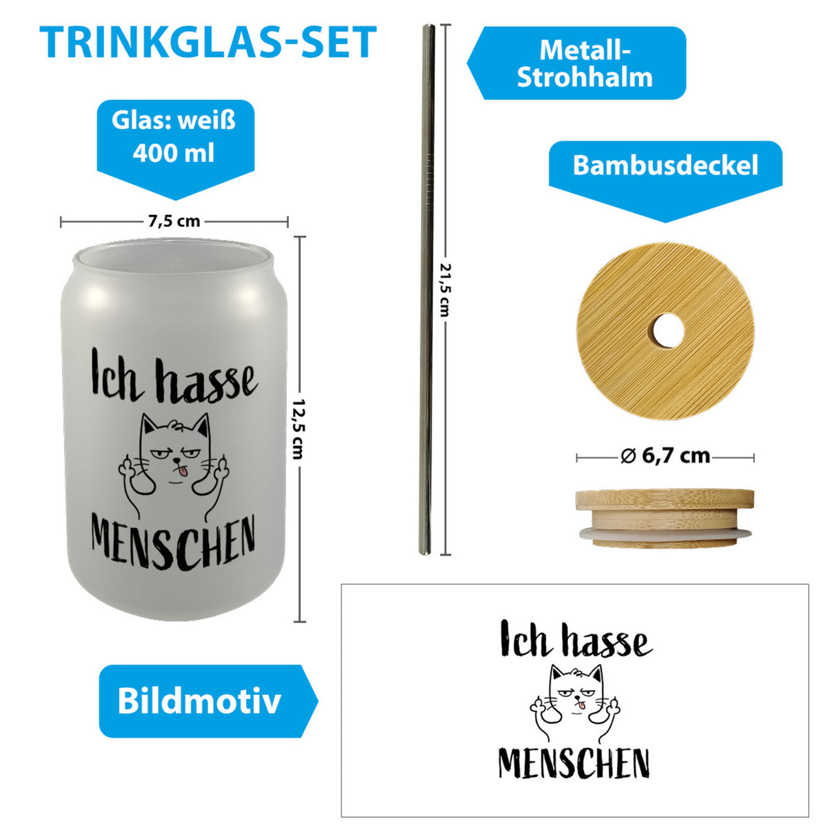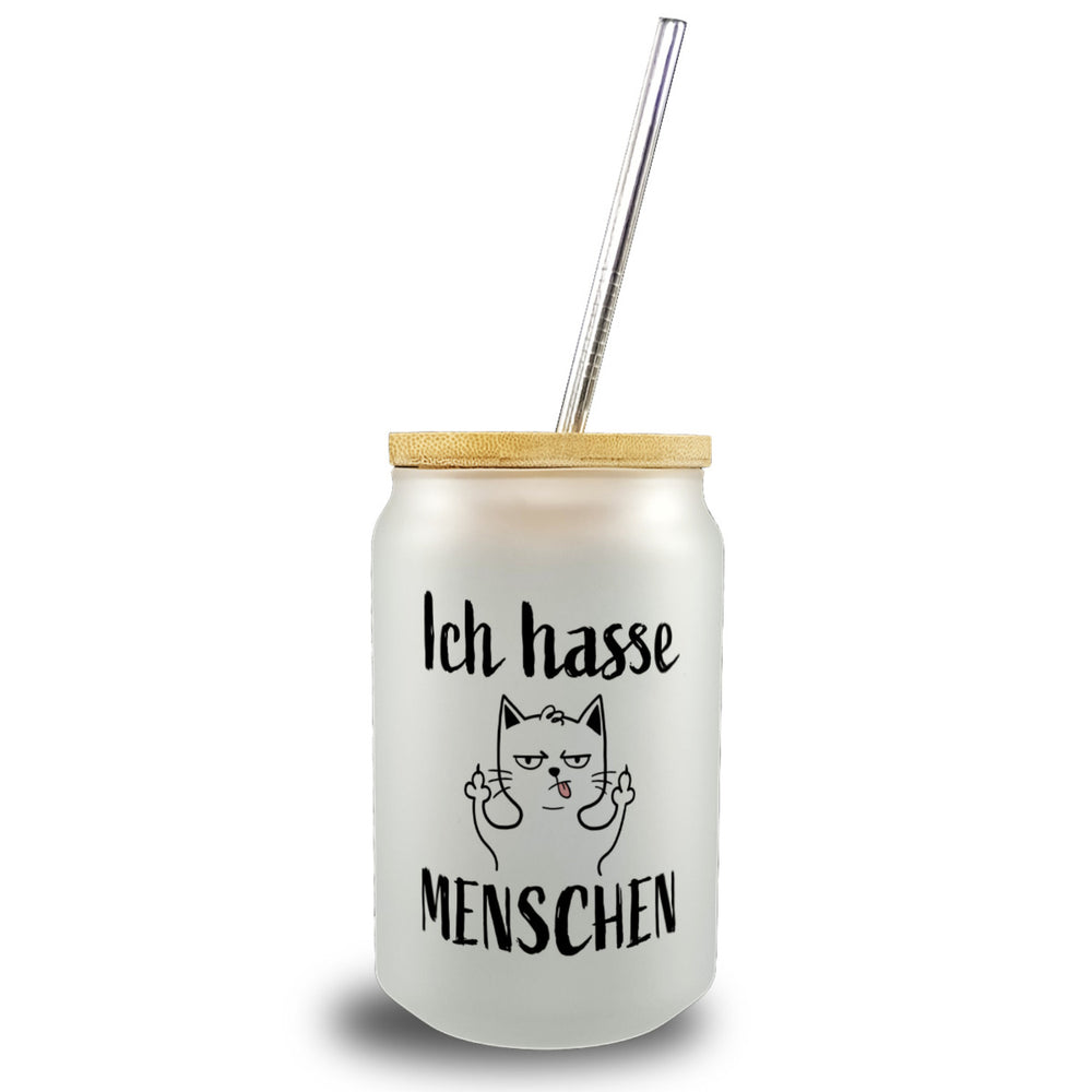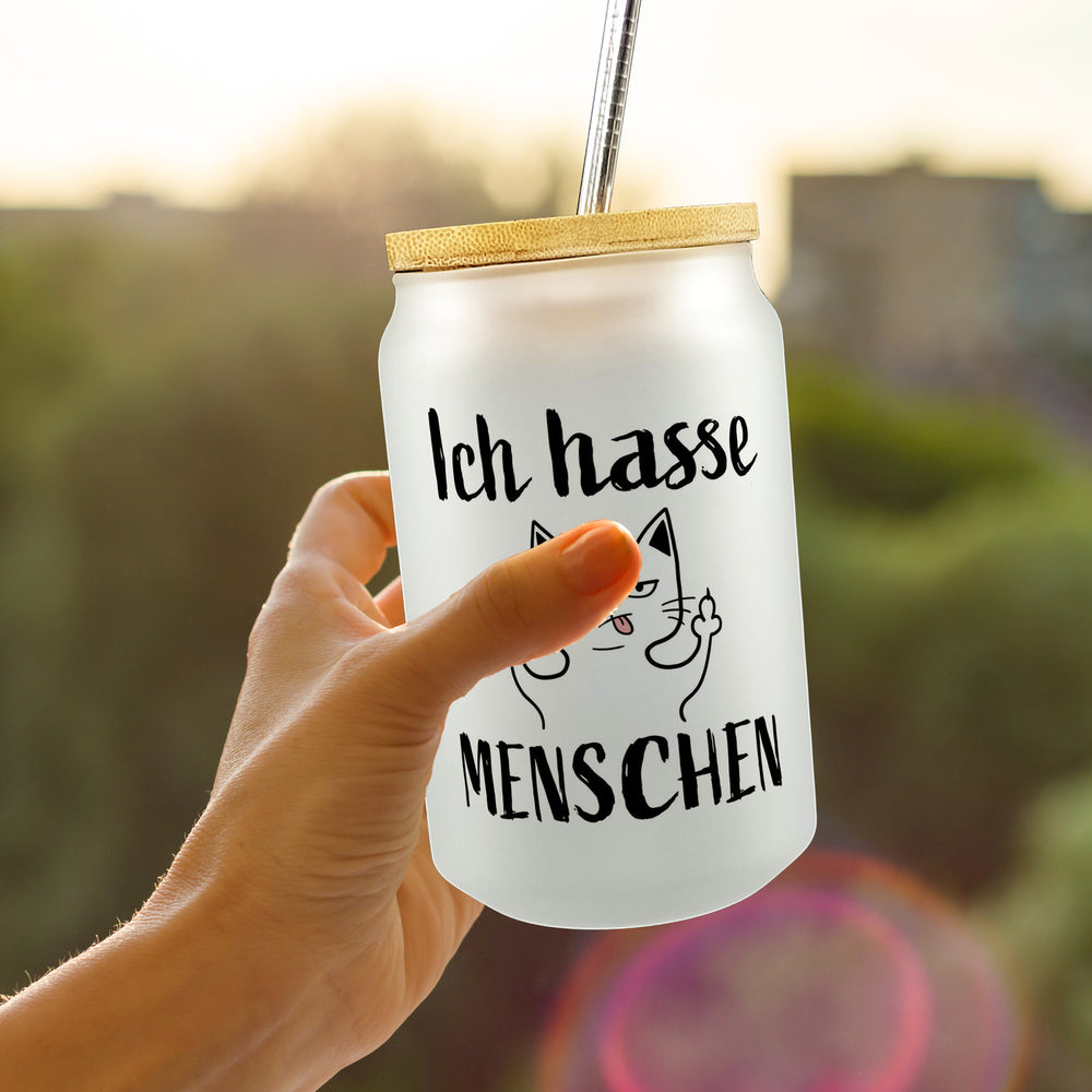 Mittelfinger Katze Trinkglas mit Bambusdeckel mit Spruch Ich hasse Menschen