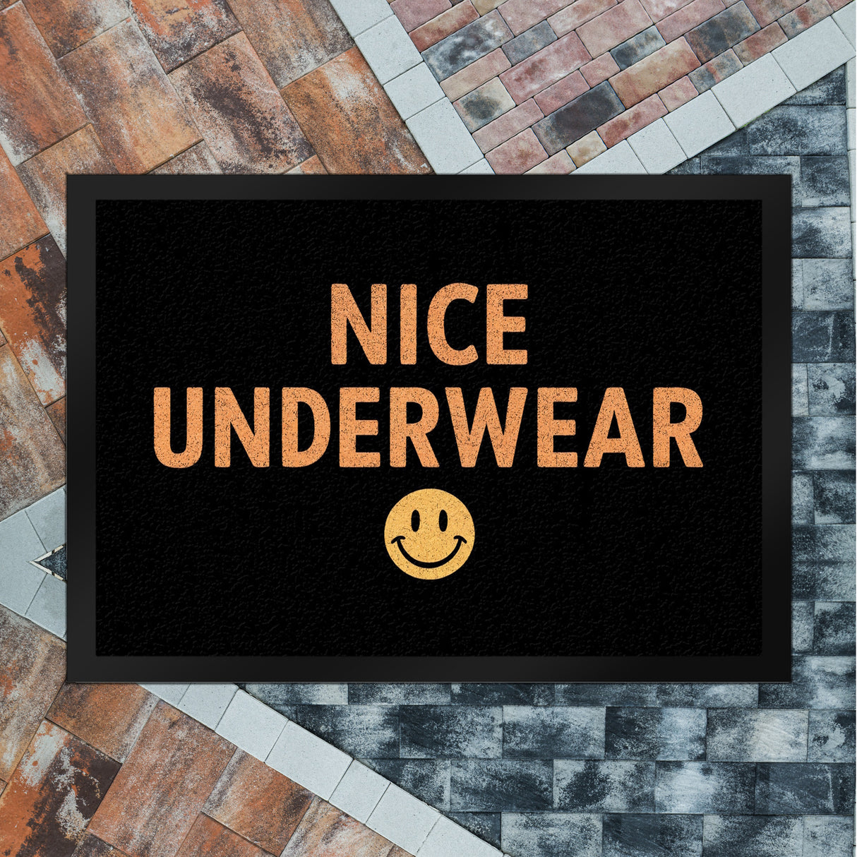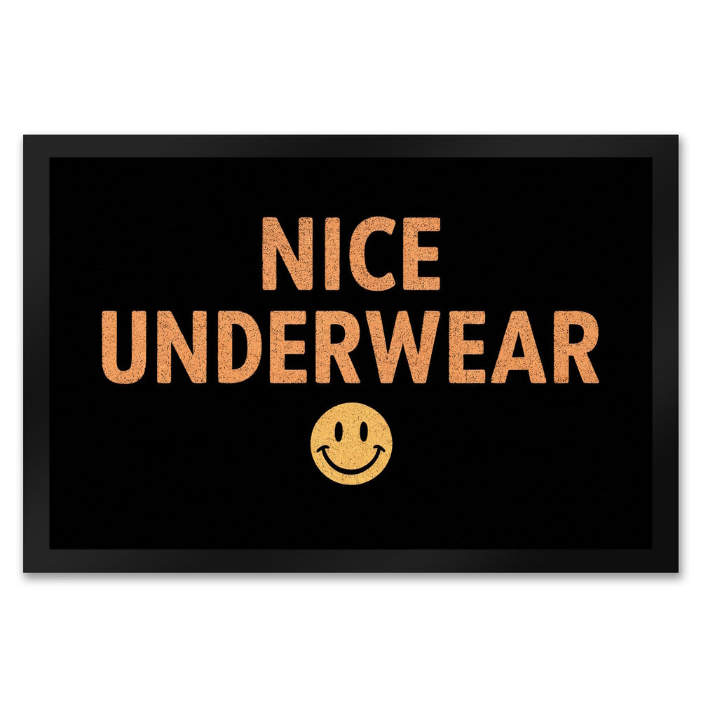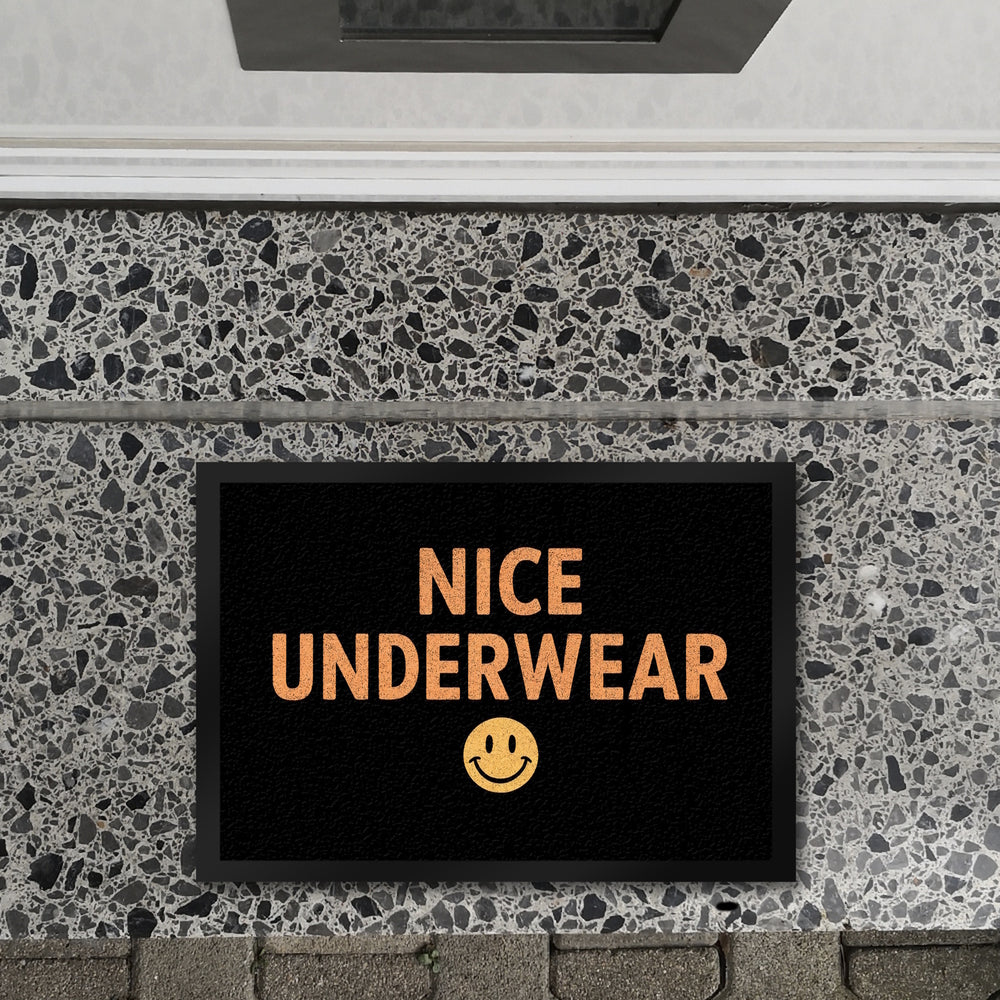 - Diese lustige Fußmatte bringt unglaublich viel Humor an jede Haustür! Mit einem schlichten schwarzen Hintergrund und dem frechen Spruch "NICE UNDERWEAR" in leuchtendem Orange zieht sie automatisch alle Blicke auf sich. Ein fröhliches Emoticon darunter rundet das Design perfekt ab. Einfach unwiderstehlich für jeden, der beim Eintreten ein Lächeln schenken möchte.