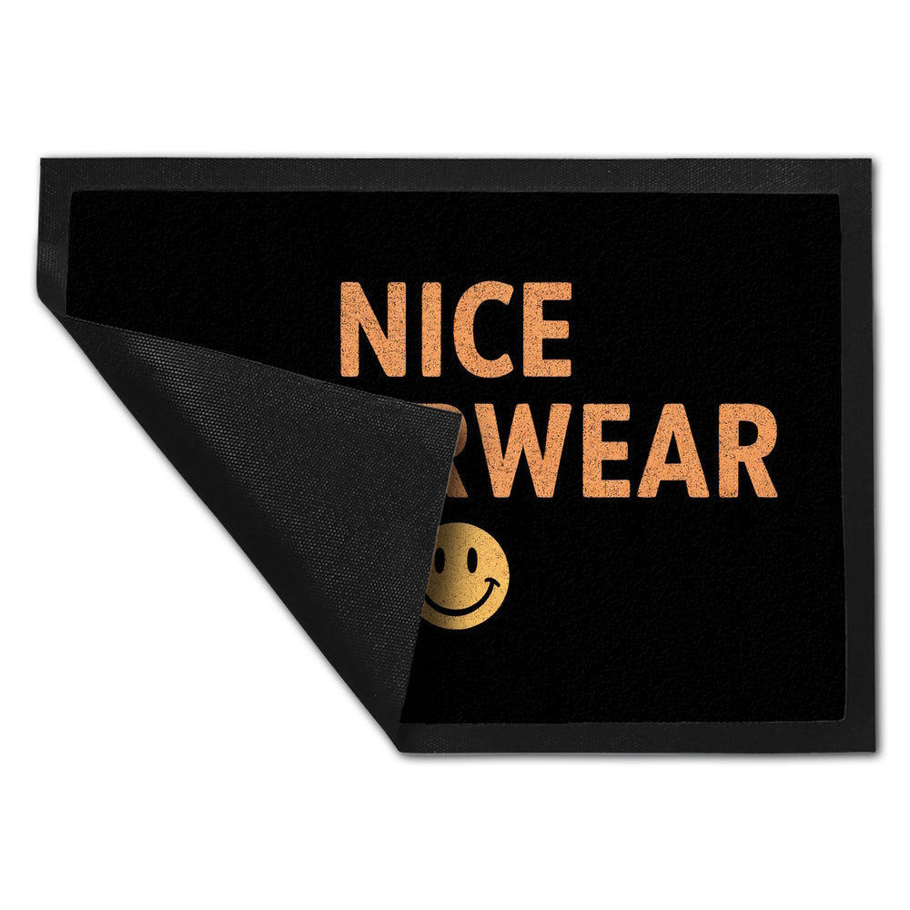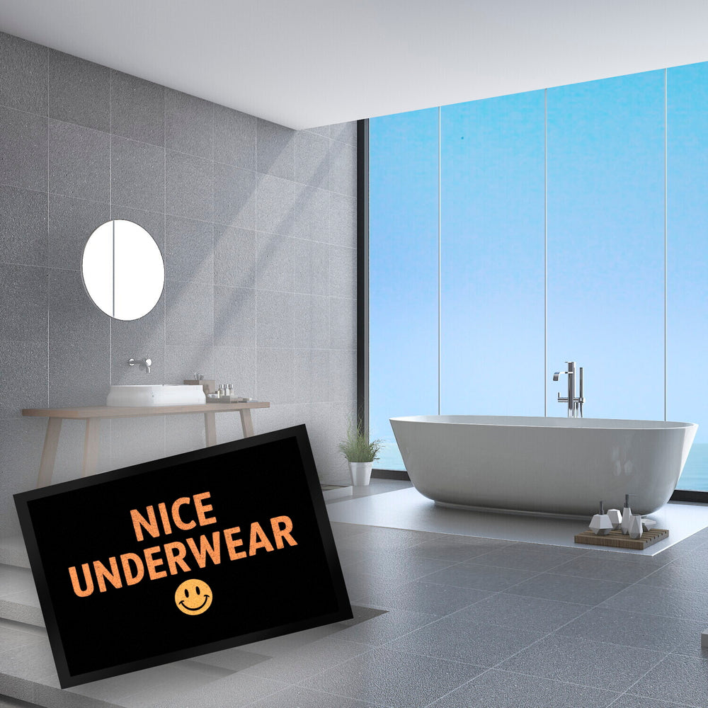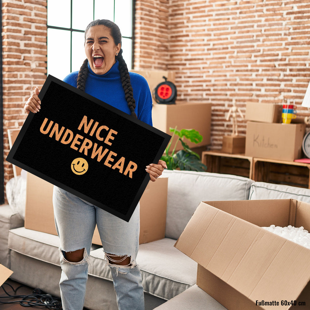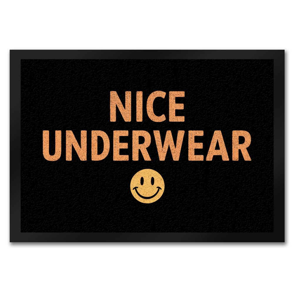 - Diese lustige Fußmatte bringt unglaublich viel Humor an jede Haustür! Mit einem schlichten schwarzen Hintergrund und dem frechen Spruch "NICE UNDERWEAR" in leuchtendem Orange zieht sie automatisch alle Blicke auf sich. Ein fröhliches Emoticon darunter rundet das Design perfekt ab. Einfach unwiderstehlich für jeden, der beim Eintreten ein Lächeln schenken möchte.