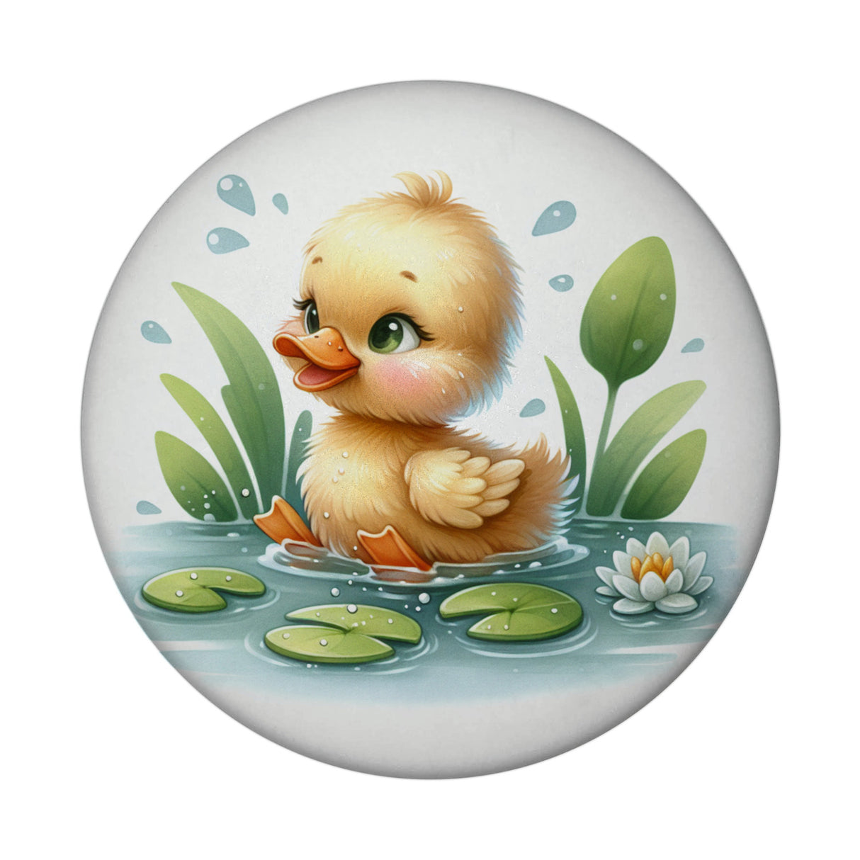 • Tauche ein in die spaßige Welt der Planschente Ente! Unsere runde Magnet zeigt eine supersüße Ente mit gelbem Gefieder, die fröhlich im klaren, blauen See planscht – alle umgeben von einer hübschen Wasserrose. Ideal für Badenixen und Wassermänner!