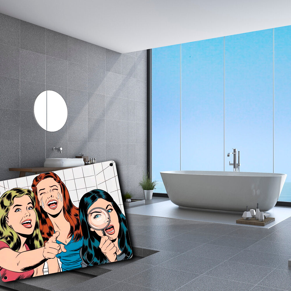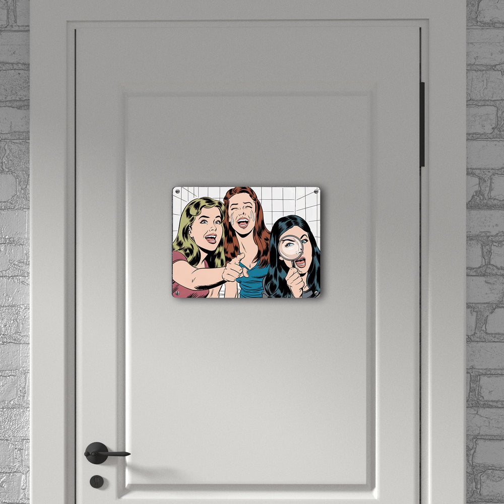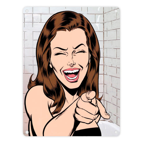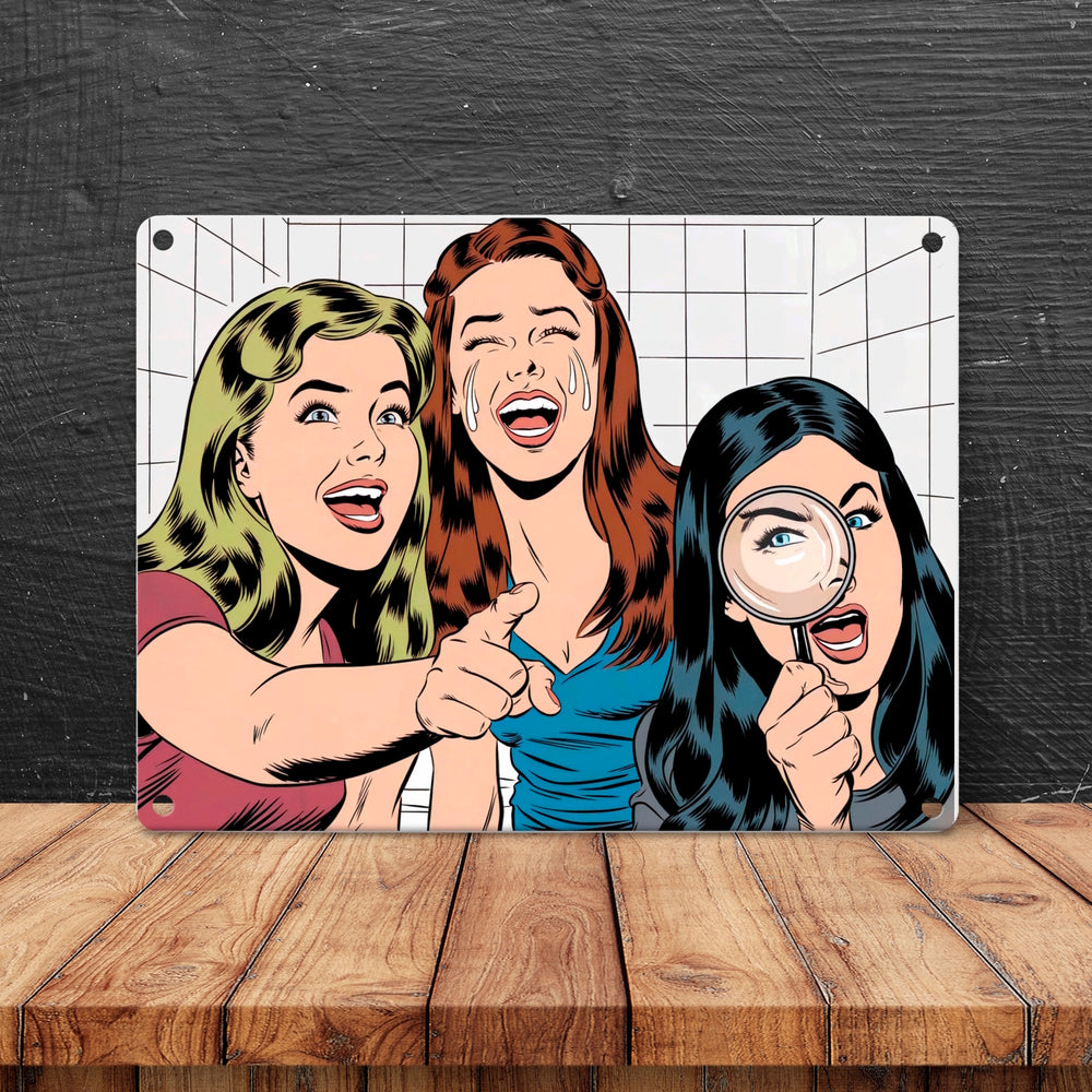 - Du hast genug von langweiligen Toilettenschildern? Schnapp dir unser Metallschild mit lachenden Frauen! Ein Retro-Comic-Illustration mit drei Frauen, die dich zum Lachen bringen. Perfekt für jedes Herren-WC!