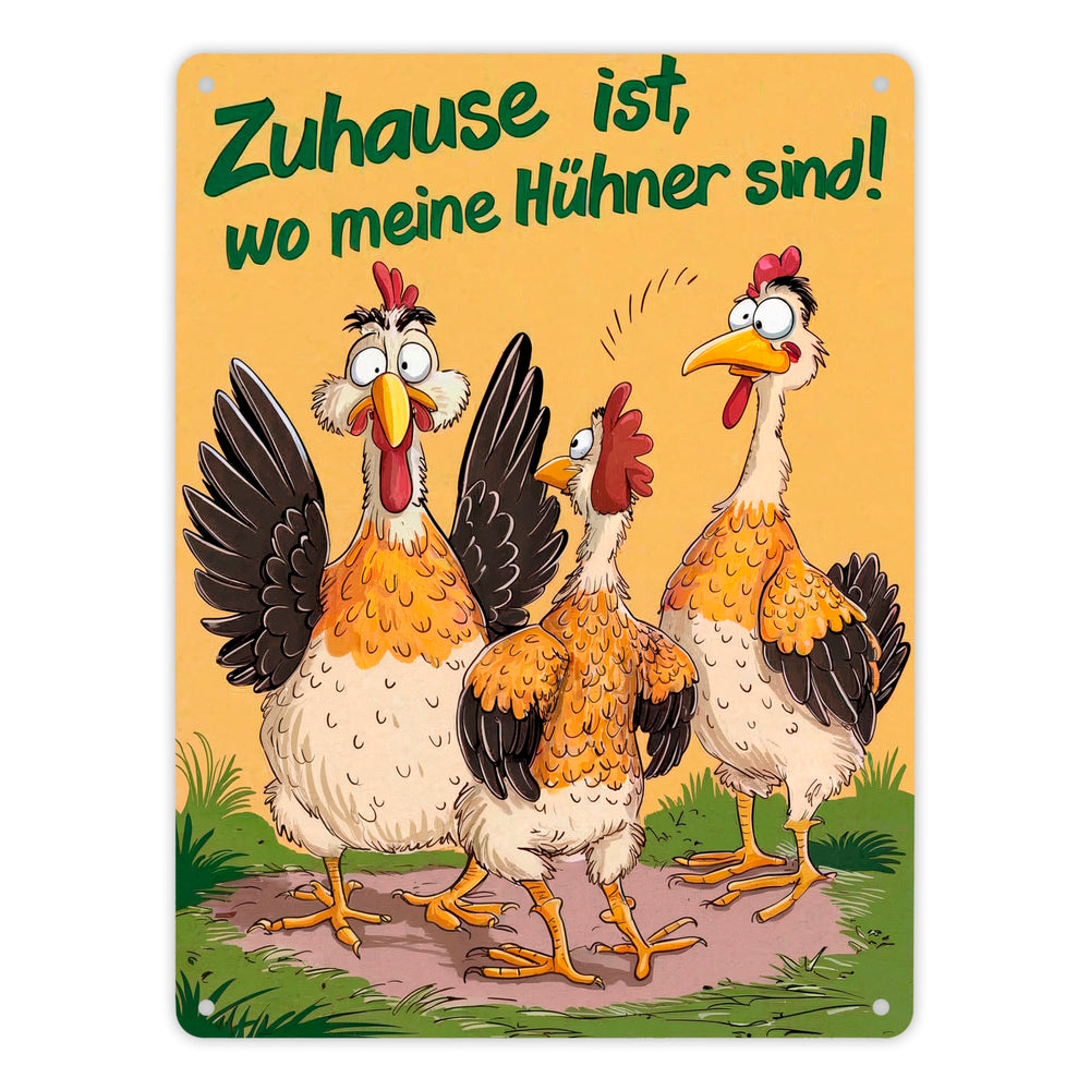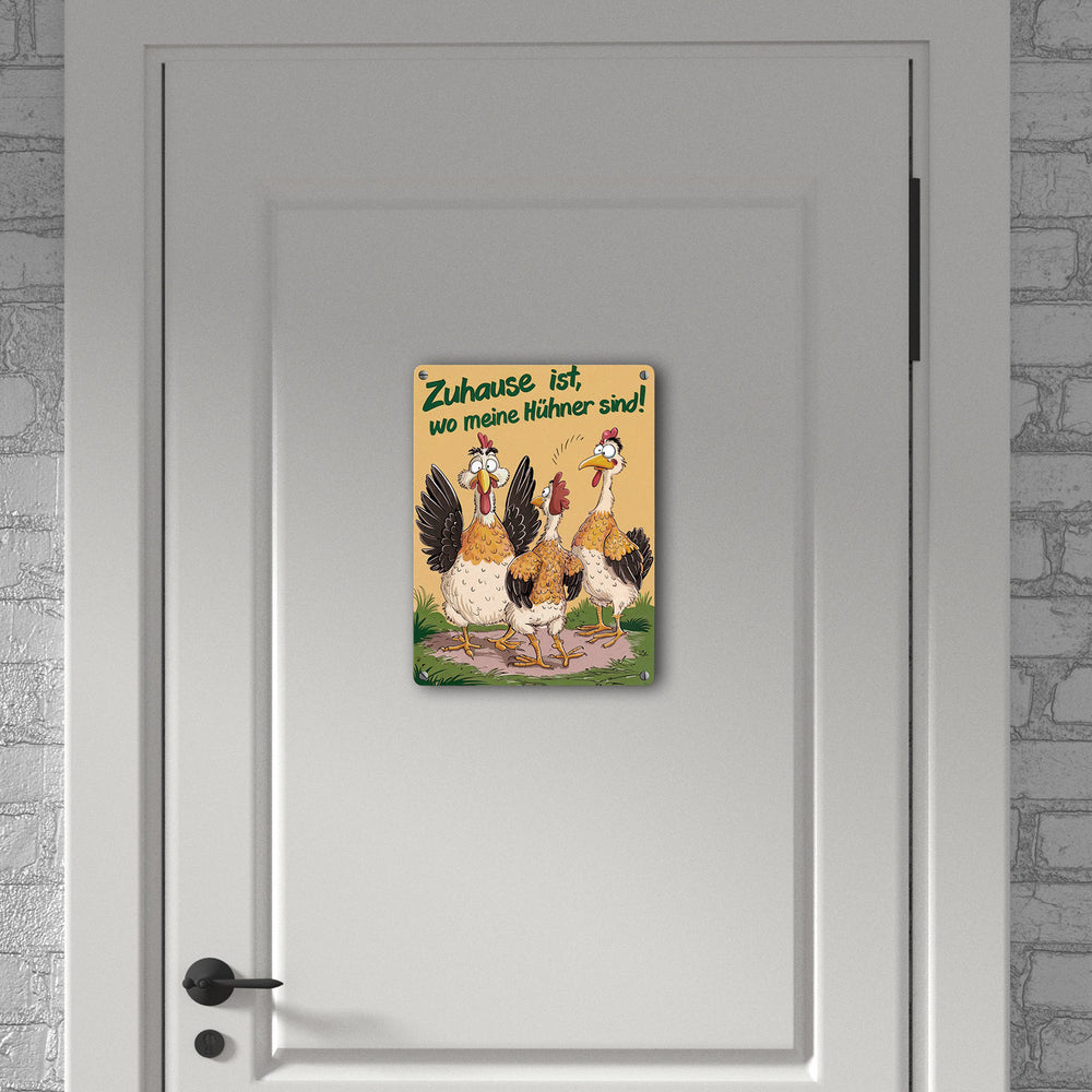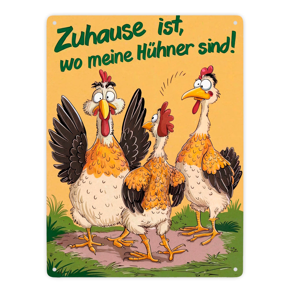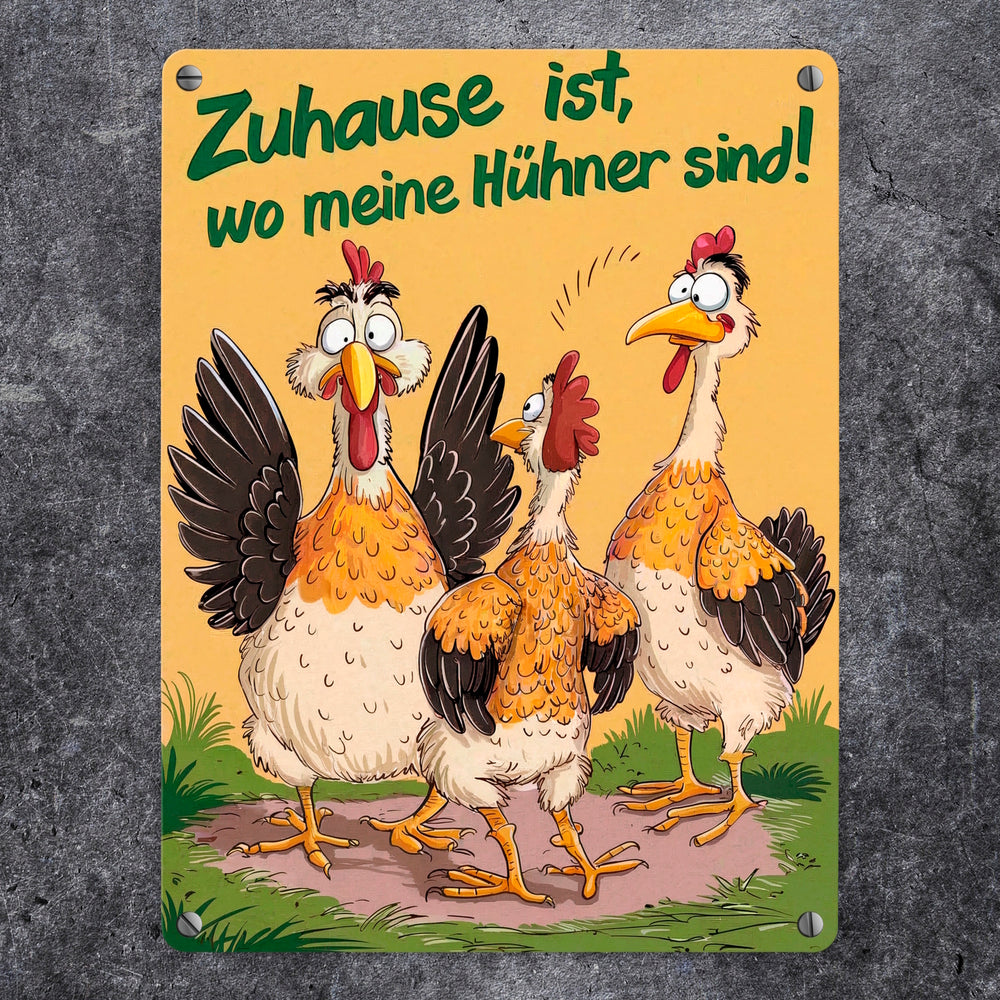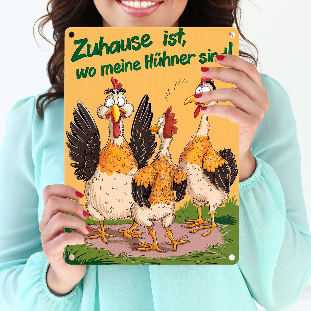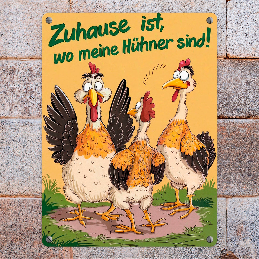 - Lustiger als ein Morgen auf dem Bauernhof! Unser Metallschild „Zuhause ist bei meinen Hühnern“ zeigt drei galante Hühner, die ordentlich für Stimmung sorgen. Ein Huhn hat einen überraschten Gesichtsausdruck zu bieten, während eines von hinten zuschaut. Das dritte sieht einfach nur verrückt aus. Fröhlicher wird’s kaum!