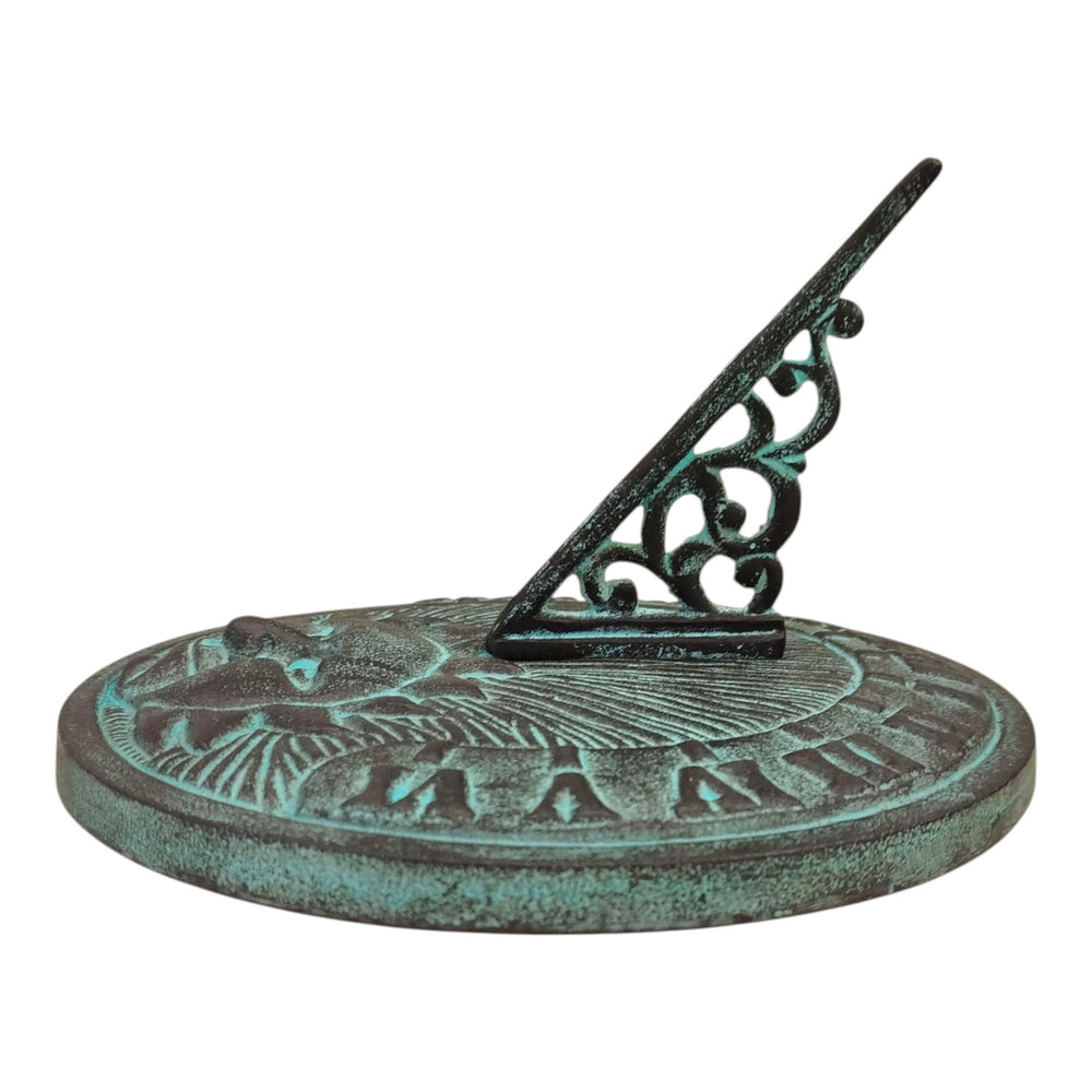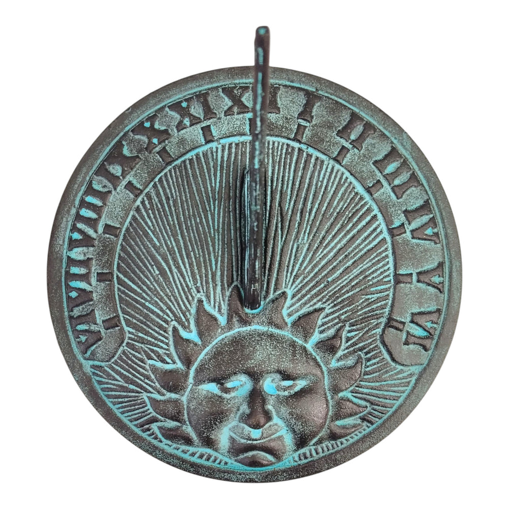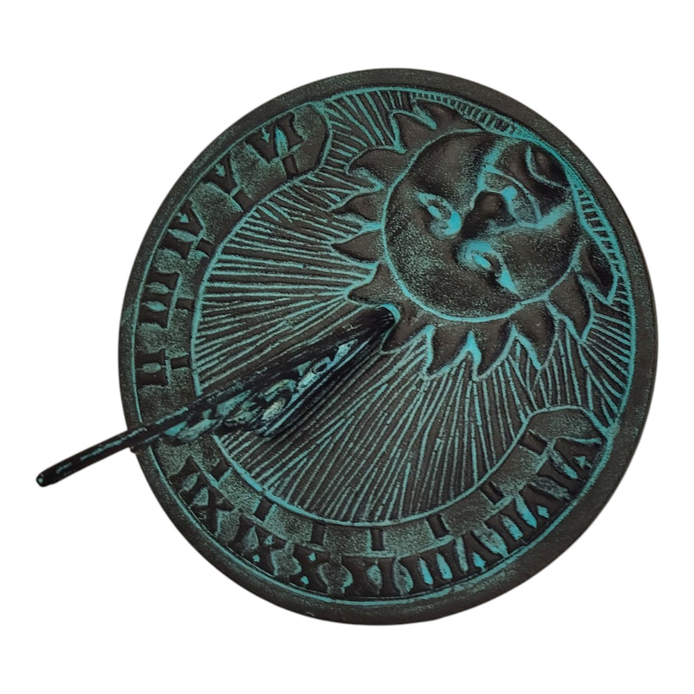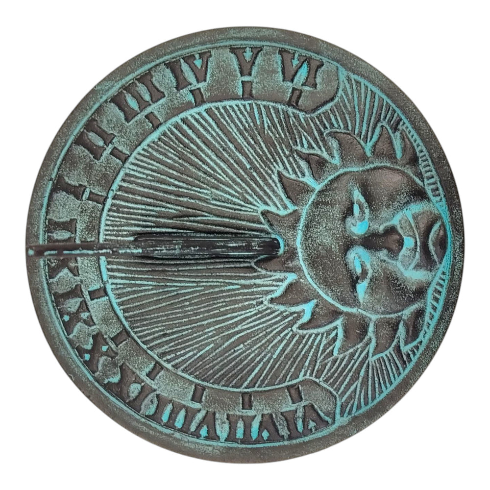 - Diese Gartendeko ist ein Kunstwerk aus schwerem Metall, handbemalt in einem used look Dunkelgrau-Grün. Der in der Mitte abgebildete Sonne-Gesicht strahlt mit einem Hauch von Mystik. Der Gnomon zeigt auf römische Zahlen und versprüht einen nostalgischen Charme. Ein Muss für Liebhaber von Antikoptik!