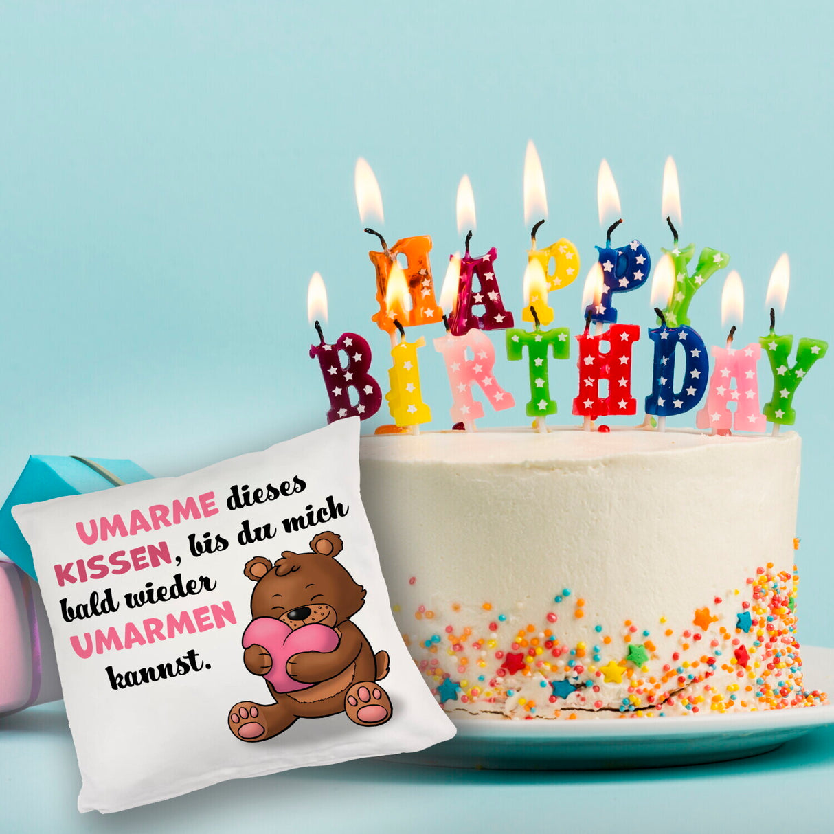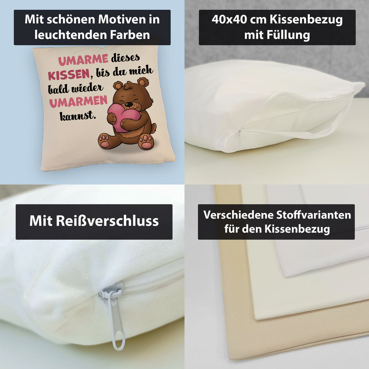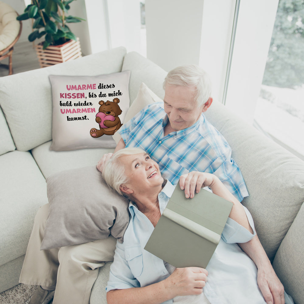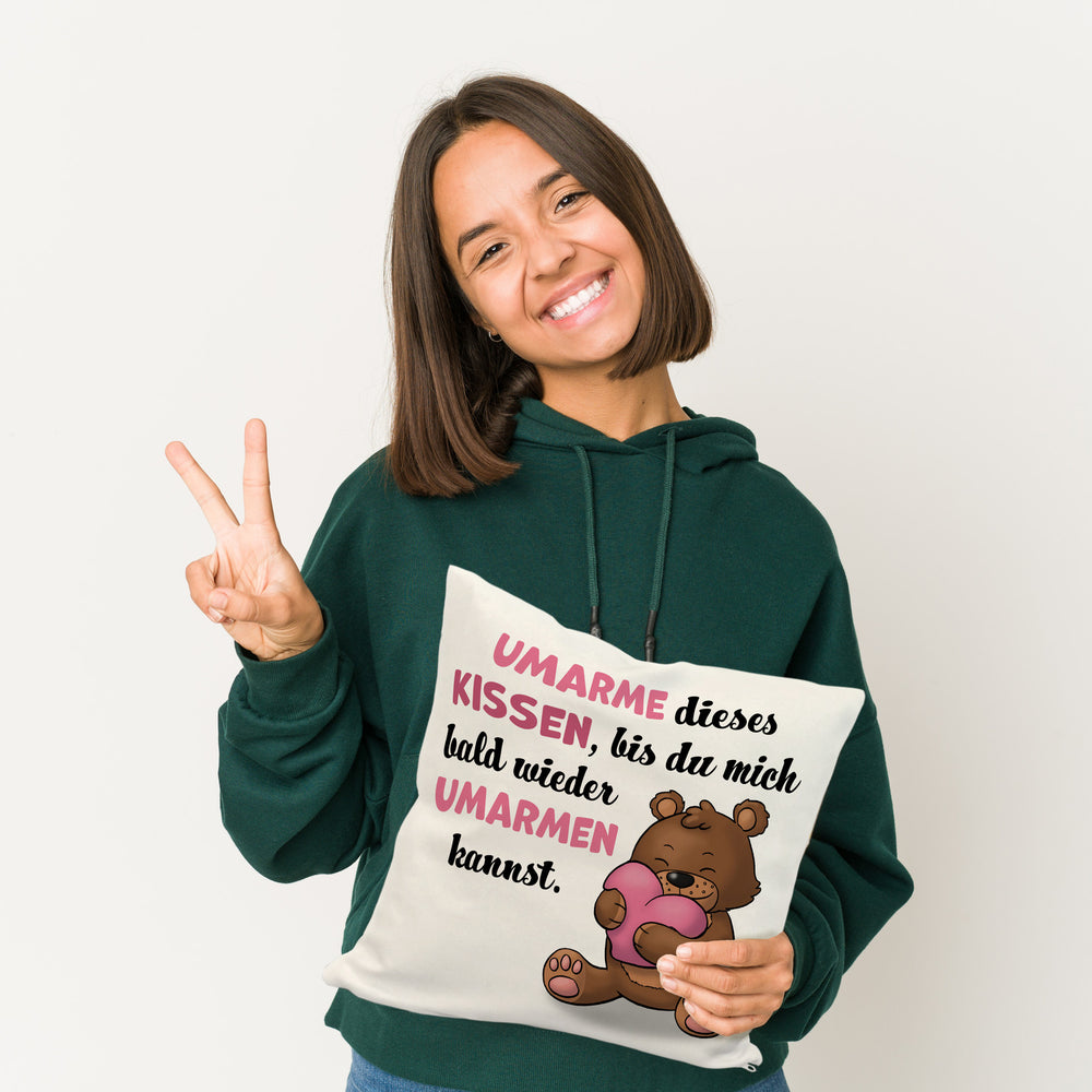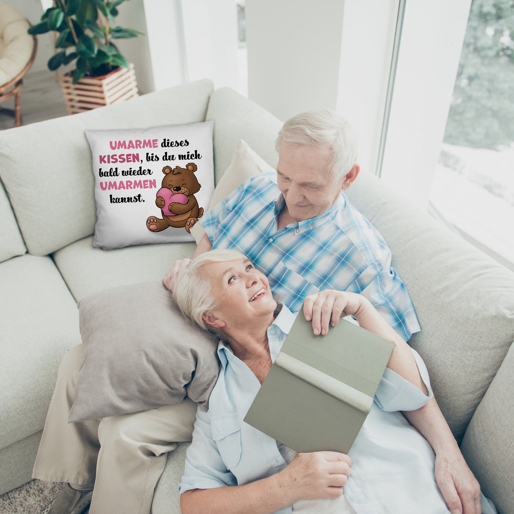 - Das liebevolle Kissen mit Bär Motiv ist das perfekte Geschenk, um jemandem zum Valentinstag oder Geburtstag besondere Aufmerksamkeit zu schenken. Der hinreißende Spruch „Umarme dieses Kissen, bis du mich bald wieder umarmen kannst“ macht es zu einer tollen Liebeserklärung an deinen Partner.