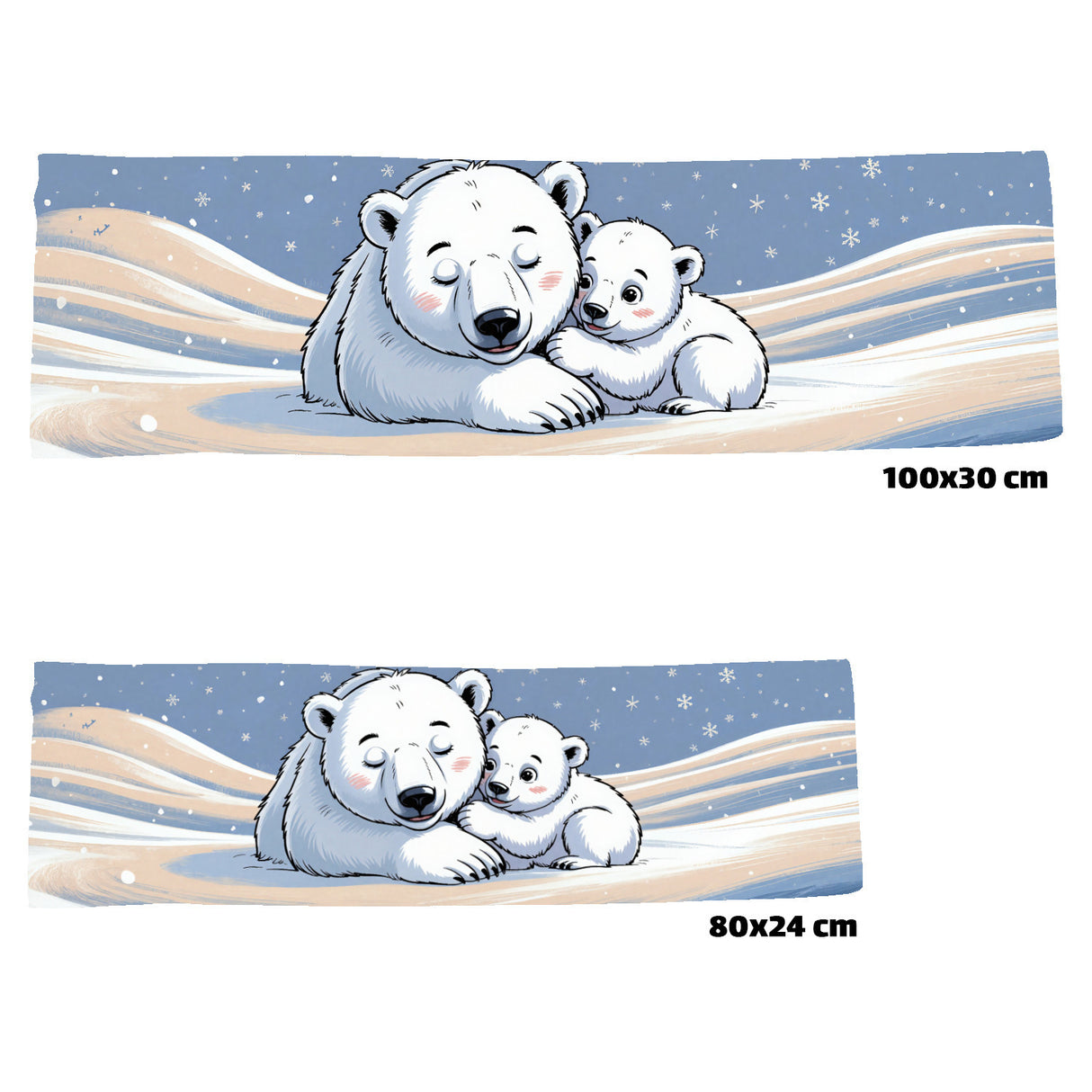 • Das Eishandtuch zeigt ein herzerwärmendes Comic-Motiv mit einer Eisbärenmutter und ihrem Baby, die liebevoll in einer verschneiten Landschaft kuscheln. Sanfter Schneefall und sanfte Pfirsich- und Cremetöne verleihen dem Handtuch eine ruhige, malerische Kulisse, die Naturverbundenheit und Geborgenheit ausstrahlt.