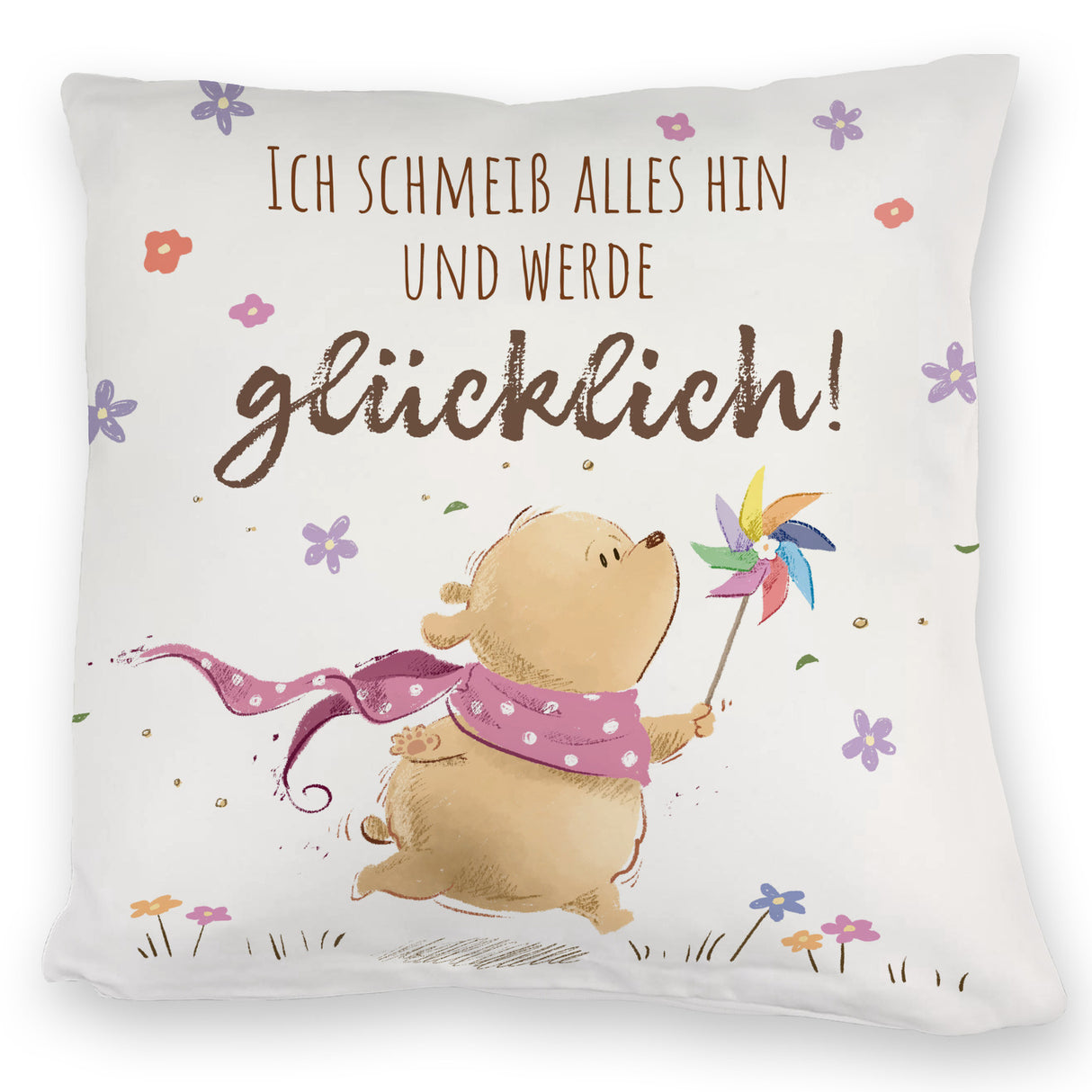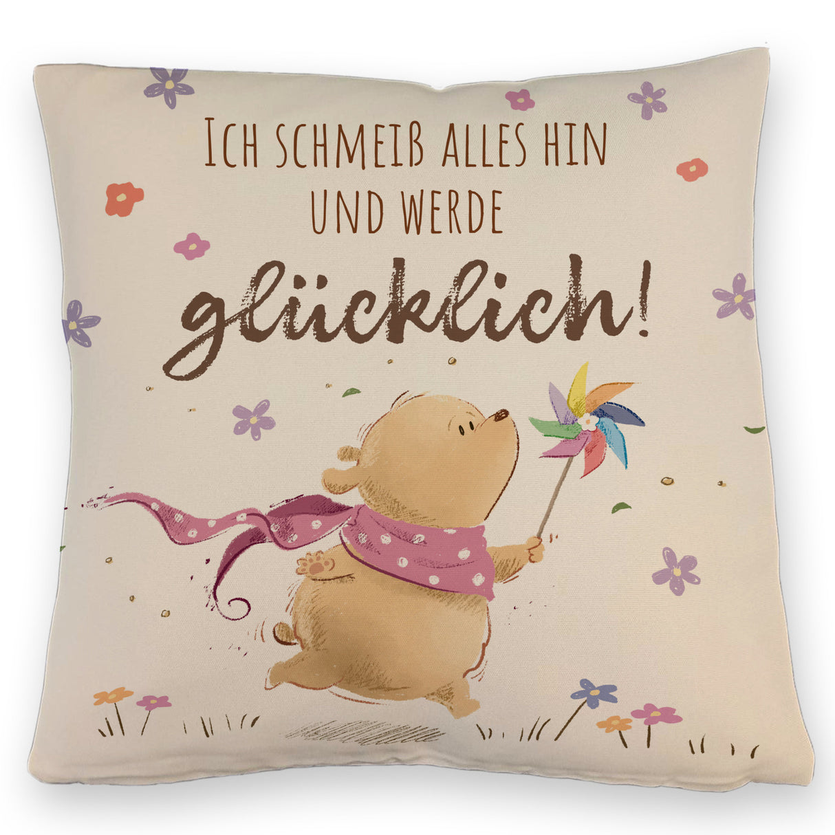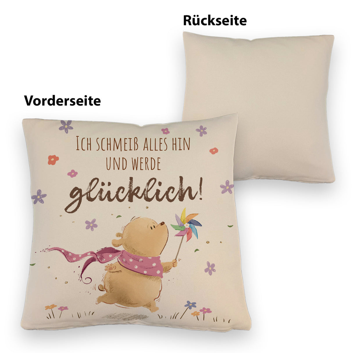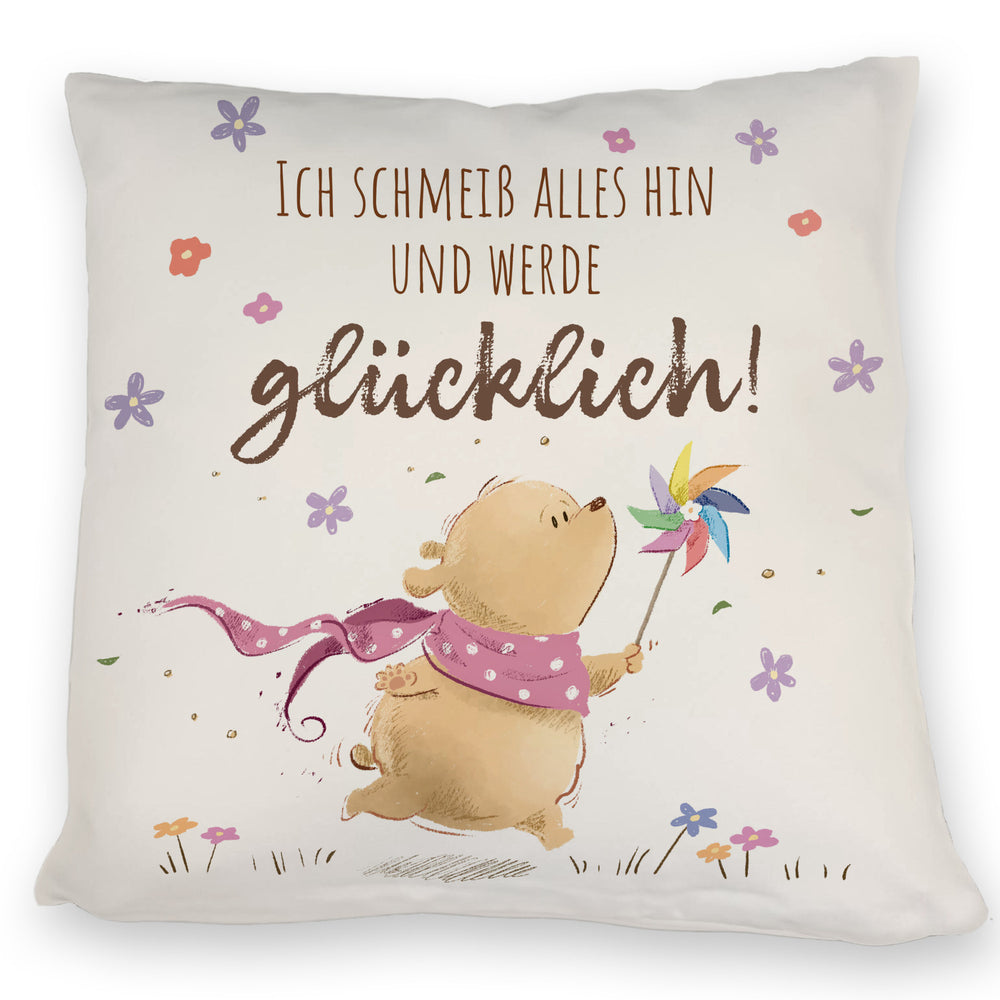 • Auf der Suche nach einem besonderen Geschenk für den Geburtstag einer Frau? Dann ist das niedliche Kissen mit dem Glücklicher Bär Motiv genau das Richtige! Es zeigt einen süßen und glücklichen Bären, der mit einem bunten Windrad umherläuft und das Leben genießt. Der aufgedruckte Spruch „Ich schmeiß alles hin und werde glücklich!“ rundet das Geschenk ab und