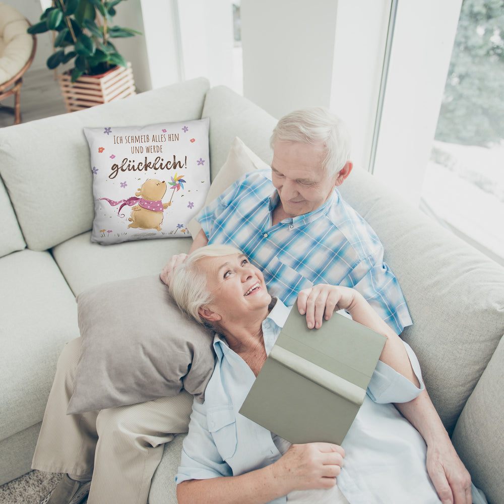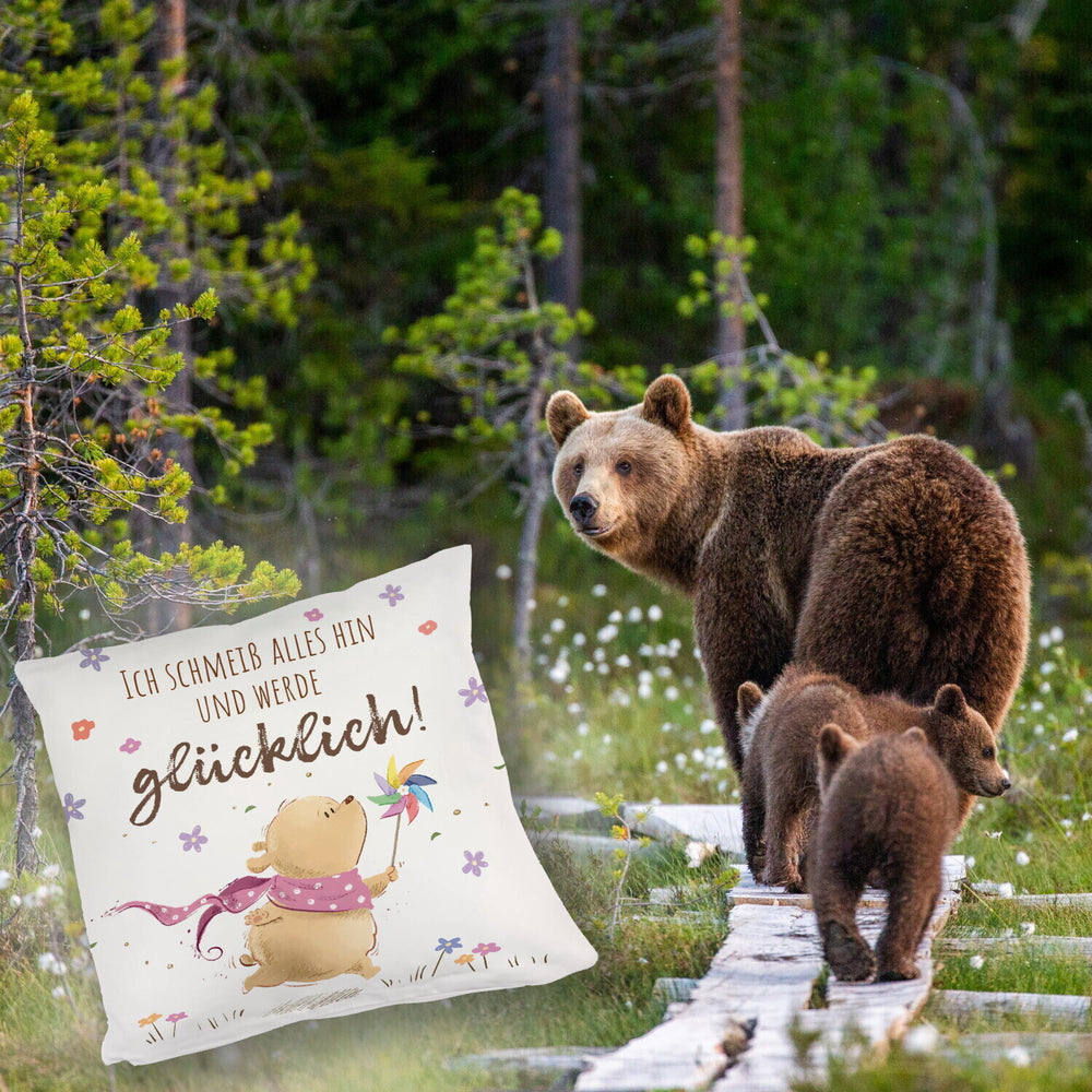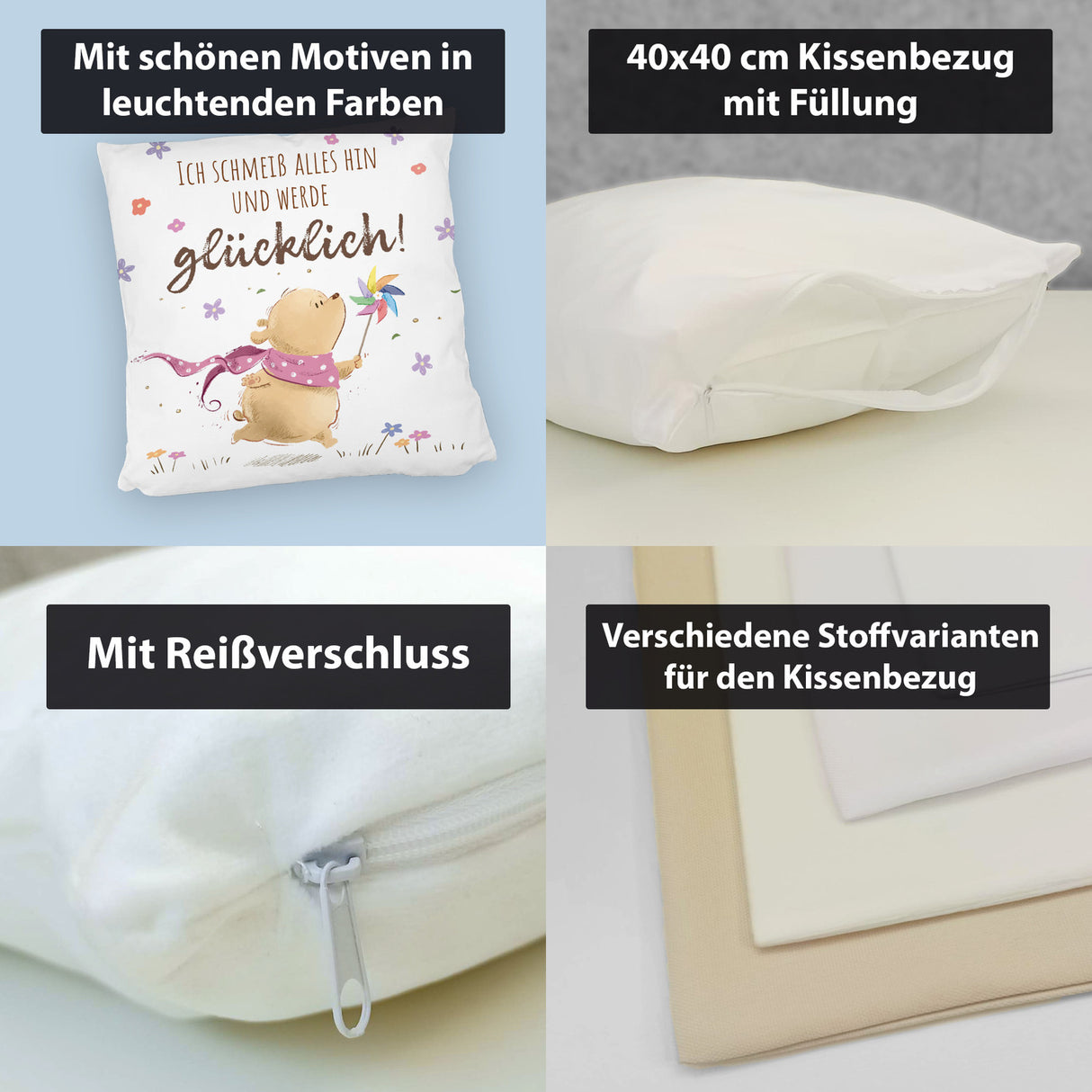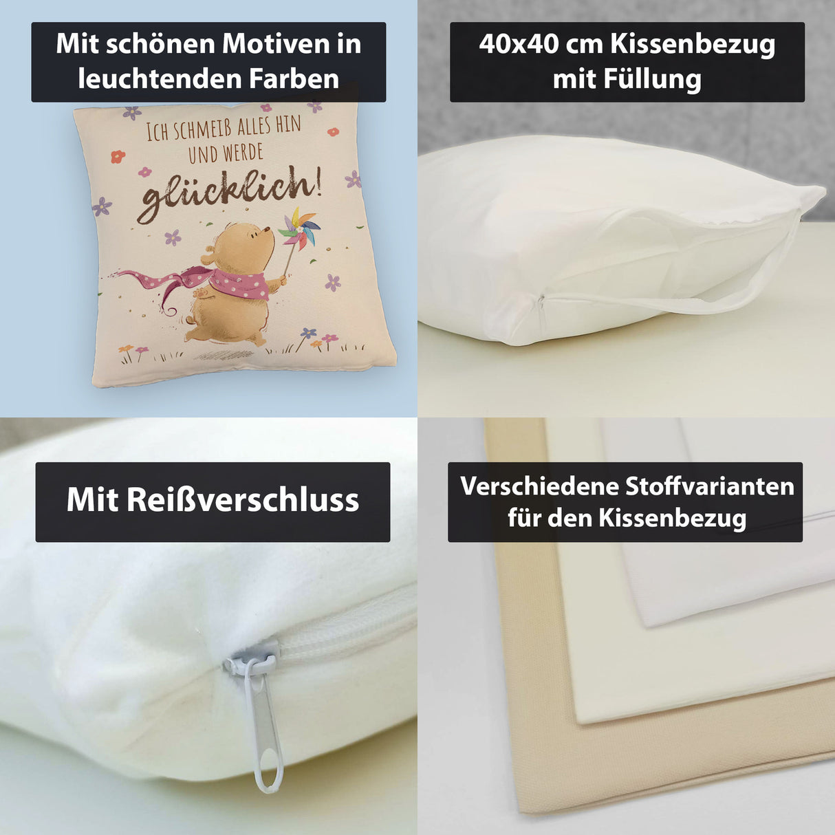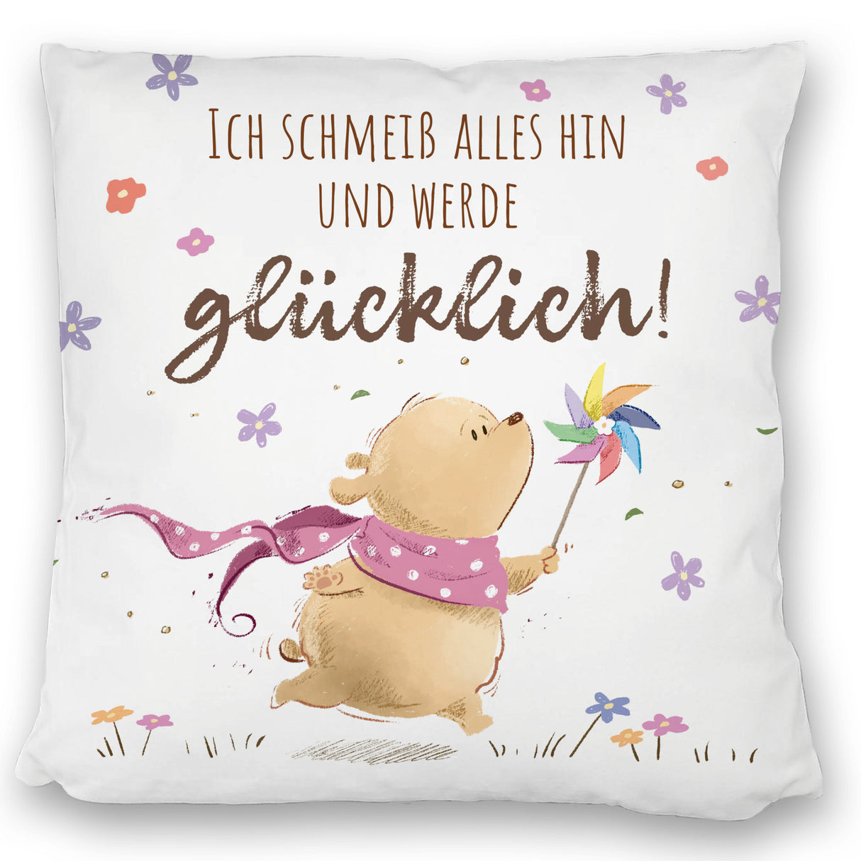 • Auf der Suche nach einem besonderen Geschenk für den Geburtstag einer Frau? Dann ist das niedliche Kissen mit dem Glücklicher Bär Motiv genau das Richtige! Es zeigt einen süßen und glücklichen Bären, der mit einem bunten Windrad umherläuft und das Leben genießt. Der aufgedruckte Spruch „Ich schmeiß alles hin und werde glücklich!“ rundet das Geschenk ab und