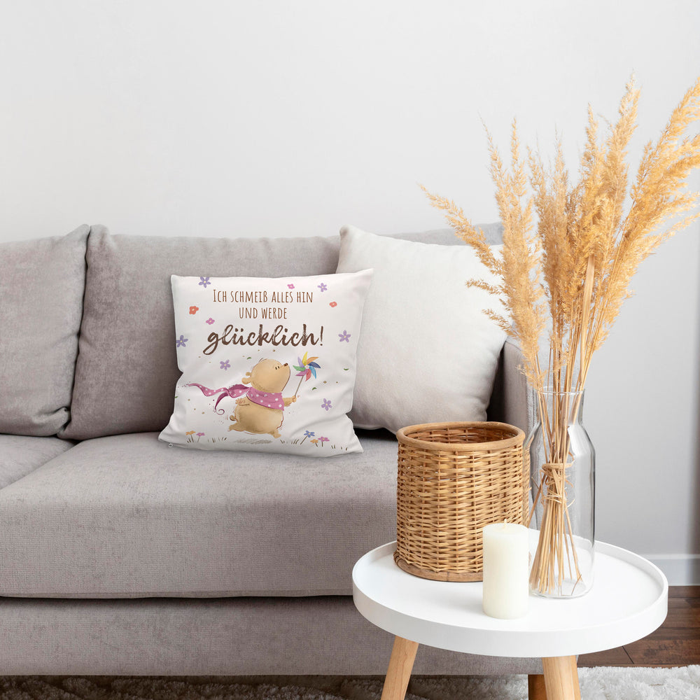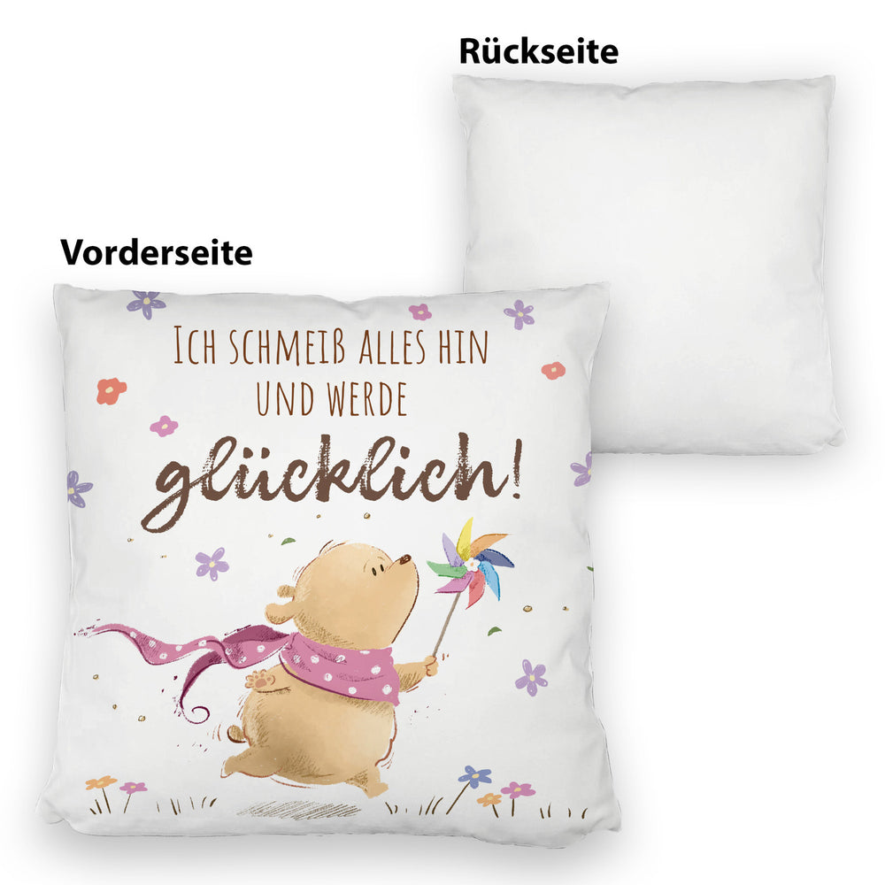 • 1x Glücklicher Bär Kissen mit Spruch Ich schmeiß alles hin in der gewählten Ausführung