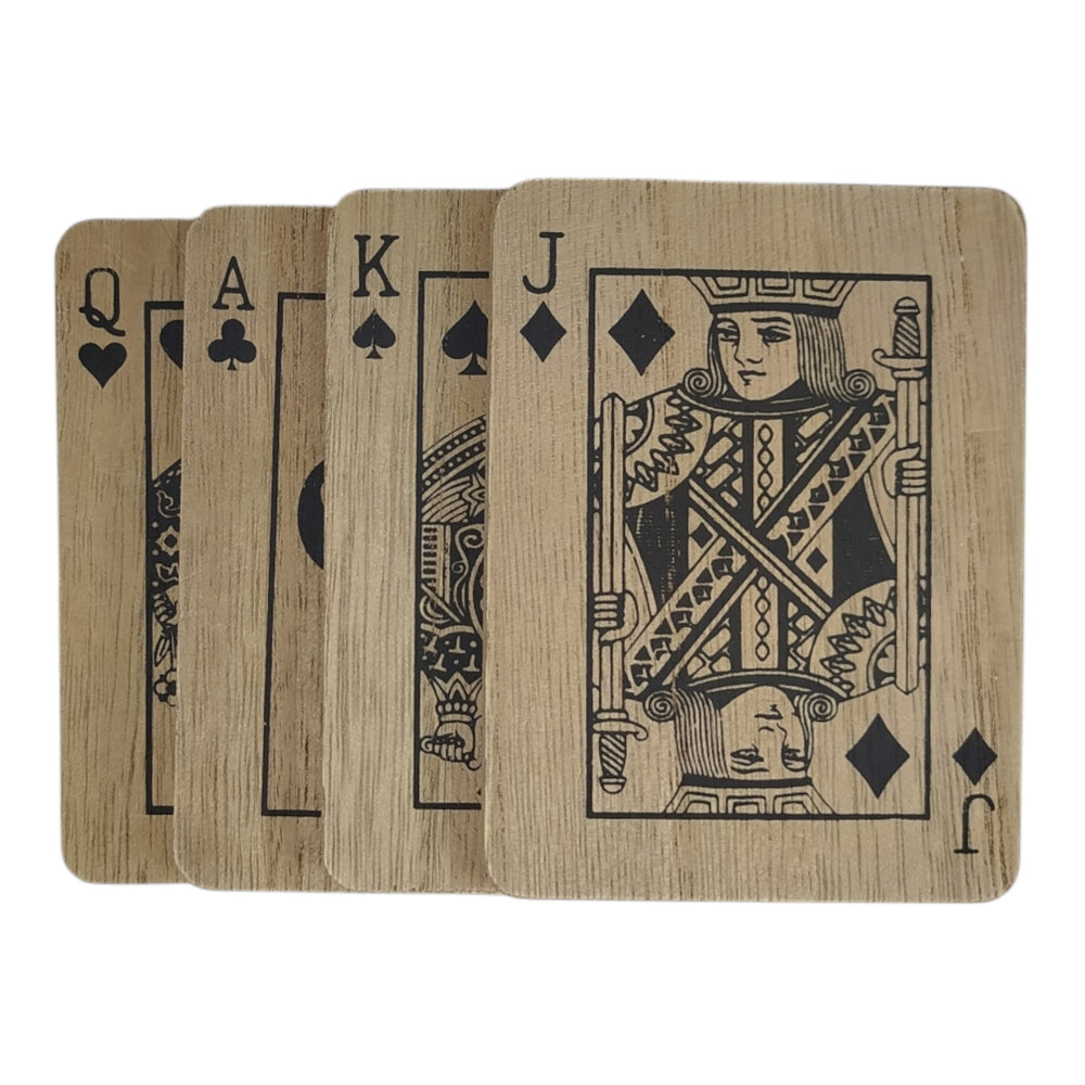 - 1x Kartenspiel Untersetzer aus Holz mit Halterung. Bestehend aus 1x Halterung und 4x Untersetzer.
