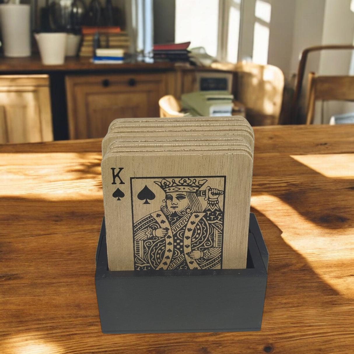 - Dieses raffinierte Set aus MDF-Holz bezaubert mit vier Untersetzern im Design von Spielkarten. Mit einem Pik-Ass, Pik-König, Herz-Dame und Karo-Buben bringt es nicht nur Modernität in Ihr Wohnzimmer, sondern auch jeden Pokerabend ins Rollen. Die praktische schwarze Halterung sorgt für Ordnung und stilvolle Aufbewahrung.