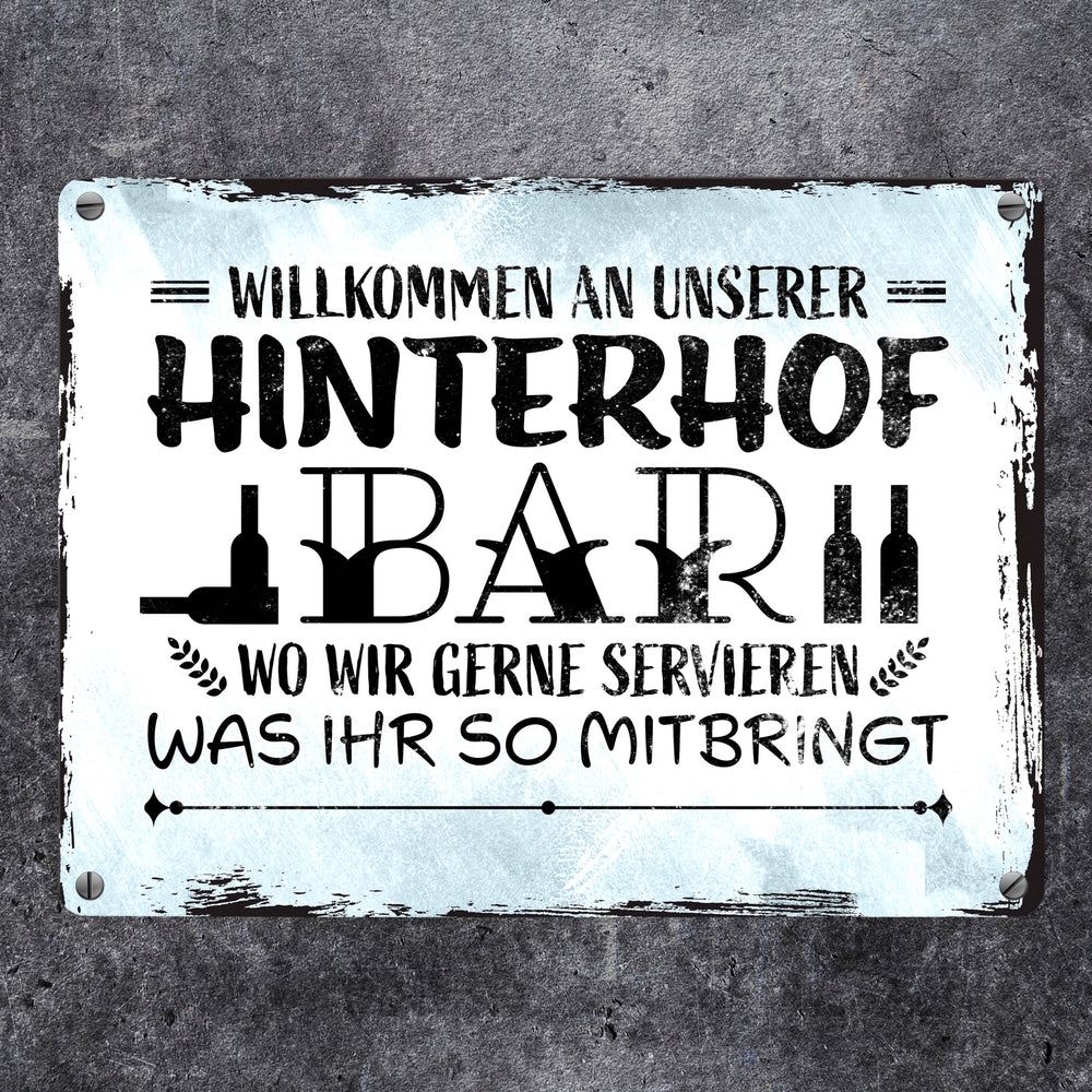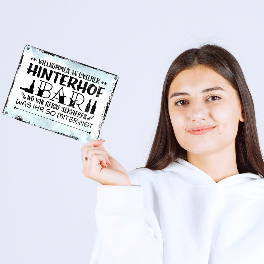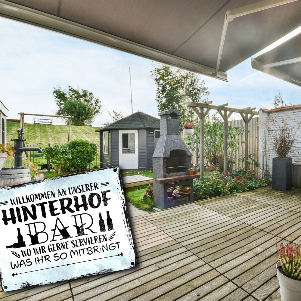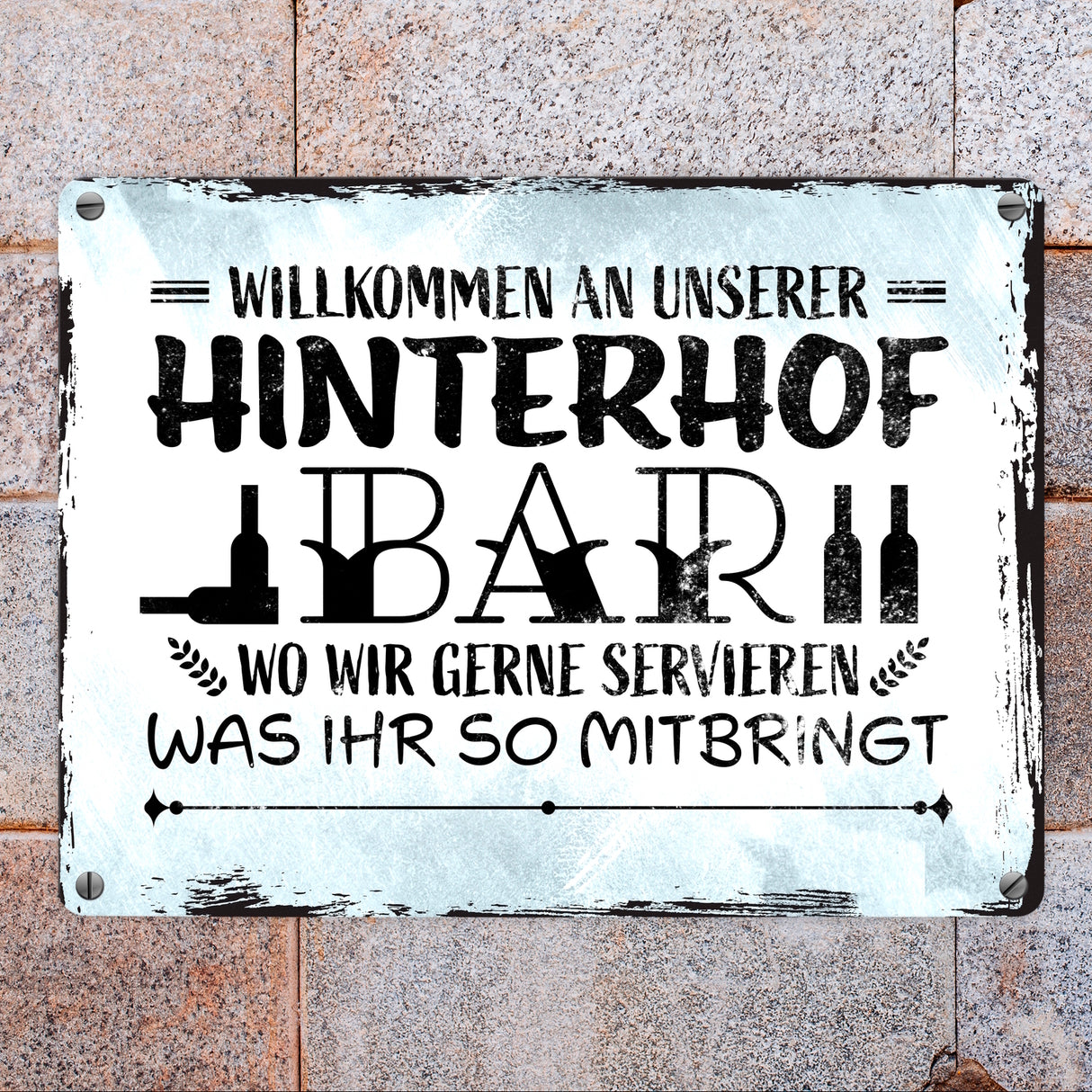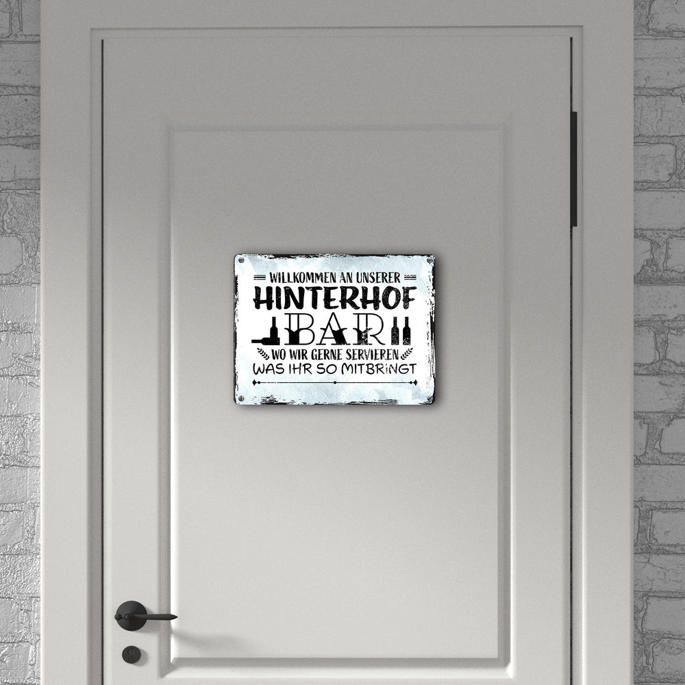 - 1x Willkommen an unserer Hinterhofbar Metallschild mit lustigem Spruch in der gewählten Größe