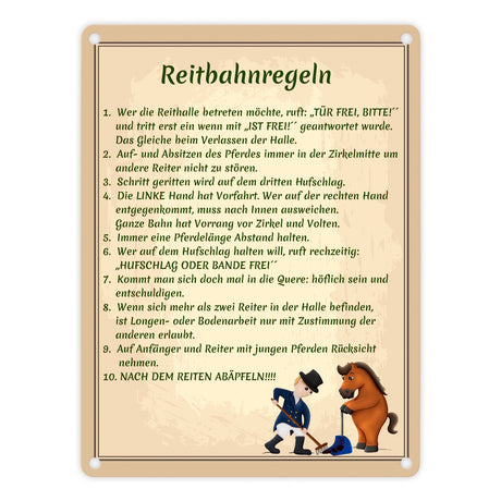 - 1x Reiter Metallschild mit braunem Pferd Motiv und Spruch: Bitte Reitplatz säubern in der gewählten Größe