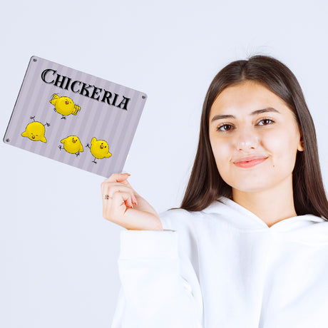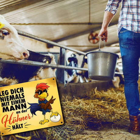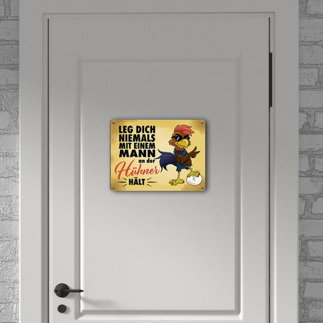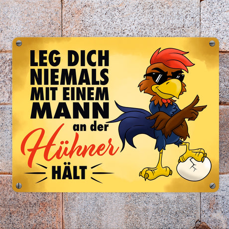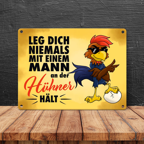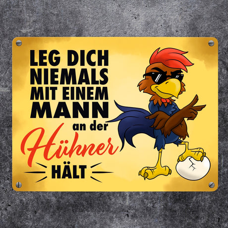 €20,95Grundpreis /Nicht verfügbar Leg dich niemals mit einem Mann an der Hühner hält - Metallschild mit lässigem Cartoon-Hahn