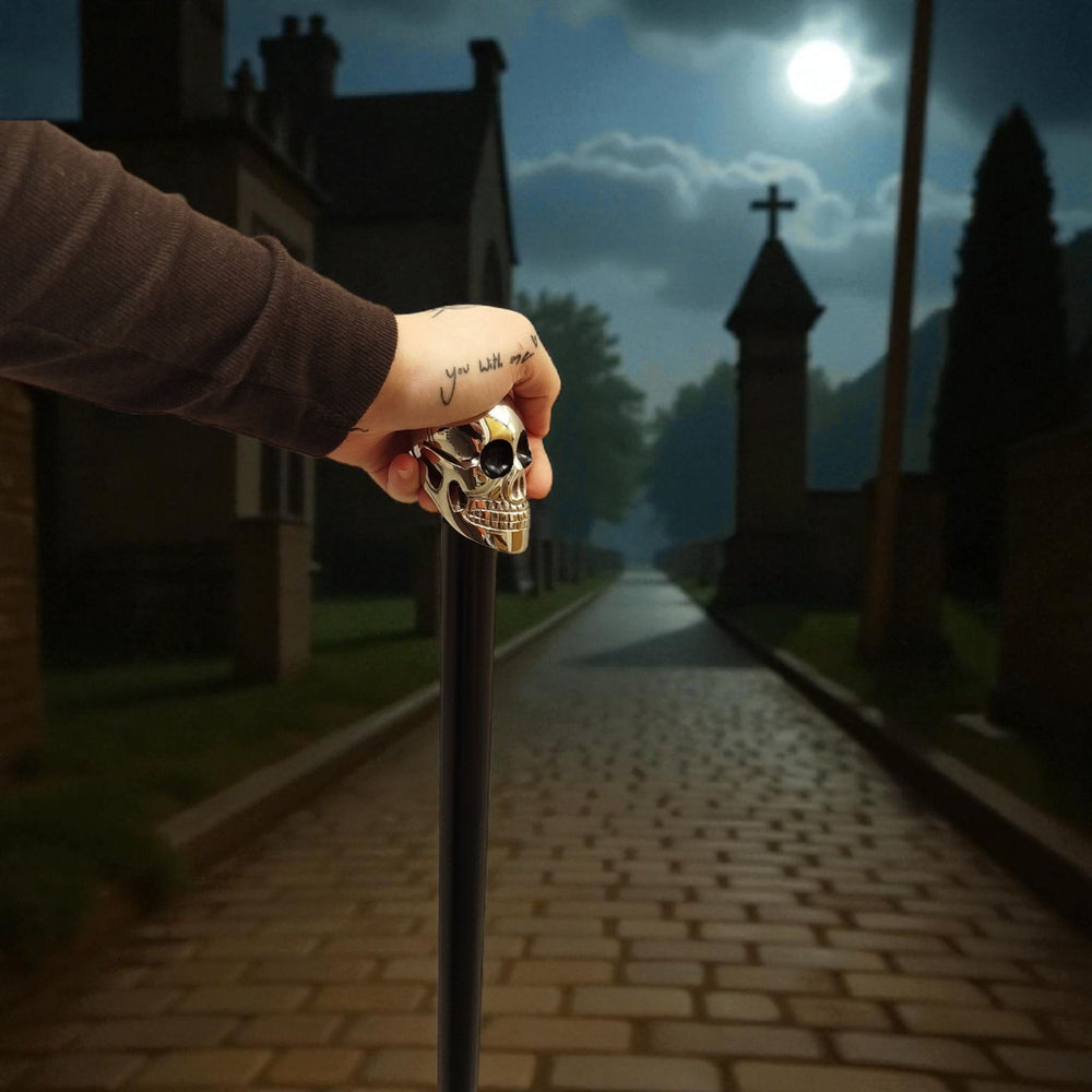 Entdecken Sie das geheimnisvolle Flair des Lebens mit unserem exklusiven Totenkopf Spazierstock aus edlem schwarzem Holz und einem silbernen Metallknauf! Dieser Spitzbart verleiht Ihnen nicht nur das ultimative Charisma, sondern garantiert auch die perfekte Balance zwischen Ästhetik und Funktion.Stellen Sie sich vor, wie Sie diesen stilvollen Gehstock durch die Straßen führen und dabei überall neugierige Blicke auf sich ziehen. Der imposante Totenkopf-Knauf, der übrigens abschraubbar ist, sorgt dafür, dass bei jedem Schritt das Mystische mitschwingt und gleichzeitig als Gesprächsstarter dient. Doch das ist noch nicht alles – der Gummipuffer an der Spitze schützt nicht nur Ihre Böden vor Kratzern, sondern gibt Ihnen auch genügend Stabilität, um mit Zuversicht aufzutreten.Ob bei einem alltäglichen Spaziergang durch den Park oder als gewagtes Accessoire bei einem Kostümfest, dieser Gehstock ist immer ein Ausdruck von Individualität und Selbstbewusstsein. Die perfekte Ergänzung für jedermann, der das Außergewöhnliche sucht!Machen Sie diesen Totenkopf Spazierstock zu Ihrem Begleiter durch die Geschichtsbücher des Alltags – oder der Halloween-Party. Kein Standard, sondern Ihr ganz spezielles Statement.