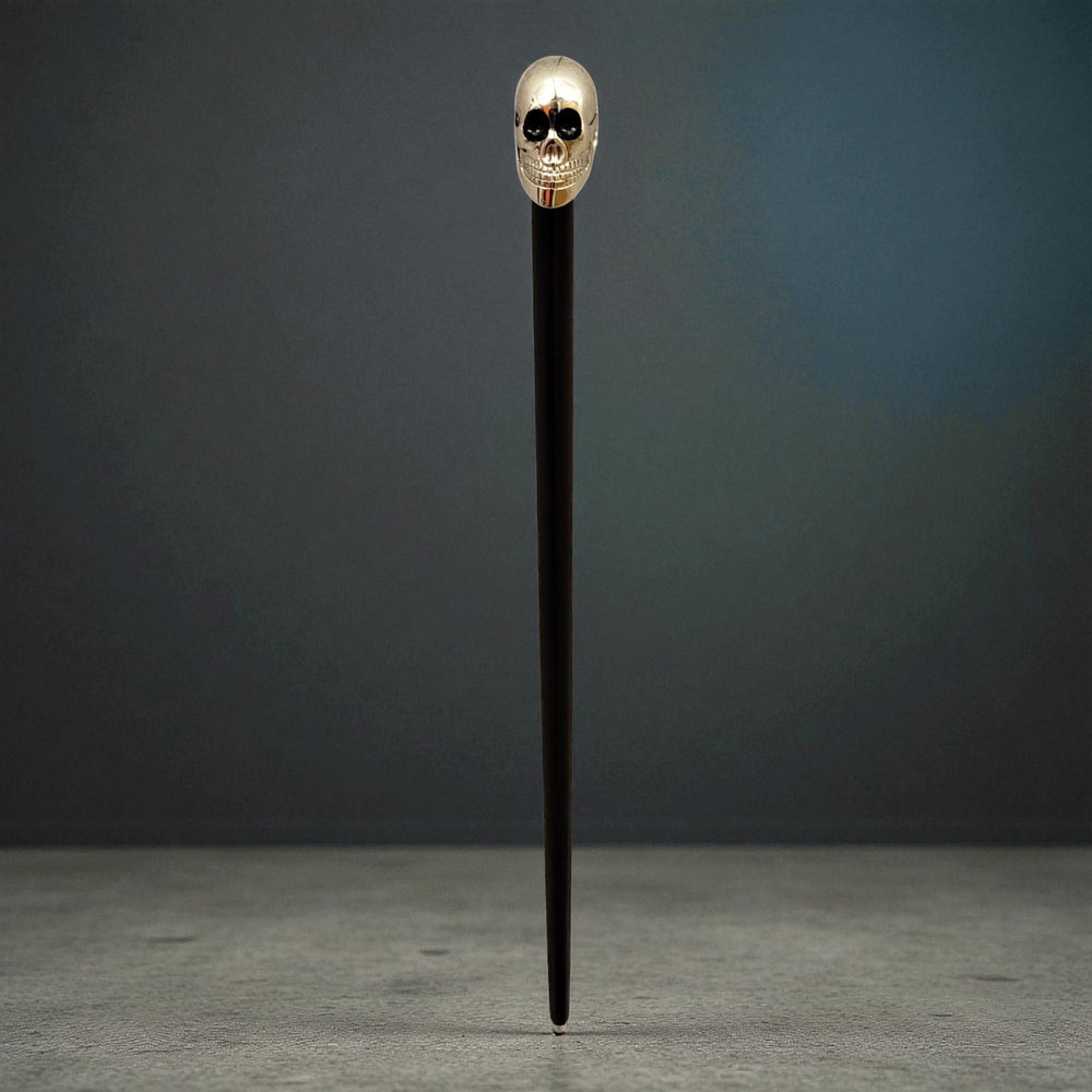 Totenkopf Spazierstock aus Holz mit goldenem Griff aus Metall