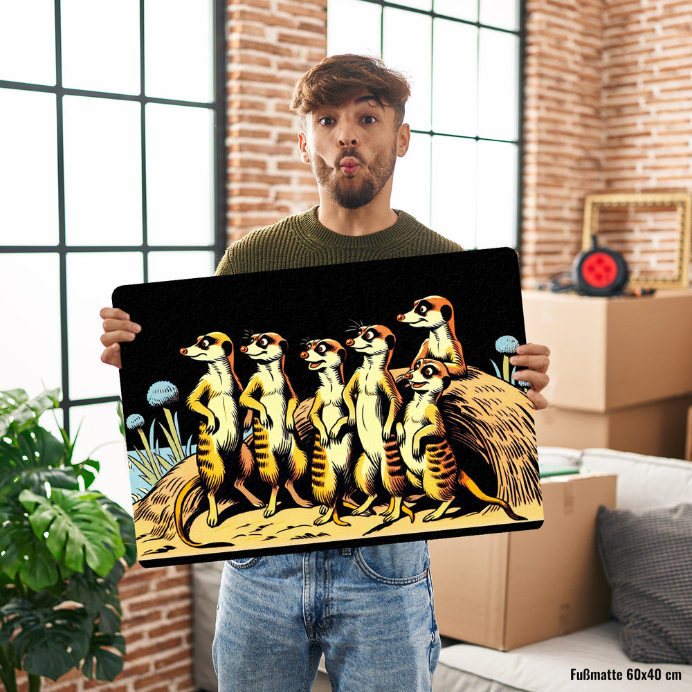 - "Grüße von der Erdmännchen-Wache! Die Erdmännchen Familie Fußmatte empfängt dich mit einem wachsamen Lächeln. Unsere kleinen Freunde aus der Savanne schauen lustig aus ihren Löchern hervor und sorgen beim Eintreten für die Extraportion Gute Laune!"