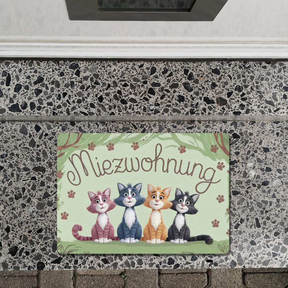 - Betritt das Paradies, mein Lieber! Unsere „Miezwohnung“-Fußmatte begrüßt dich mit vier schnuckeligen Katzen nebeneinander. Die frechen Katzensilhouetten in verschiedenen Farben und Mustern sind einfach unwiderstehlich.