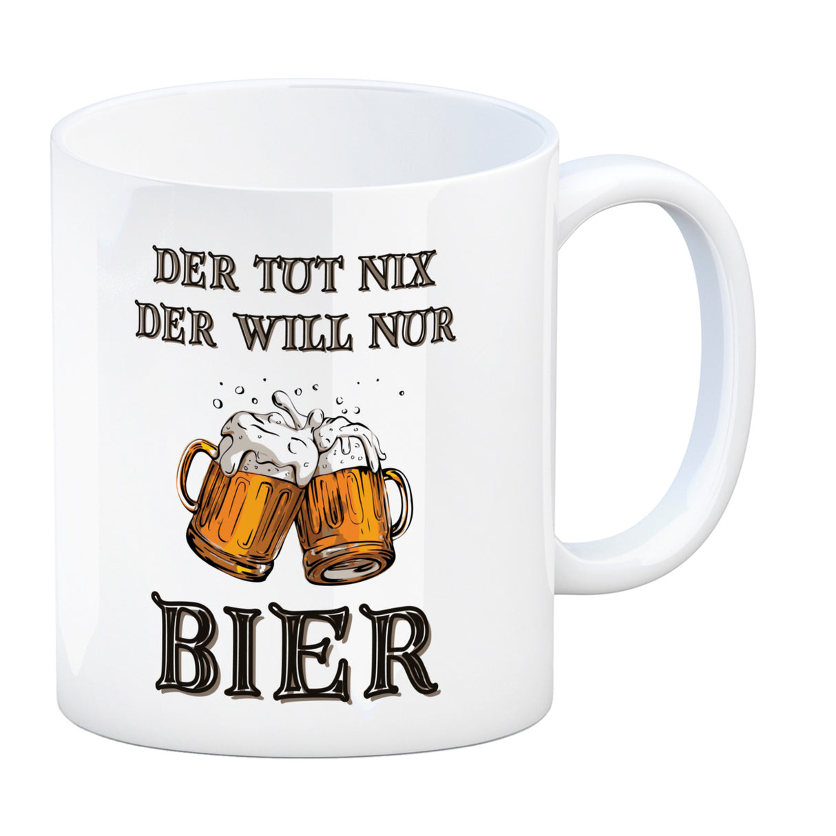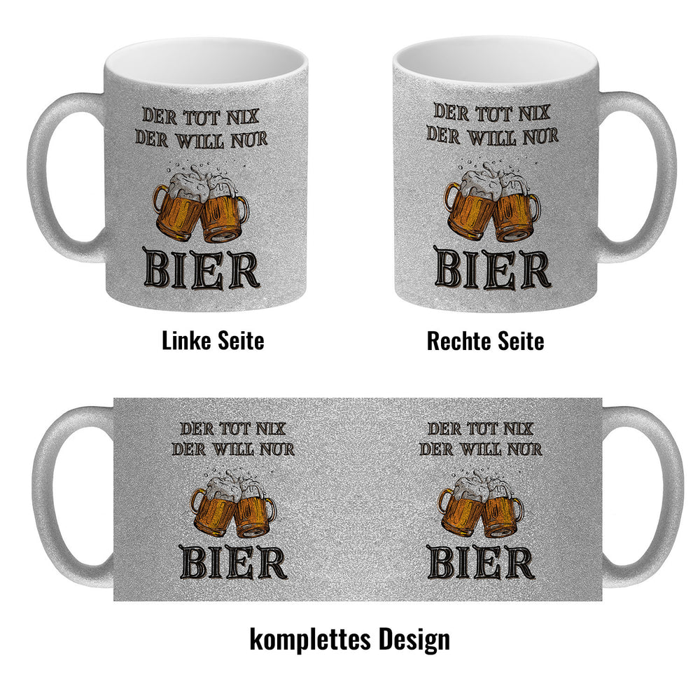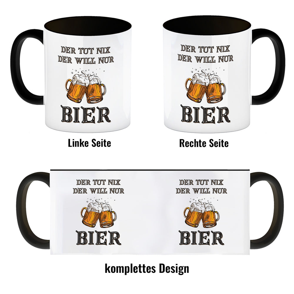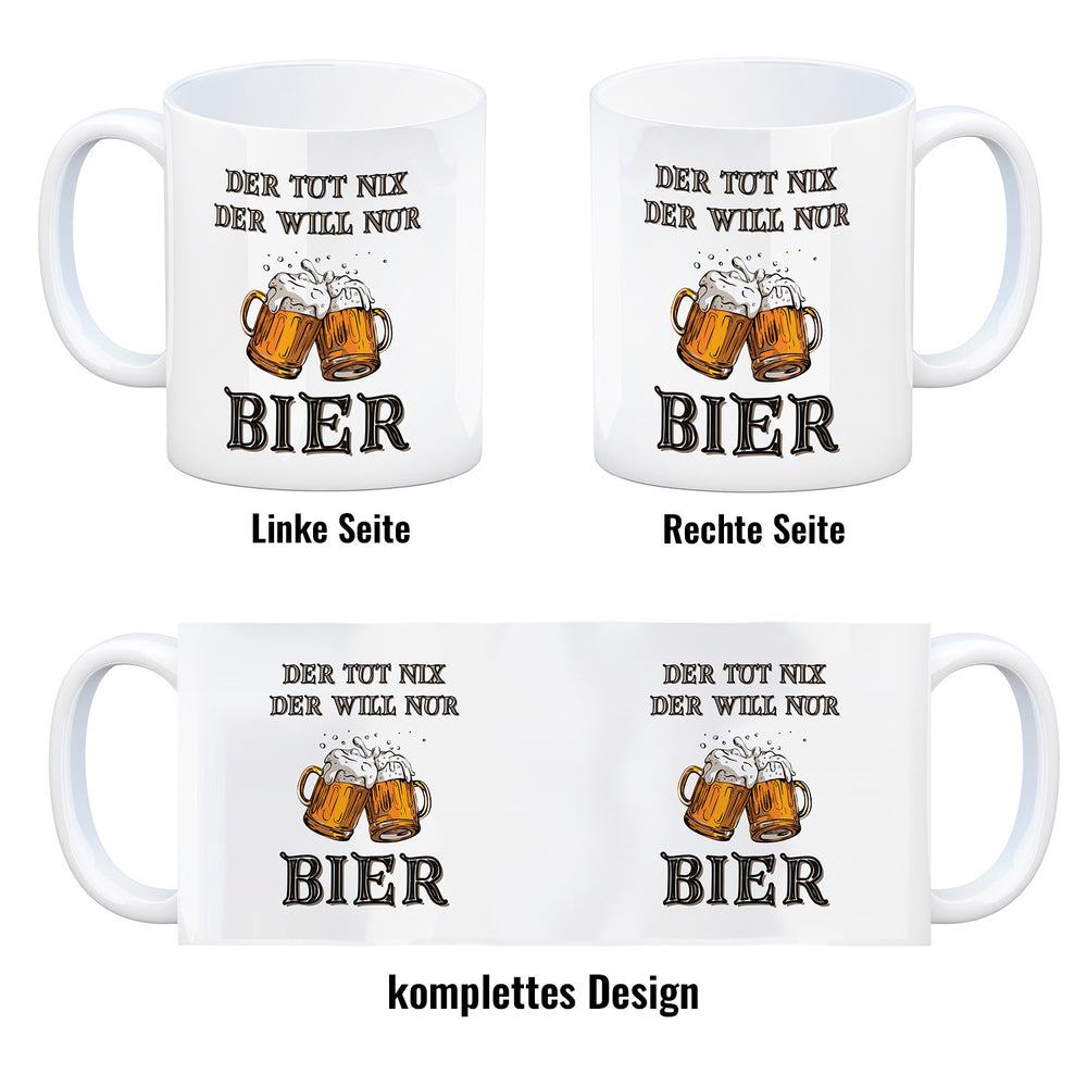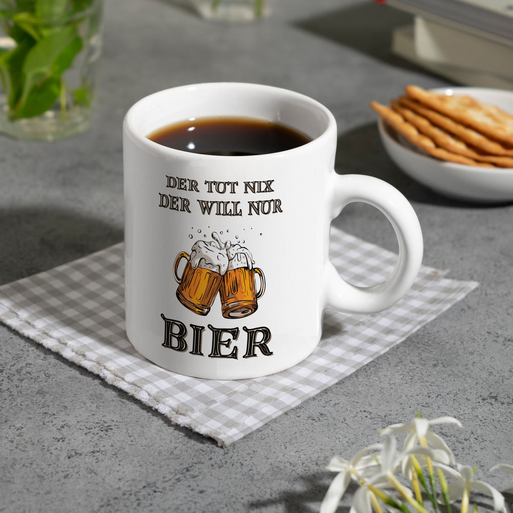 Bier Kaffeebecher mit Spruch Der tut nix der will nur Bier