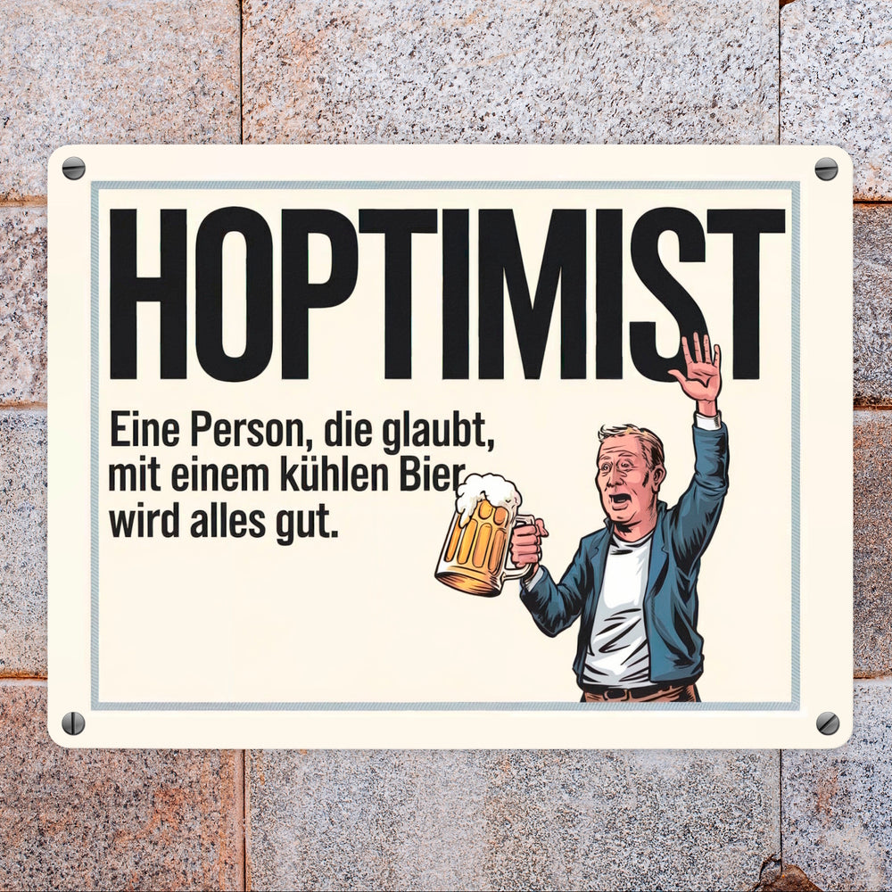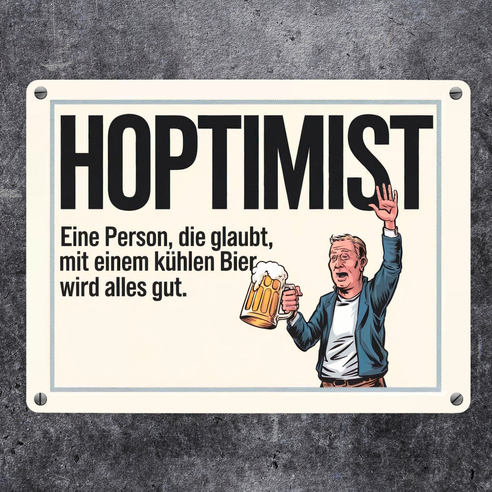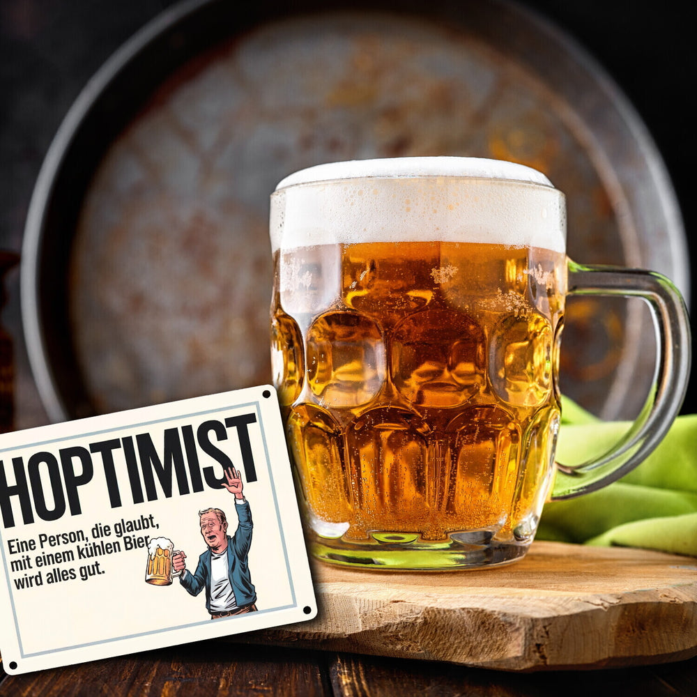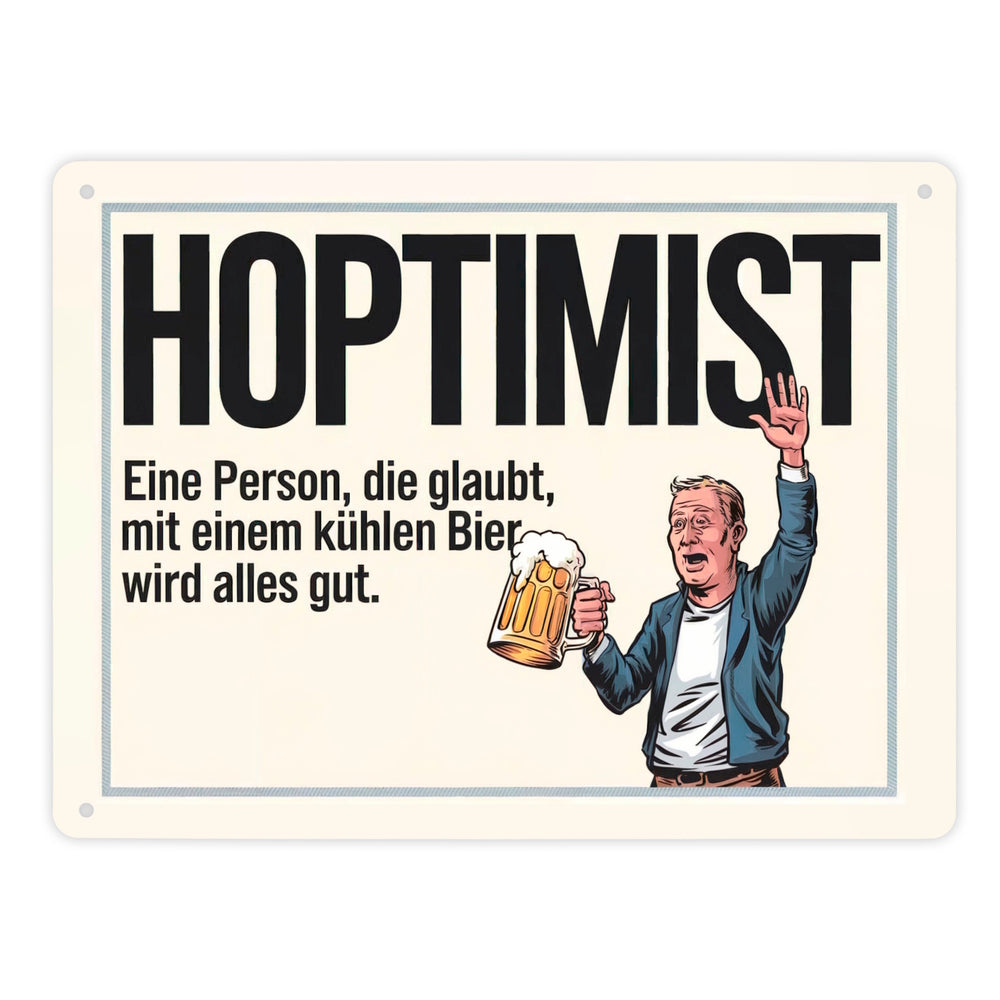 - Ob für Ihre Hausbar oder als Geschenk für Freunde, der Hoptimist bringt garantiert gute Laune und Lachanfälle. Holen Sie sich dieses humorvolle Metallschild und lassen Sie den Hoptimismus bei sich einziehen, denn – mit Bier wird wirklich alles gut!