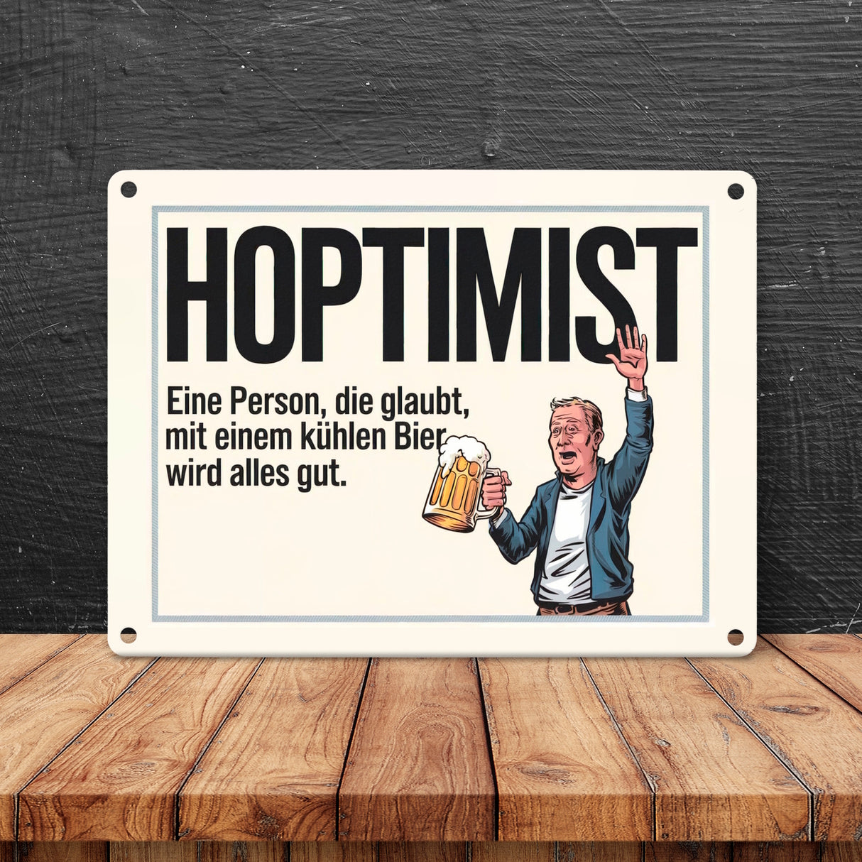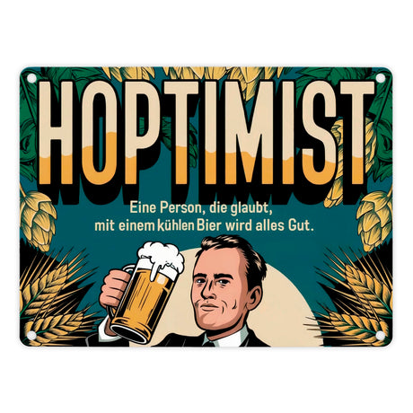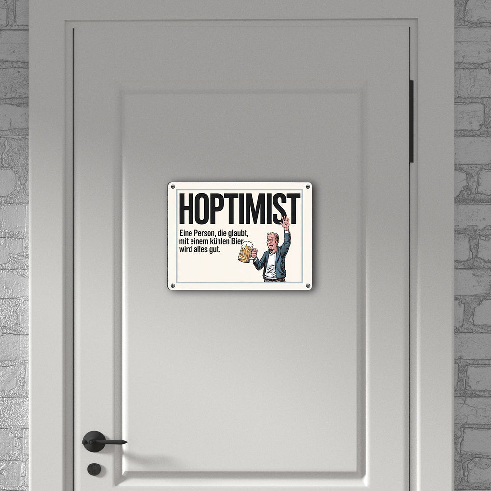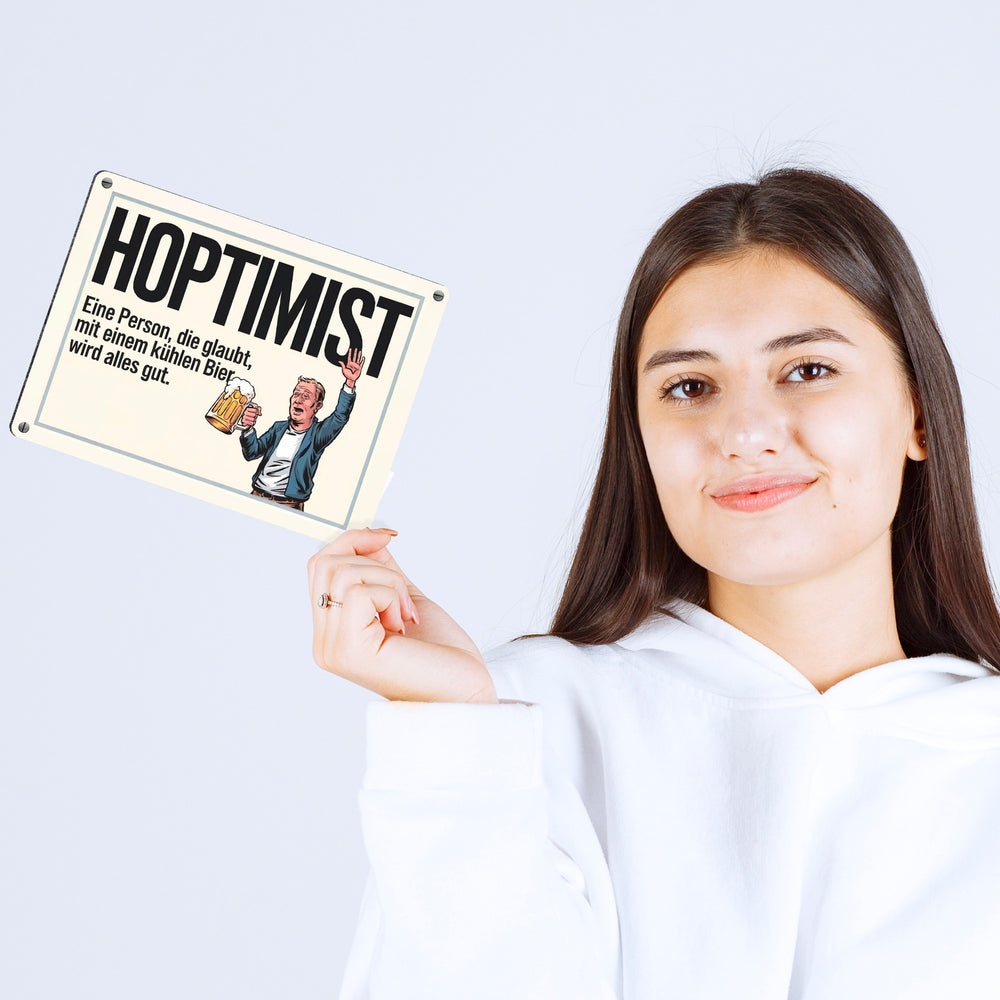 - Ob für Ihre Hausbar oder als Geschenk für Freunde, der Hoptimist bringt garantiert gute Laune und Lachanfälle. Holen Sie sich dieses humorvolle Metallschild und lassen Sie den Hoptimismus bei sich einziehen, denn – mit Bier wird wirklich alles gut!