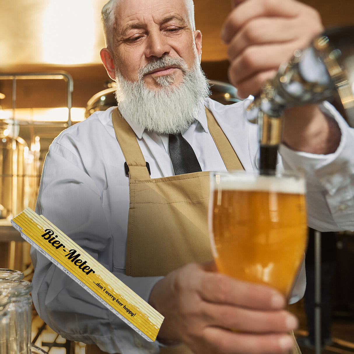 Bier-Meter don´t worry- beer happy! Meterstab aus Holz mit Bier Hintergrund