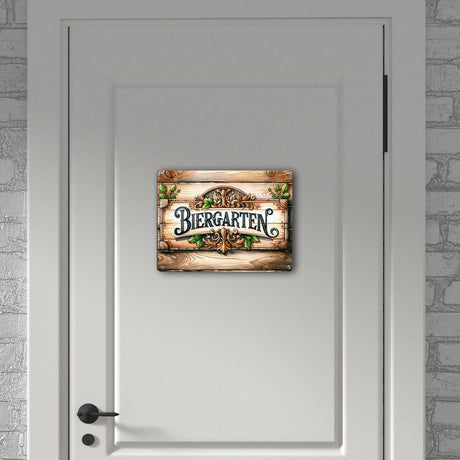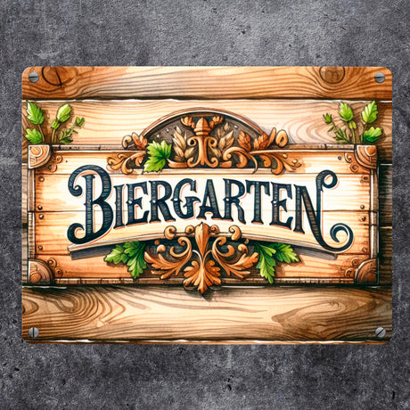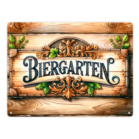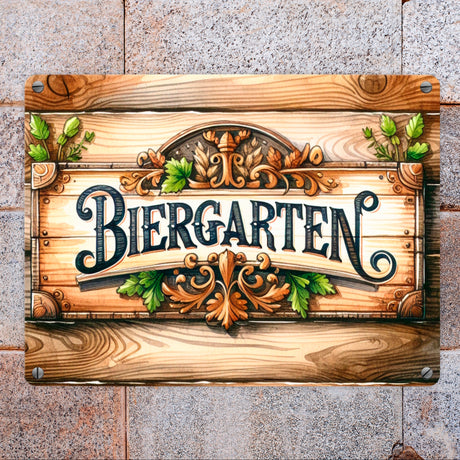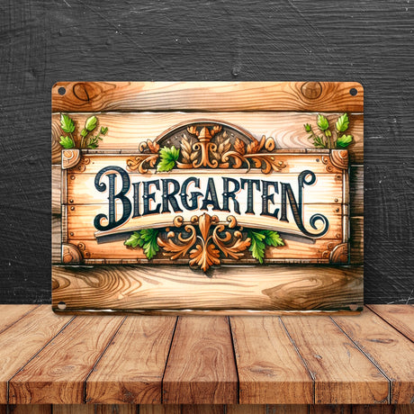 Biergarten Metallschild in Holz-Optik und Hopfen Motiv