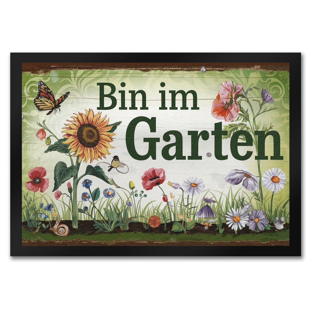- Diese Fußmatte mit Schmetterling und Blumen-Motiv ist ein echter Hingucker! Der Schmetterling schwebt elegant über der Blumenpracht, während ein frecher Vogel oben thront. Der rustikale Hintergrund und der freche Spruch 'Bin im Garten' machen sie zu einem charmanten Accessoire für jeden Eingangsbereich. Einfach zauberhaft und einladend!