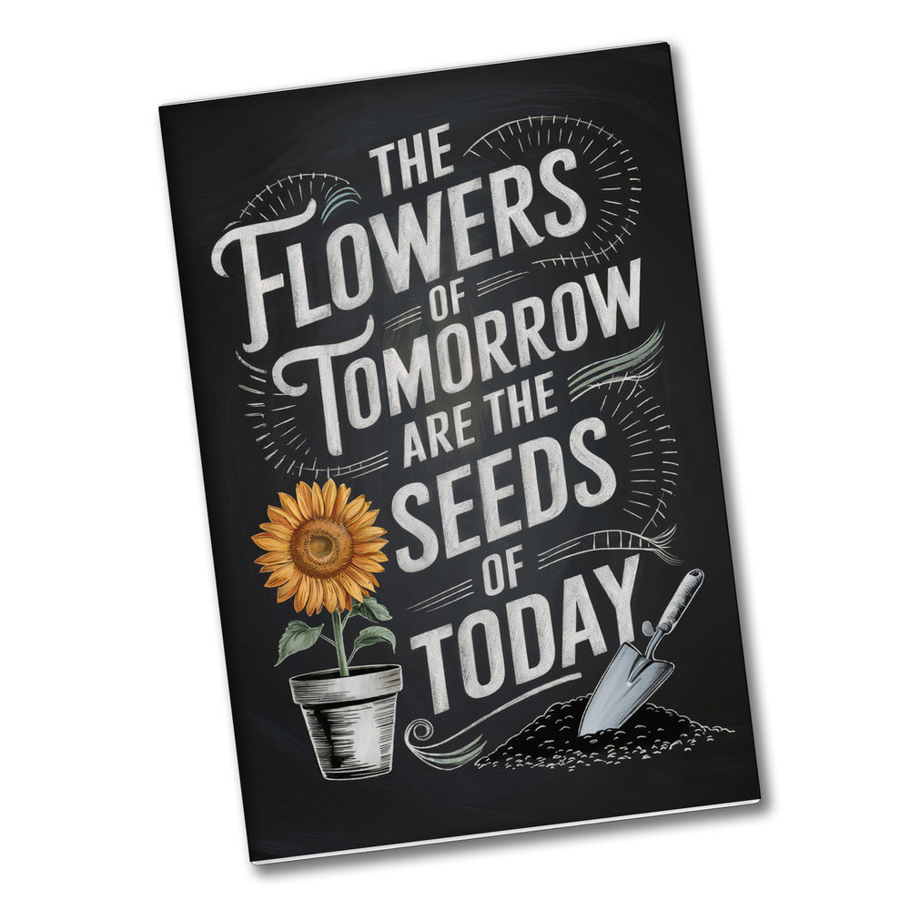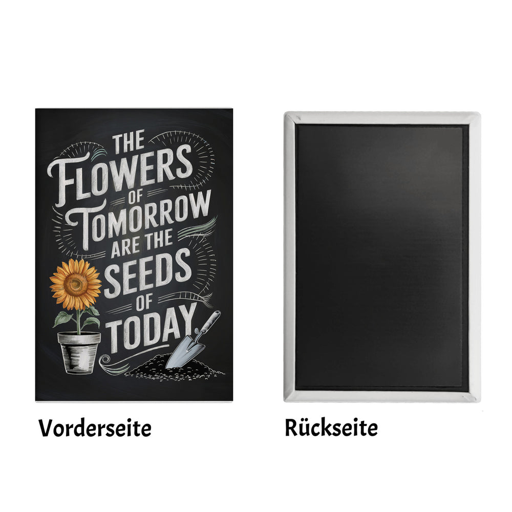 Der Magnet zeigt ein fesselndes Tafeldesign mit einem motivierenden Zitat: „The flowers of tomorrow are the seeds of today“ – umrahmt von einer lebhaften Sonnenblume, Handkelle und Erde. Das Vintage-Gefühl und die Charme-Typografie im Kontrast zur dunklen Hinweise: Größe: ca. 8x5,5 cm