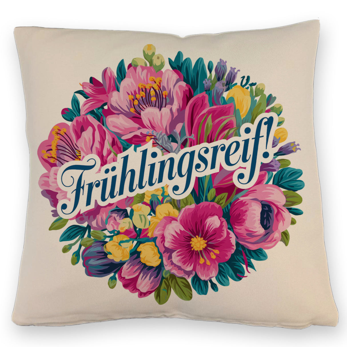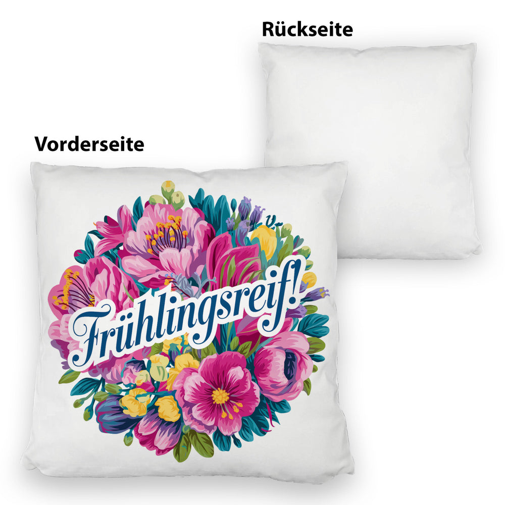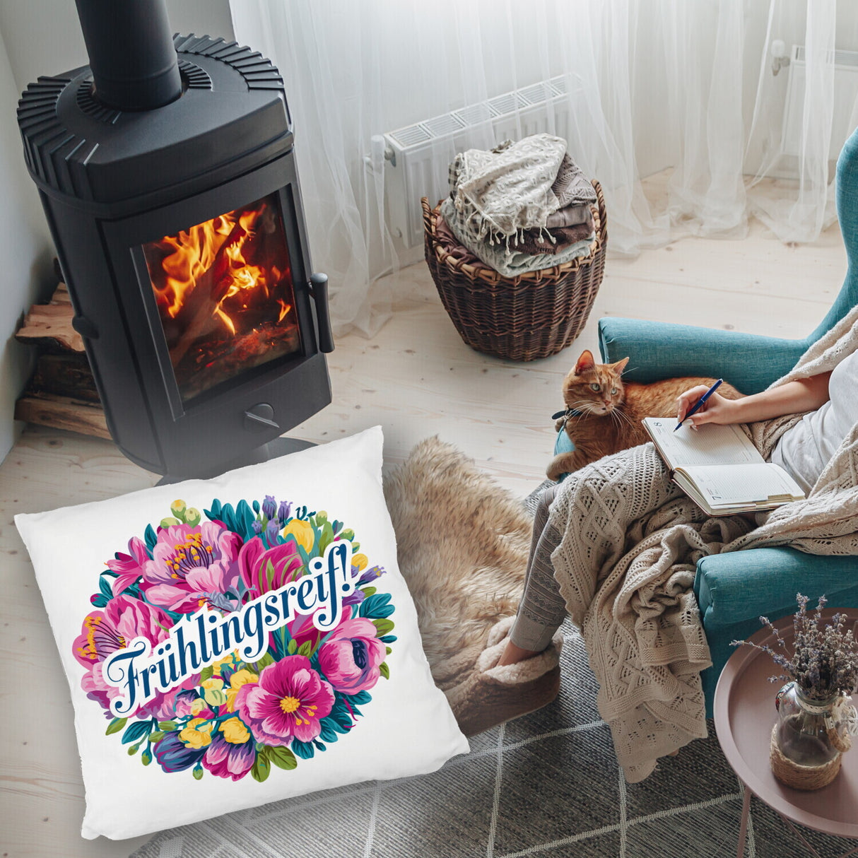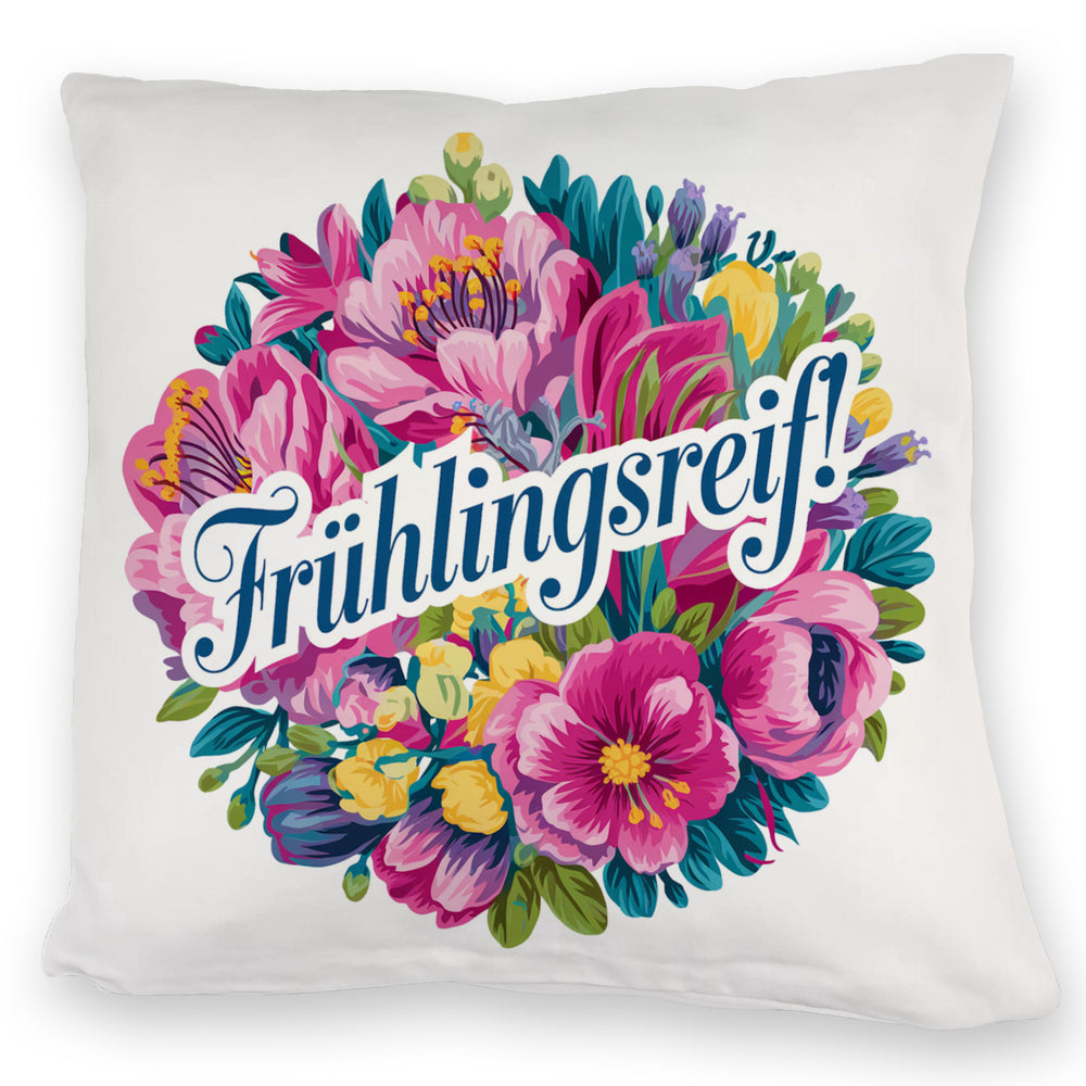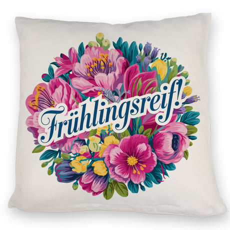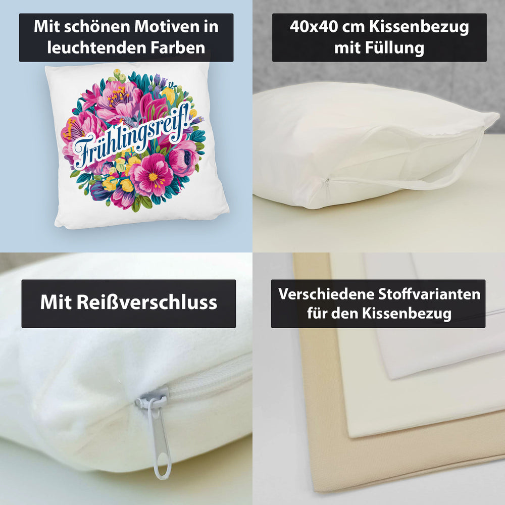 • Dieses Kissen strahlt Frühlingsgefühle aus! Mit seinem lebendigen Blumendesign und dem Schriftzug "Frühlingsreif!" auf weißem Hintergrund lässt es jeden Raum erblühen. Die detaillierten Blumen in Rosa-, Lila-, Gelb- und Grüntönen zaubern ein charmantes Flair in Ihr Zuhause. Ein Muss für alle, die den Frühling lieben!