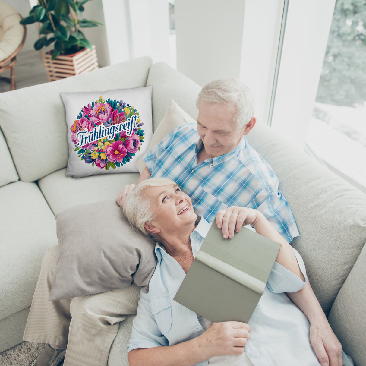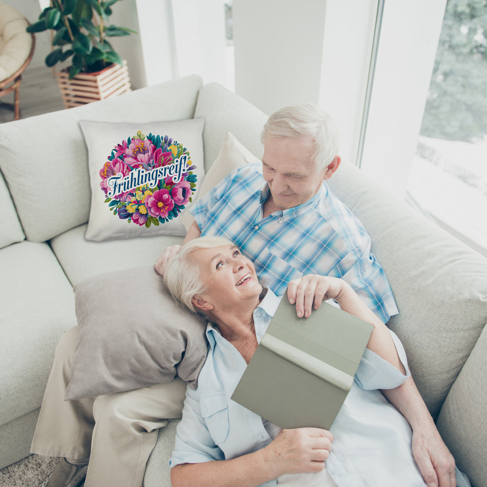 Verleihen Sie Ihrem Zuhause das gewisse Etwas mit dem Frühlingsreif Blumendesign Kissen! Dieses bezaubernde Accessoire bringt den Frühlingszauber direkt in Ihr Wohnzimmer und zaubert jedem Betrachter ein Lächeln ins Gesicht. Mit einem lebendigen Blumendesign in zarten Rosa-, Lila-, Gelb- und Grüntönen ist dieses Kissen ein wahrer Augenschmaus und sorgt für frischen Wind in Ihren vier Wänden. Der charmante Schriftzug „Frühlingsreif!“ verleiht ihm eine humorvolle Note und macht es zum idealen Gesprächsstarter.Erhältlich in verschiedenen Ausführungen – von der Standardversion über ein extra-flauschiges Kuschelkissen bis hin zur edlen Leinenoptik – passt es perfekt zu jedem Einrichtungsstil. Hergestellt in unserer Kissenmanufaktur in Deutschland, garantiert es höchste Qualität und eine langlebige Farbpracht.Ob für die Gartenparty, als fröhlicher Farbtupfer auf dem Sofa oder kuschelig beim Lesen, dieses Multitalent bringt stets positive Vibes und Komfort. Schenken Sie es Ihren Liebsten oder gönnen Sie sich selbst eine kleine Freude und verabschieden Sie den Winterblues. Dieses Kissen ist nicht nur ein dekorativer Hingucker, sondern sorgt auch für eine Portion Glück und Fröhlichkeit in Ihrem Zuhause. Holen Sie sich jetzt Ihr Stück Frühling ins Haus!