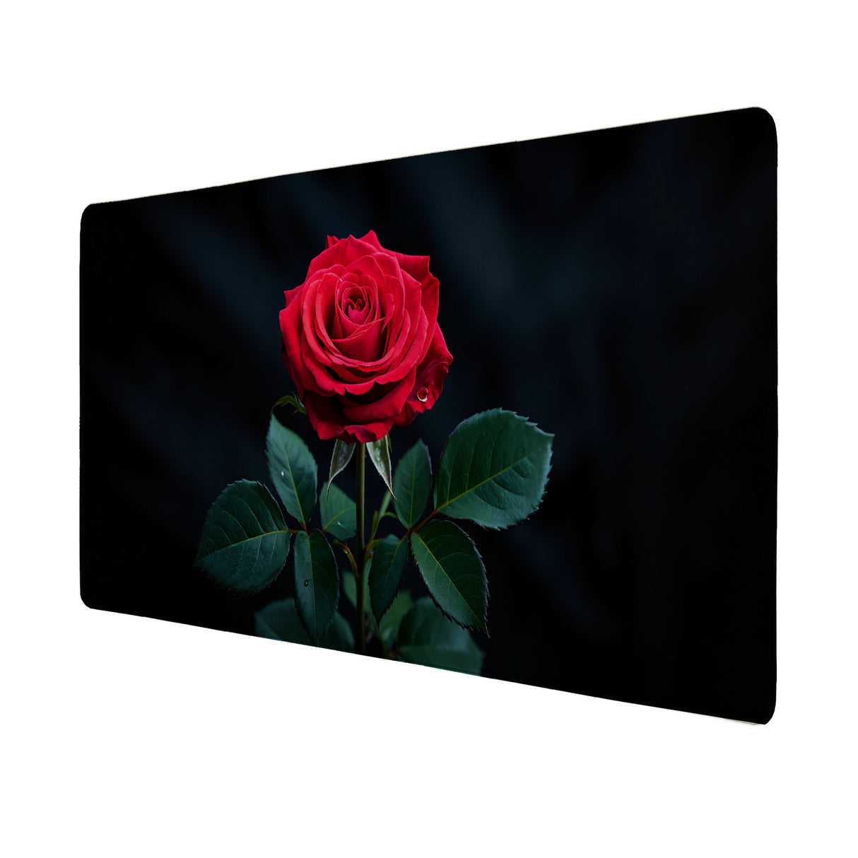 - Die leuchtend rote Rose auf dieser Schreibtischunterlage thront majestätisch im Zentrum eines tiefschwarzen Hintergrunds. Die samtigen Blütenblätter mit einem zarten Tautropfen und die üppigen grünen Blätter verleihen dem Motiv eine unvergleichliche Eleganz. Der Kontrast zum Hintergrund bringt die Farben besonders zur Geltung.