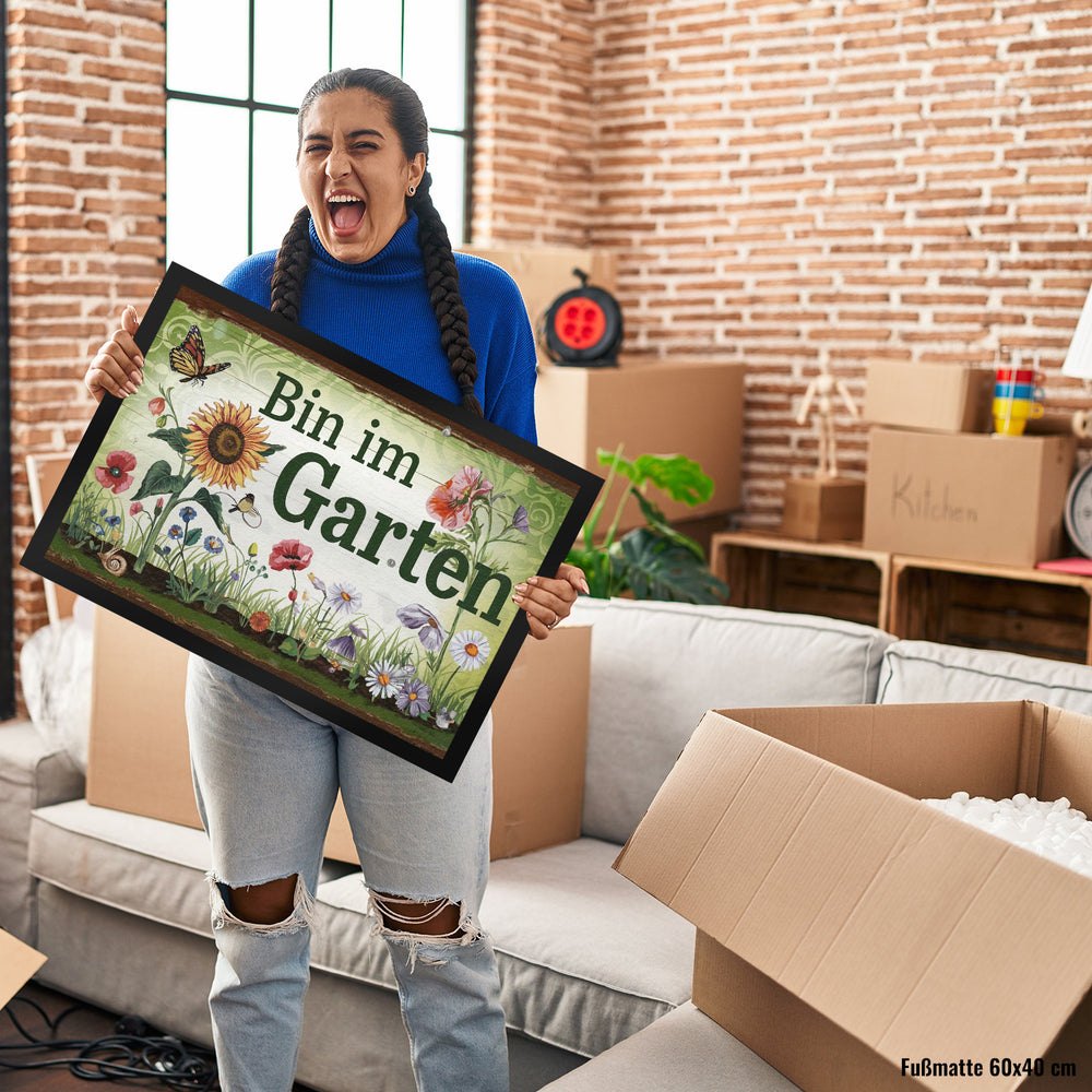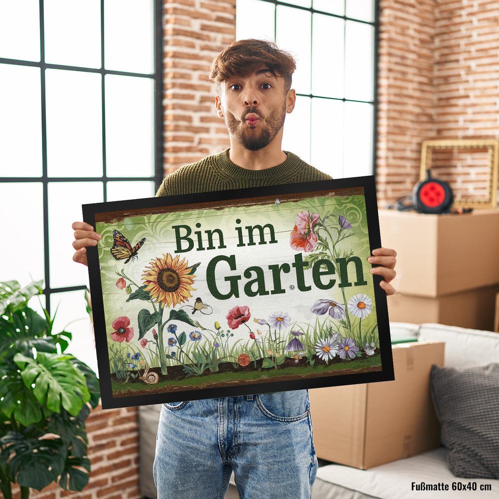 Werten Sie Ihren Eingangsbereich mit unserer charmanten Bin im Garten Schmetterling und Blumen Fußmatte auf! Diese zauberhafte Matte vereint Humor, Funktionalität und Ästhetik in einem stilvollen Design. Die aus wetterfesten Materialien gefertigte Fußmatte zeigt einen eleganten Schmetterling, der anmutig über einer farbenfrohen Blumenlandschaft schwebt, während ein frecher Vogel neugierig die Szene beobachtet. Mit ihrem rustikalen Hintergrund und dem reizvollen Spruch Bin im Garten strahlt diese Fußmatte einen einzigartigen Charme aus, der Ihre Verbundenheit zur Natur unterstreicht.Erhältlich in den Größen 50x35cm, 60x40cm und 75x50cm, überzeugt diese Matte mit ihrer rutschfesten Gummiunterseite und pflegeleichten Kunstfaser. Herzlich in einer deutschen Fußmatten-Manufaktur hergestellt, ist sie das perfekte Geschenk für Gartenliebhaber und Hobbygärtner. Ihre bunten Farben bringen das ganze Jahr über einen Hauch von Frühling und Sommer in Ihr Zuhause und halten gleichzeitig Staub und Schmutz fern.Lassen Sie Ihre Gäste herzlich wissen, dass sie Sie mit größter Wahrscheinlichkeit draußen, umgeben von Ihrem grünen Kleinod, finden werden! Diese Fußmatte ist nicht nur ein praktischer Schutz für Ihren Eingangsbereich, sondern auch ein persönliches Statement für Naturfreunde, das jedem Besucher ein Lächeln ins Gesicht zaubert.
