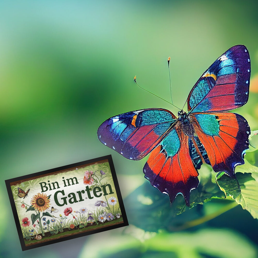 Bin im Garten Metallschild in 15x20 cm mit Schmetterling und Blumen