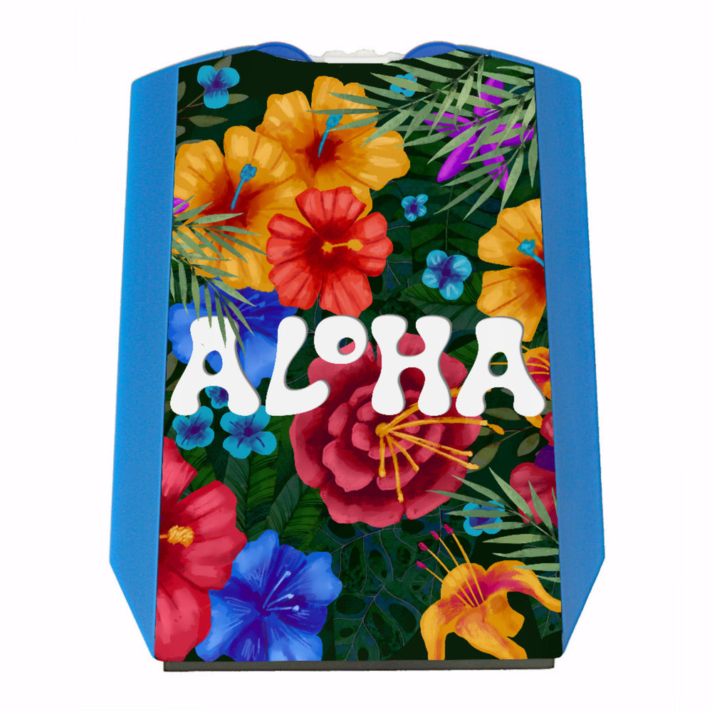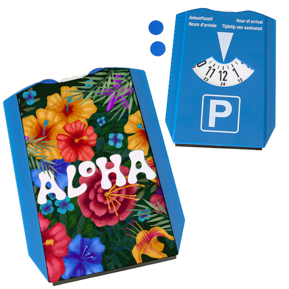 Blumenmotiv mit Aloha Schriftzug Parkscheibe mit zwei Einkaufswagenchips
