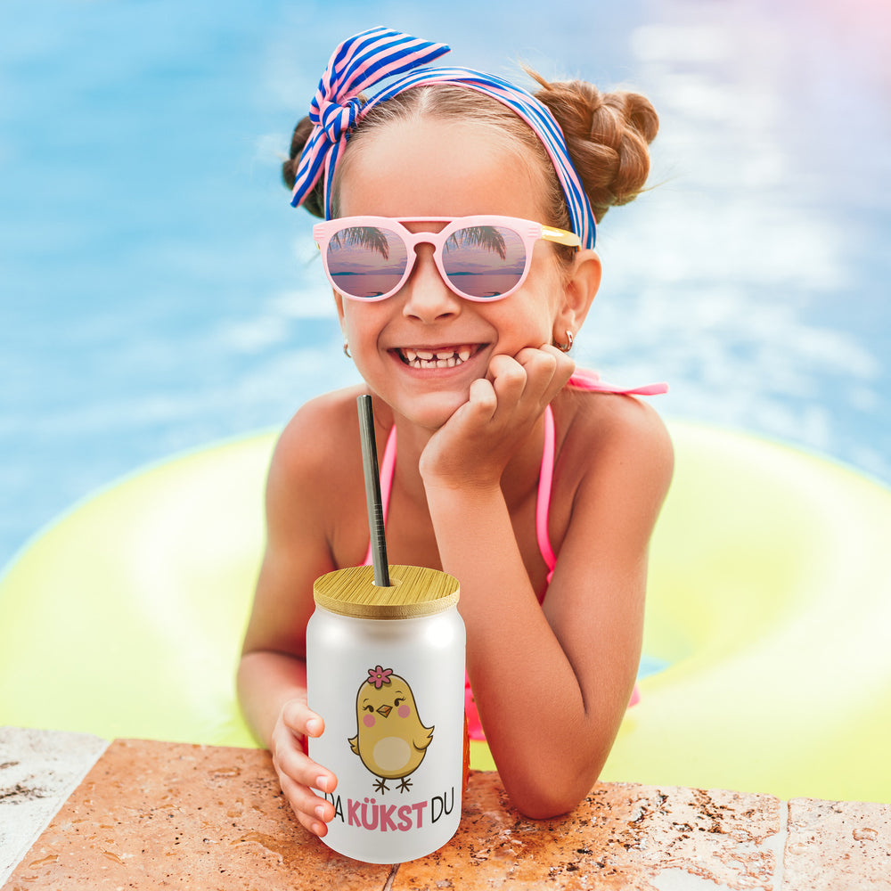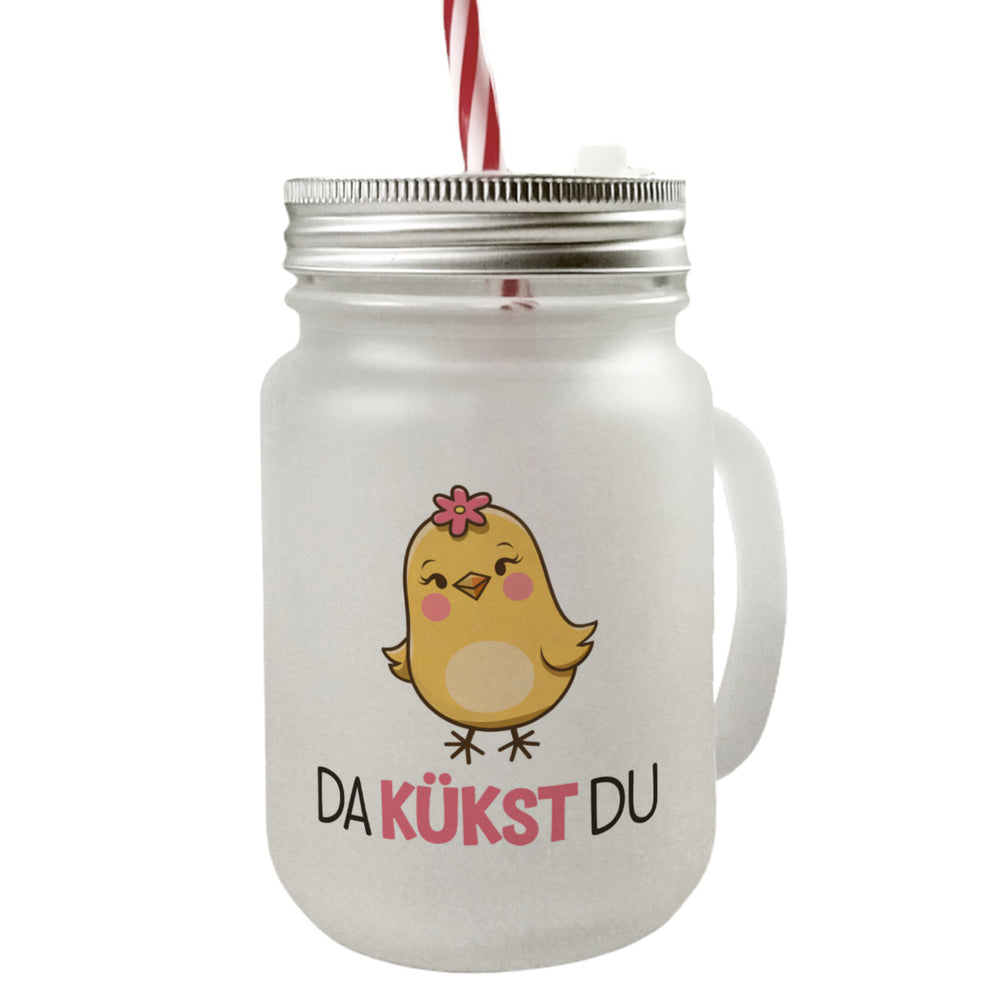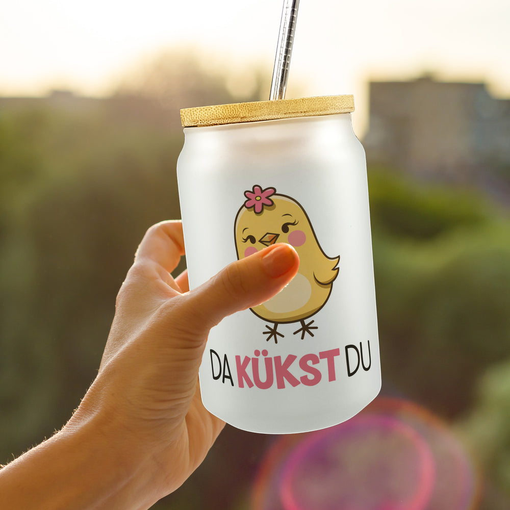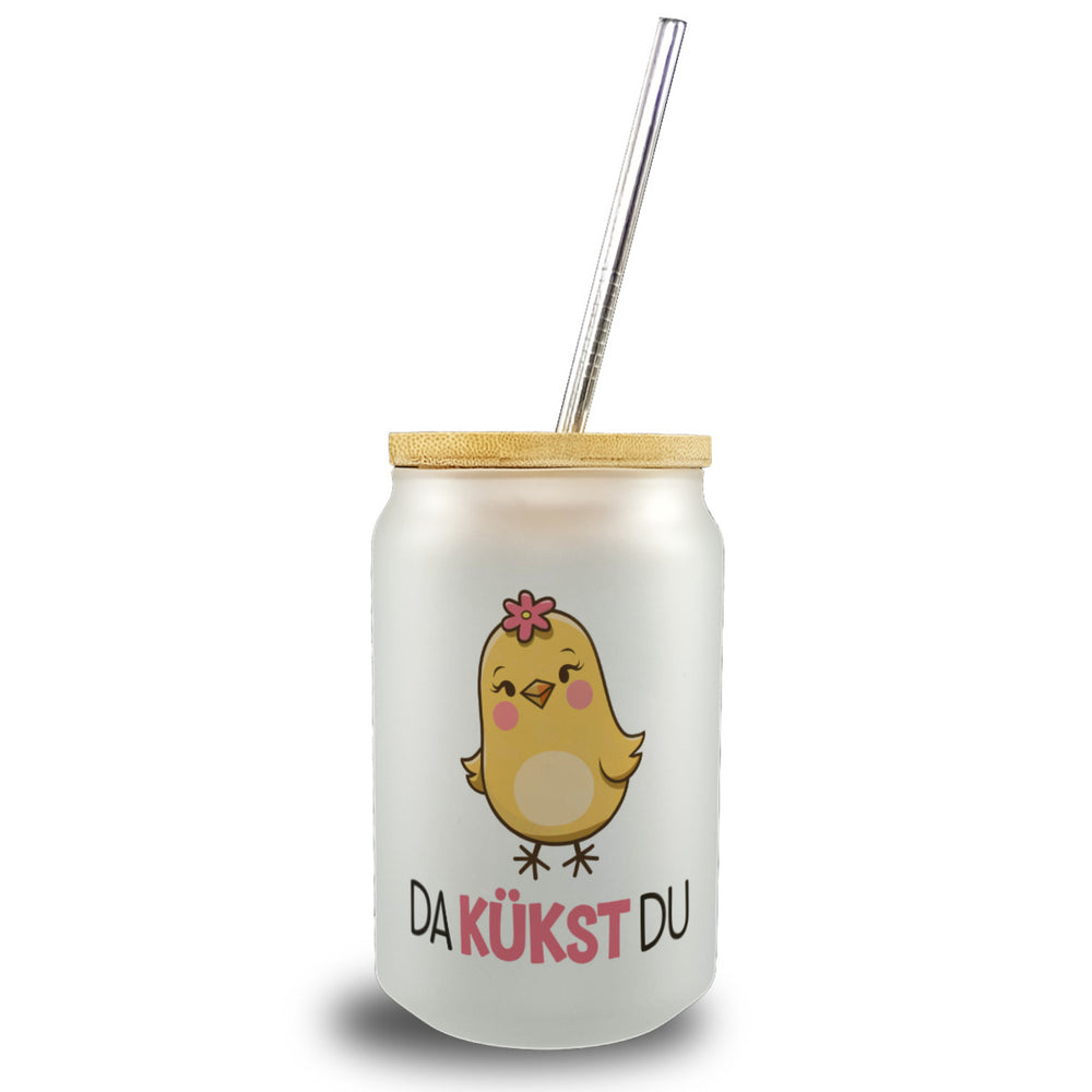 • 1x Cartoon Küken DA KÜKST DU Trinkglas mit Bambusdeckel mit Bambusdeckel oder Henkel