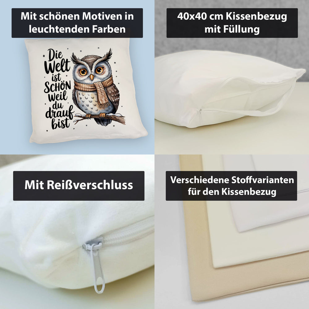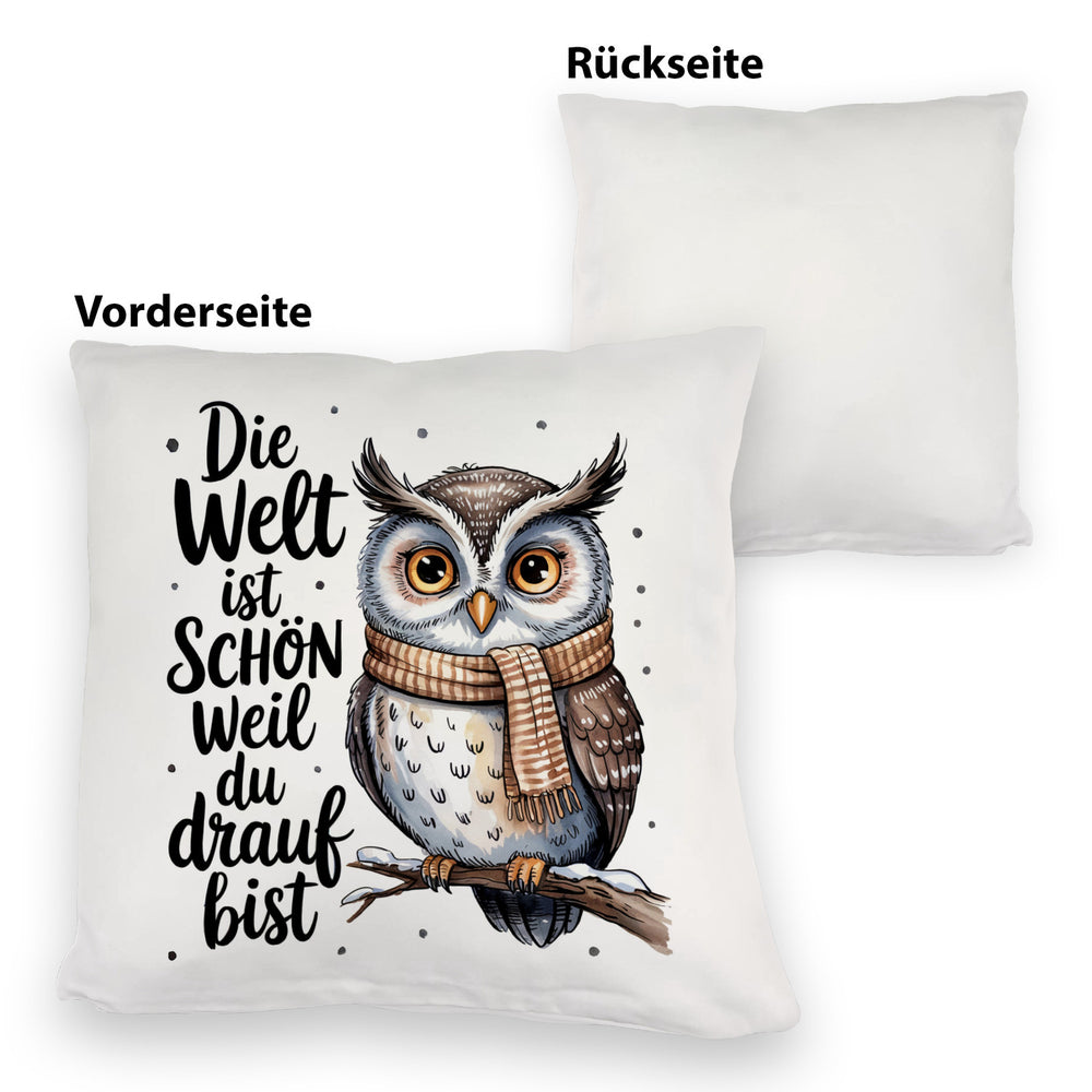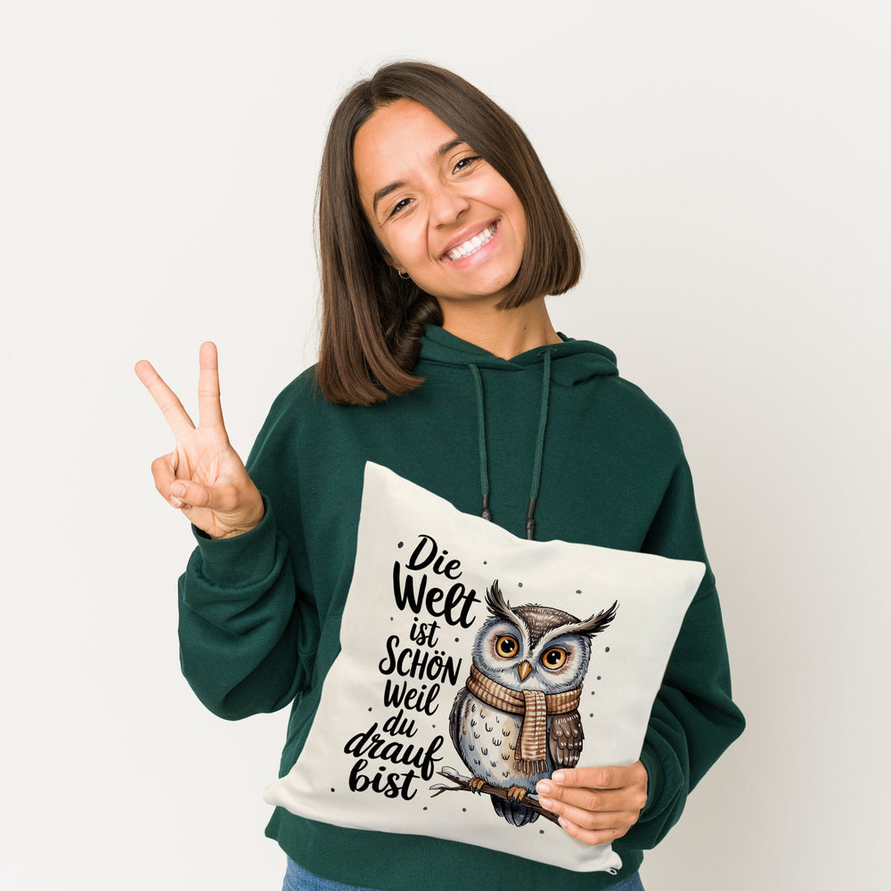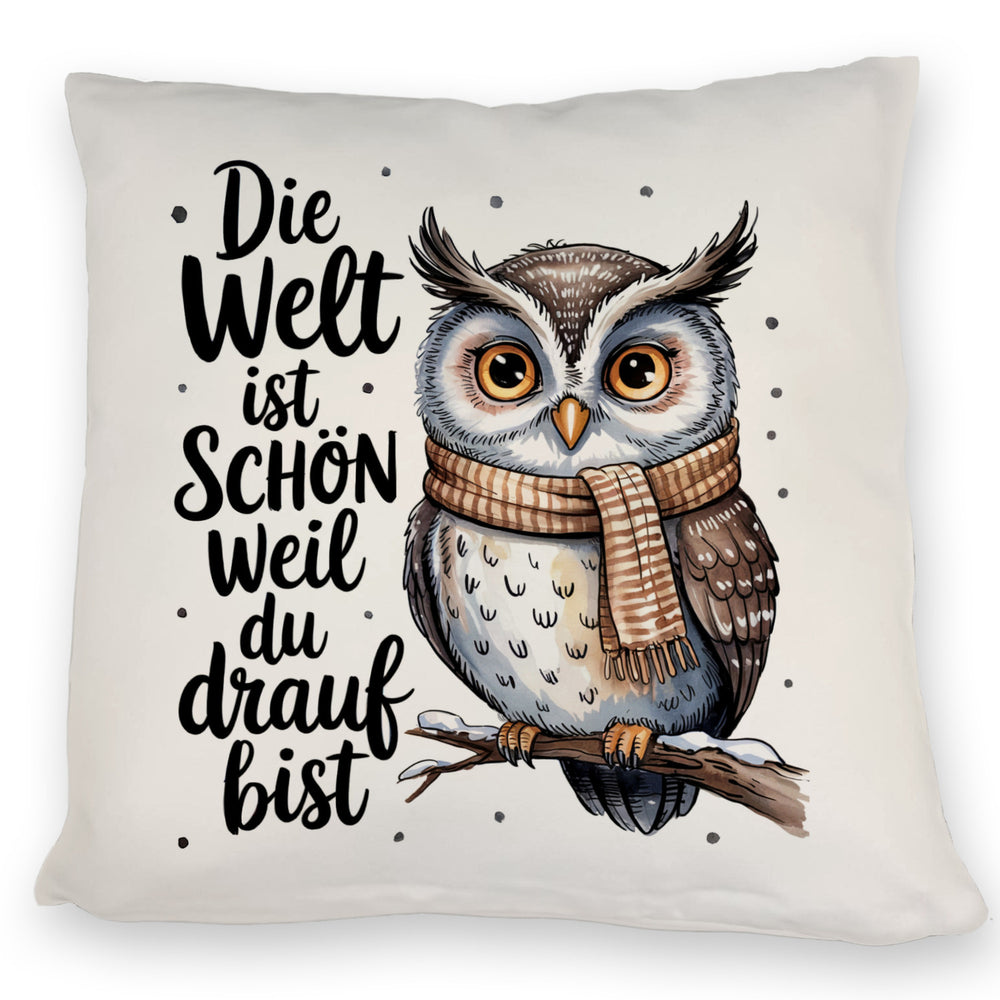 - Dieses bezaubernde Kissen zeigt eine niedliche Eule in Aquarellillustration, die einen beige gestreiften Schal trägt und mit großen, bernsteinfarbenen Augen auf einem schneebedeckten Ast sitzt. Der Text "DIE WELT IST SCHÖN WEIL DU drauf BIST" verleiht dem Motiv eine persönliche Note. Perfekt für jede Winterdeko und mit Handlettering versehen.